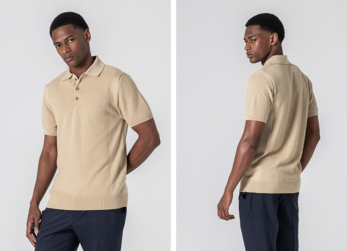 Polo em tricot estruturado, produzido com uma mistura de 67% liocel e 33% algodão, uma combinação pensada para garantir leveza, respirabilidade e um toque naturalmente fresco. A textura subtil confere profundidade à peça e os acabamentos reforçam o seu carácter: colarinho com três botões, mangas com ribe canelado e base ajustada. Um essencial para os dias mais quentes.