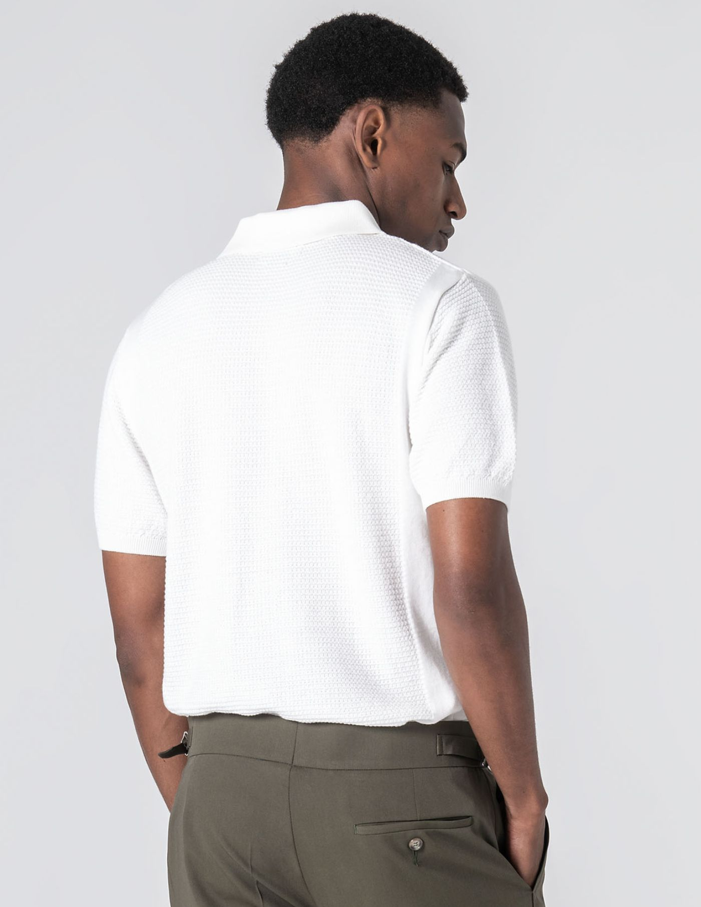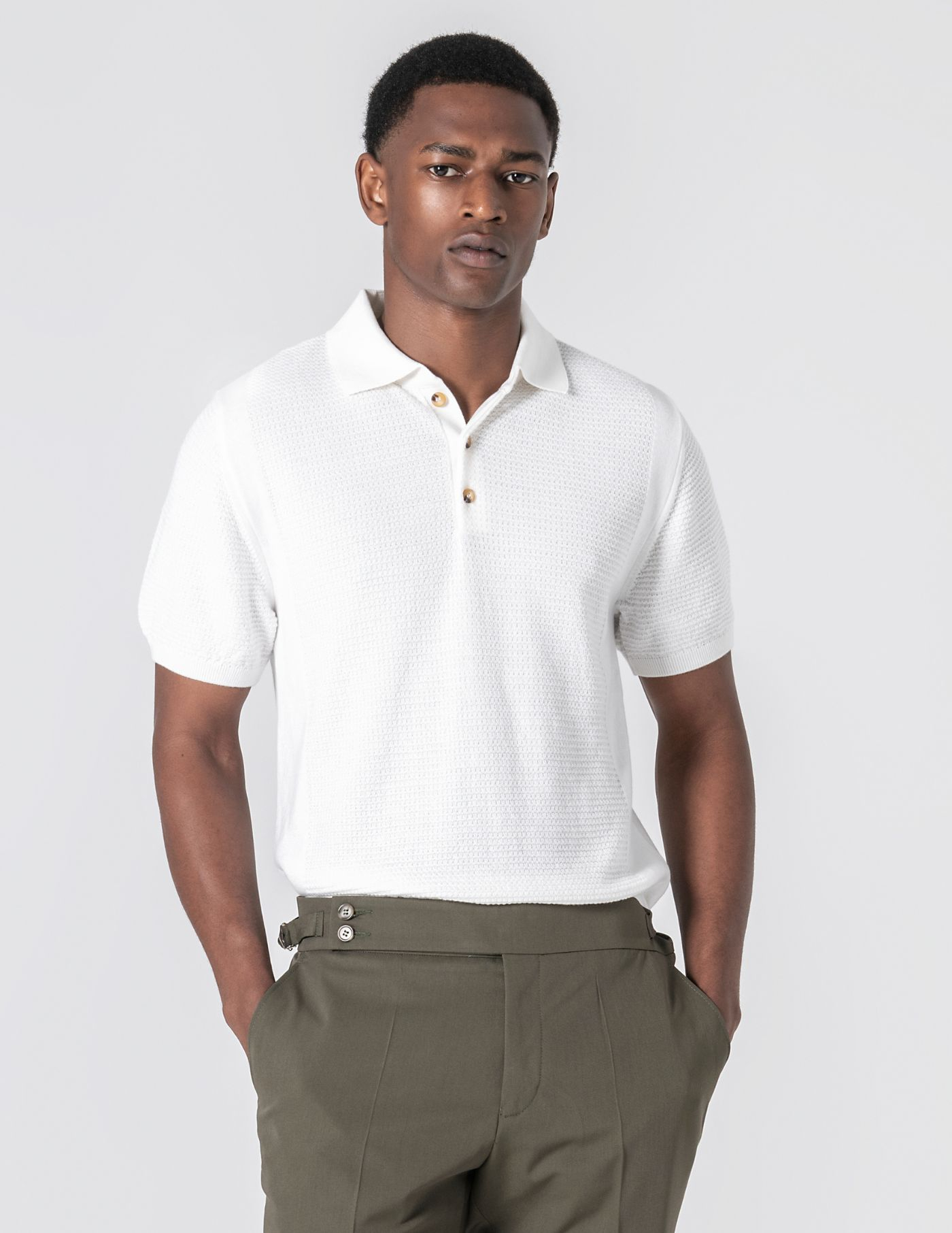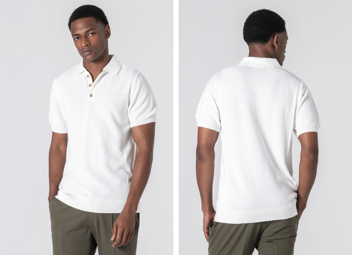 Polo em tricot estruturado, produzido com uma mistura de 67% liocel e 33% algodão, uma combinação pensada para garantir leveza, respirabilidade e um toque naturalmente fresco. A textura subtil confere profundidade à peça e os acabamentos reforçam o seu carácter: colarinho com três botões, mangas com ribe canelado e base ajustada. Um essencial para os dias mais quentes.