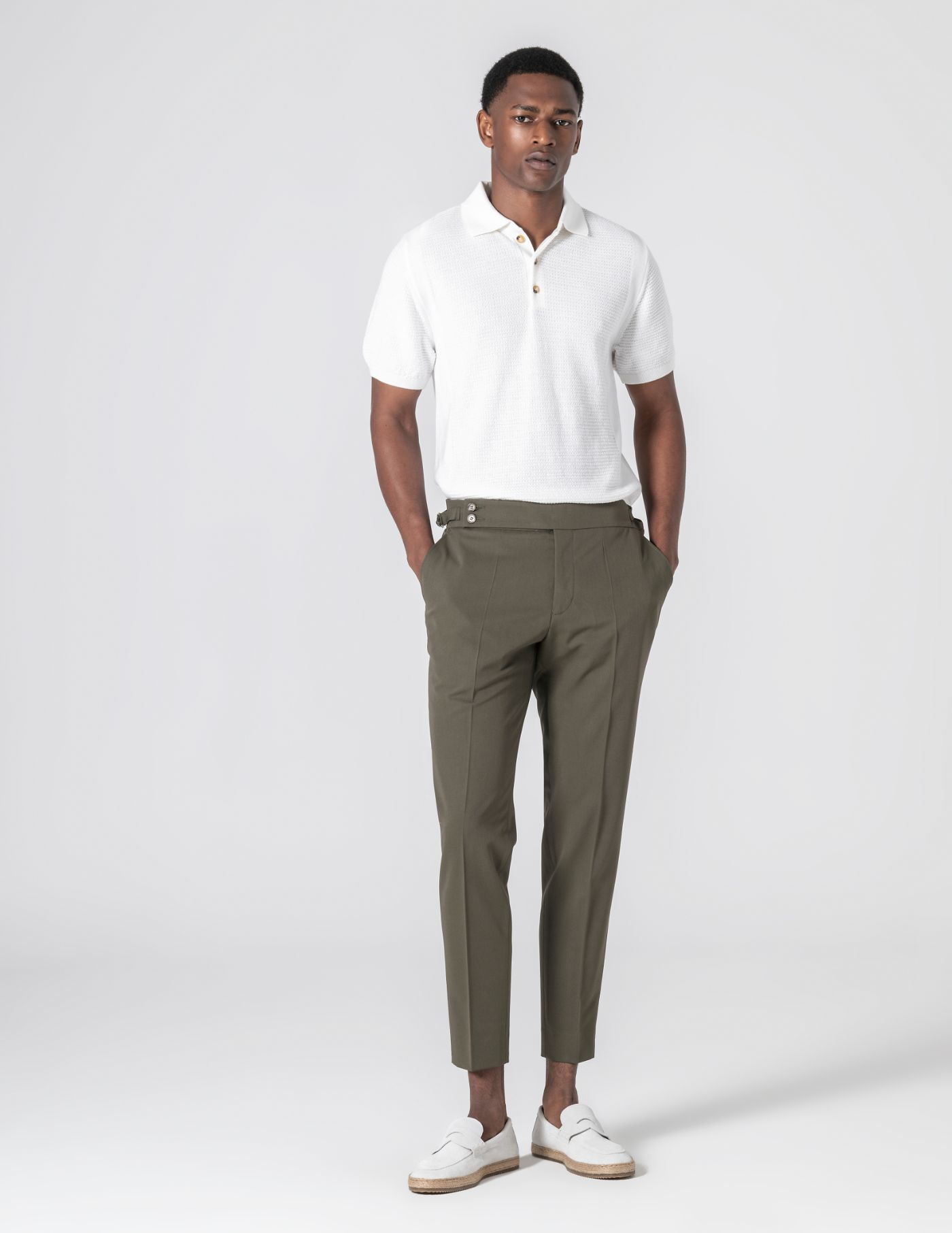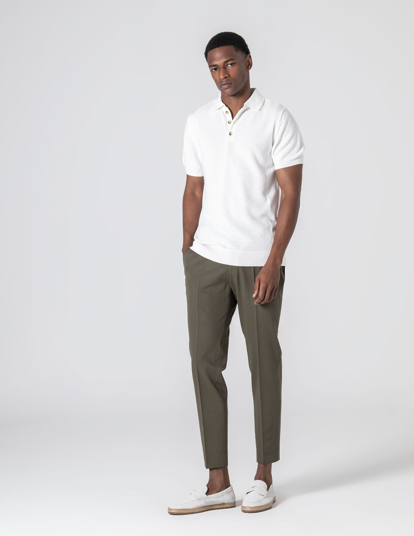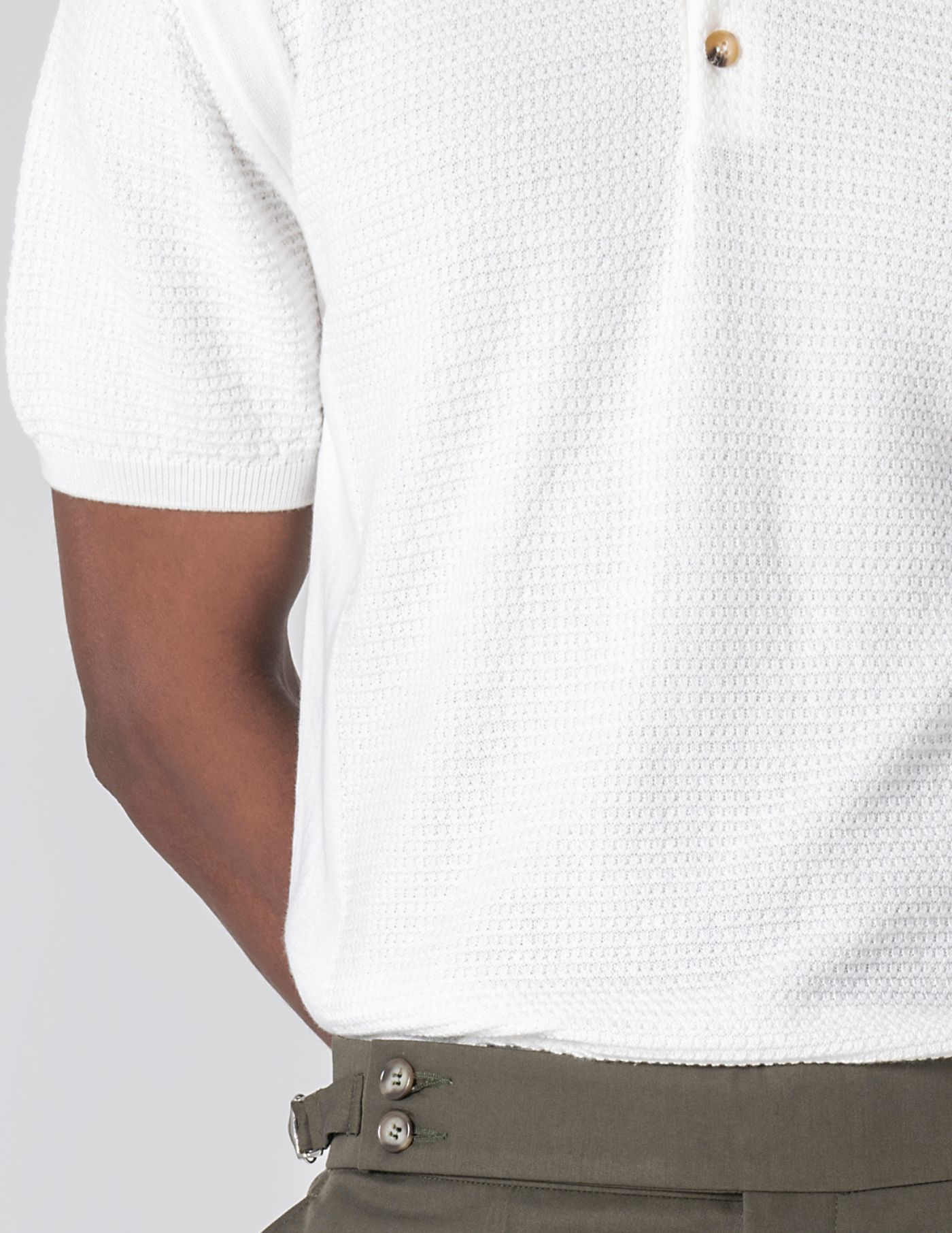 Polo em tricot estruturado, produzido com uma mistura de 67% liocel e 33% algodão, uma combinação pensada para garantir leveza, respirabilidade e um toque naturalmente fresco. A textura subtil confere profundidade à peça e os acabamentos reforçam o seu carácter: colarinho com três botões, mangas com ribe canelado e base ajustada. Um essencial para os dias mais quentes.