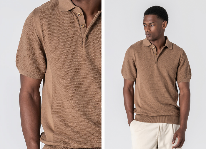 Polo em tricot estruturado, produzido com uma mistura de 67% liocel e 33% algodão, uma combinação pensada para garantir leveza, respirabilidade e um toque naturalmente fresco. A textura subtil confere profundidade à peça e os acabamentos reforçam o seu carácter: colarinho com três botões, mangas com ribe canelado e base ajustada. Um essencial para os dias mais quentes.
