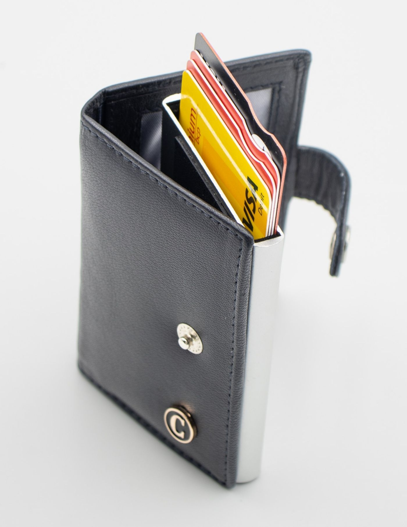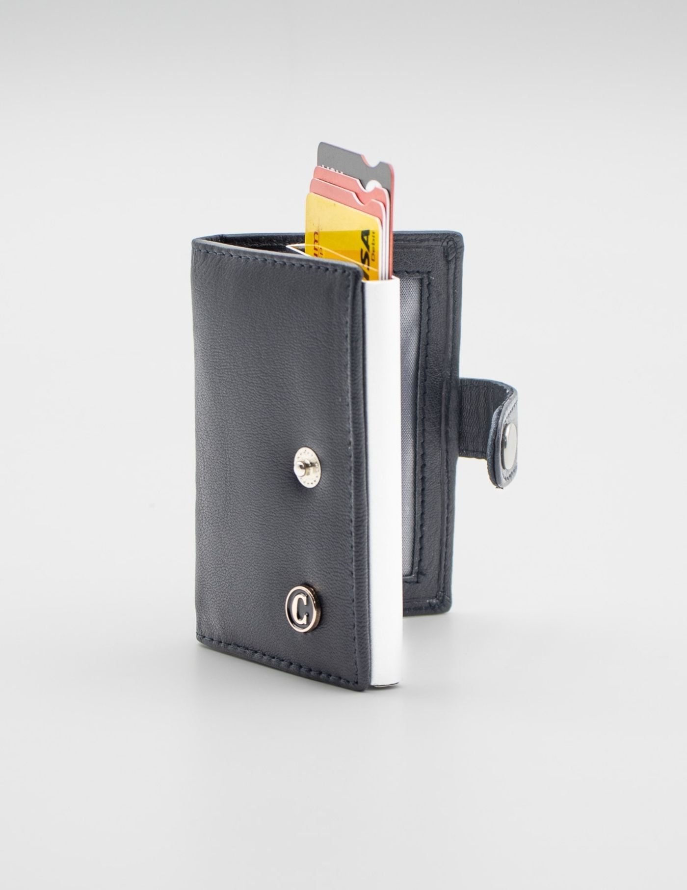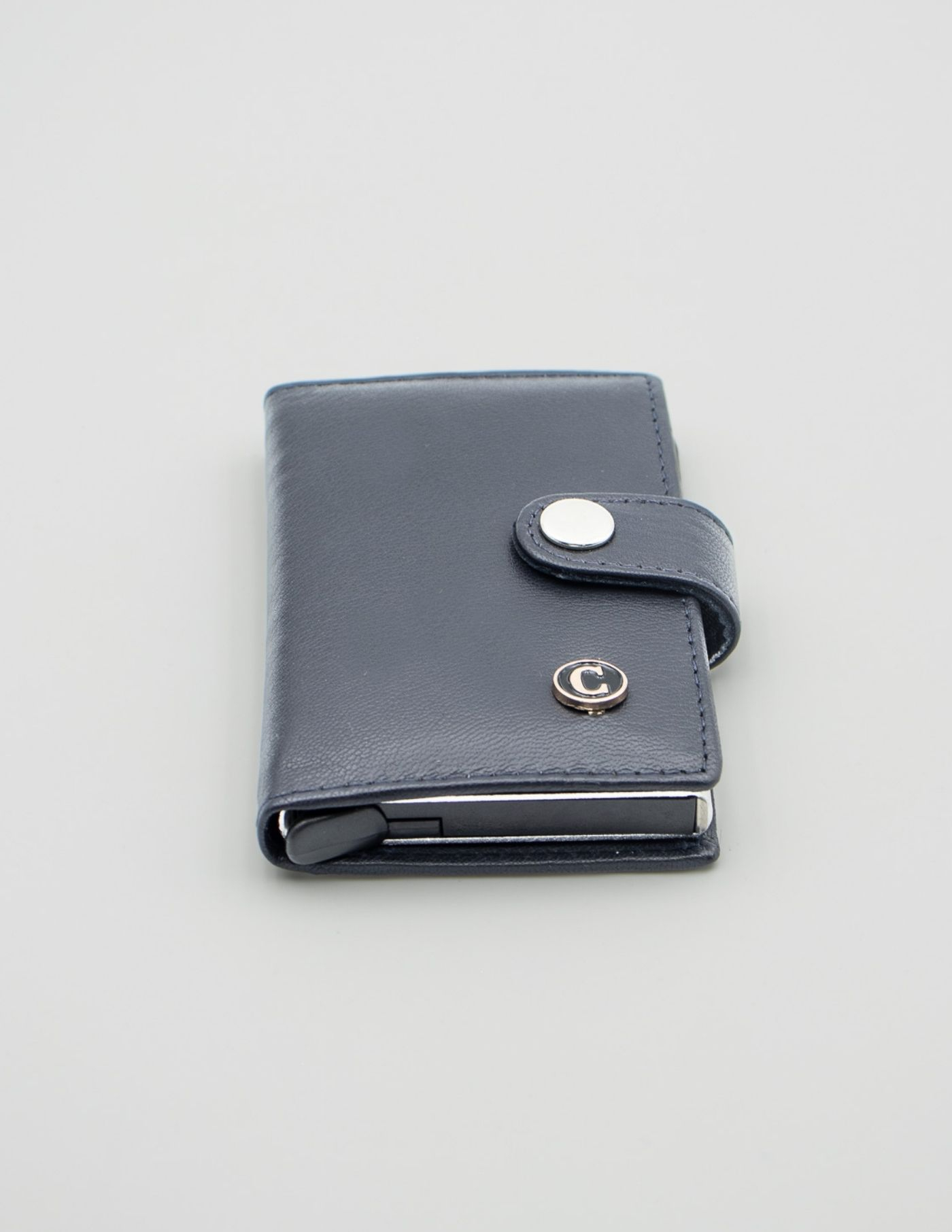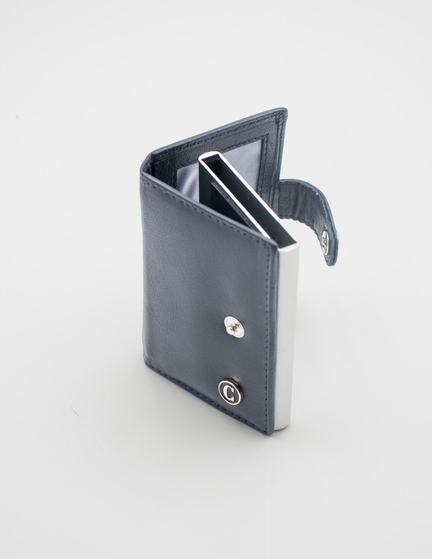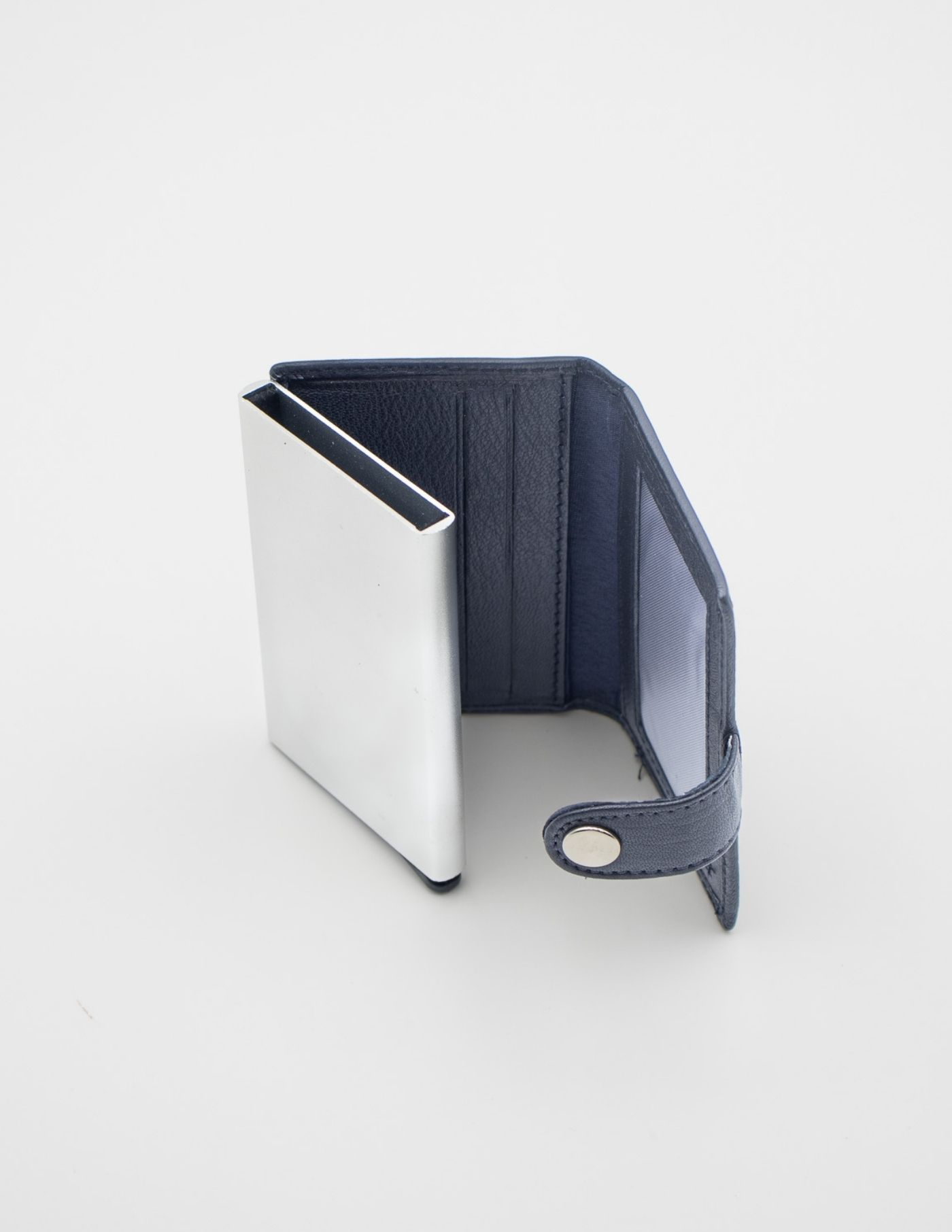 Porta cartões e notas azul, em pele, com compartimento interior em aço inoxidável. Ideal para transportar cartões e notas. Desenhado com uma discreta avalanca que permite retirar e guardar os cartões.