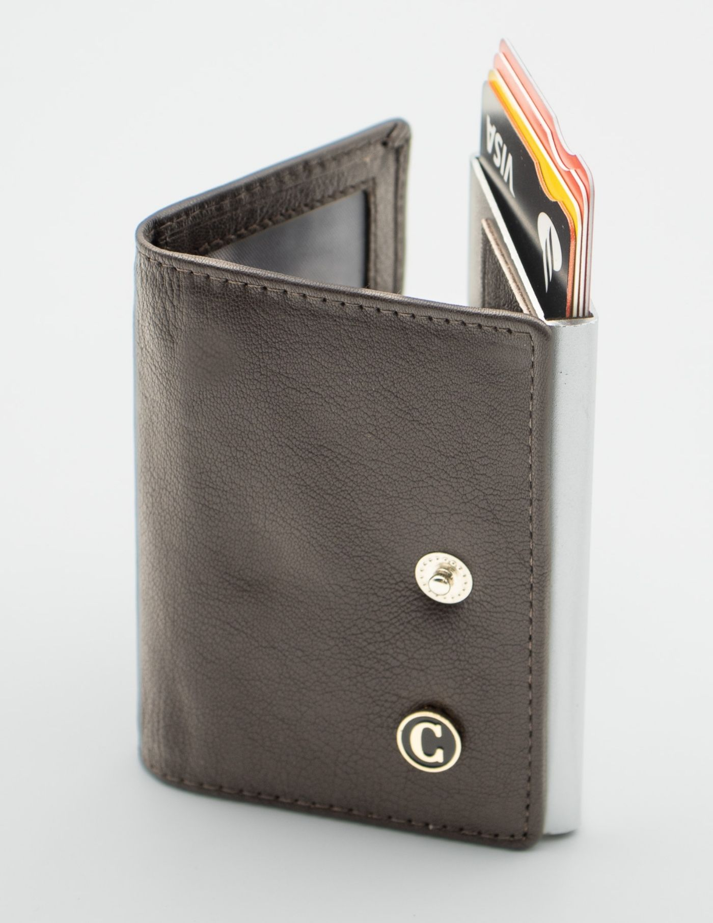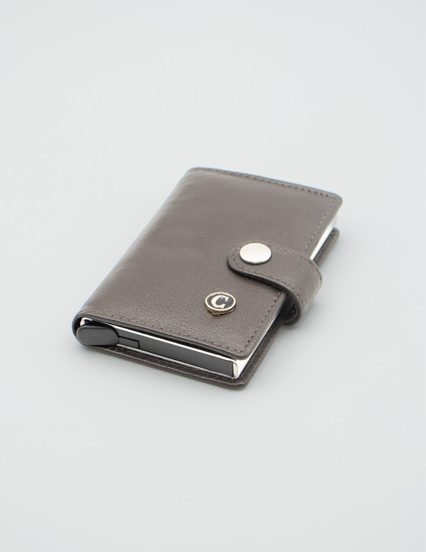 Porta cartões e notas castanho escuro, em pele, com compartimento interior em aço inoxidável. Ideal para transportar cartões e notas. Desenhado com uma discreta avalanca que permite retirar e guardar os cartões.