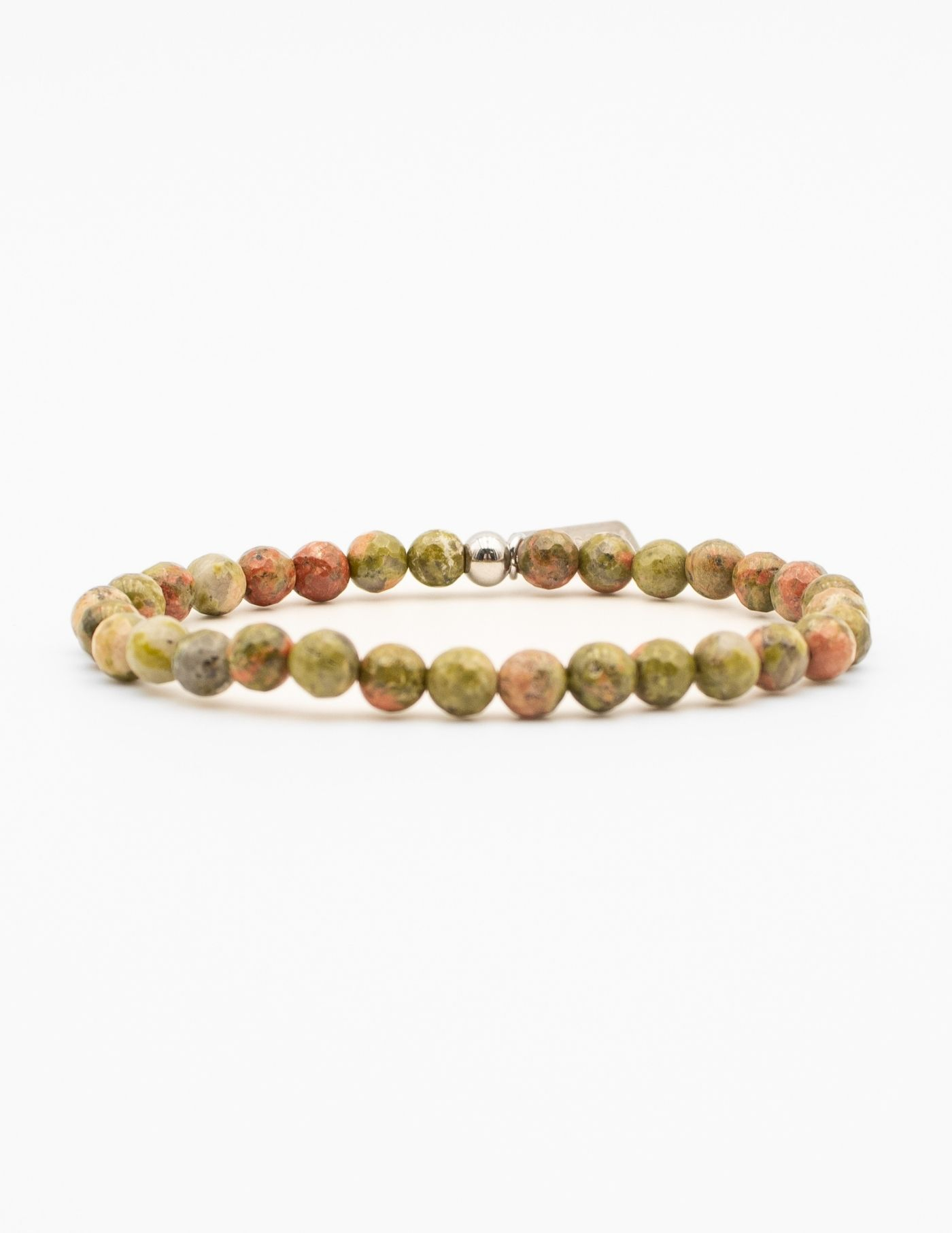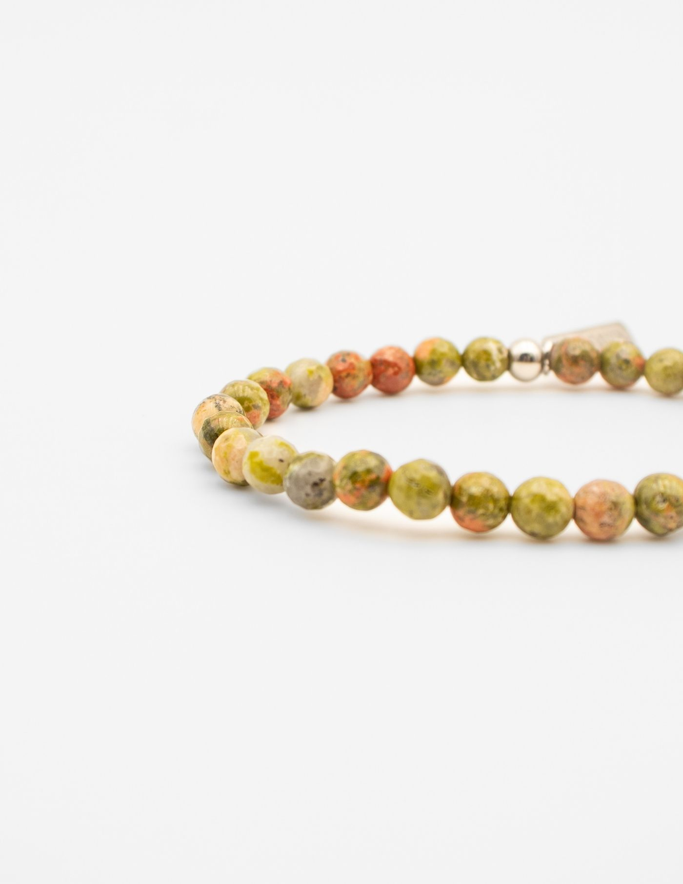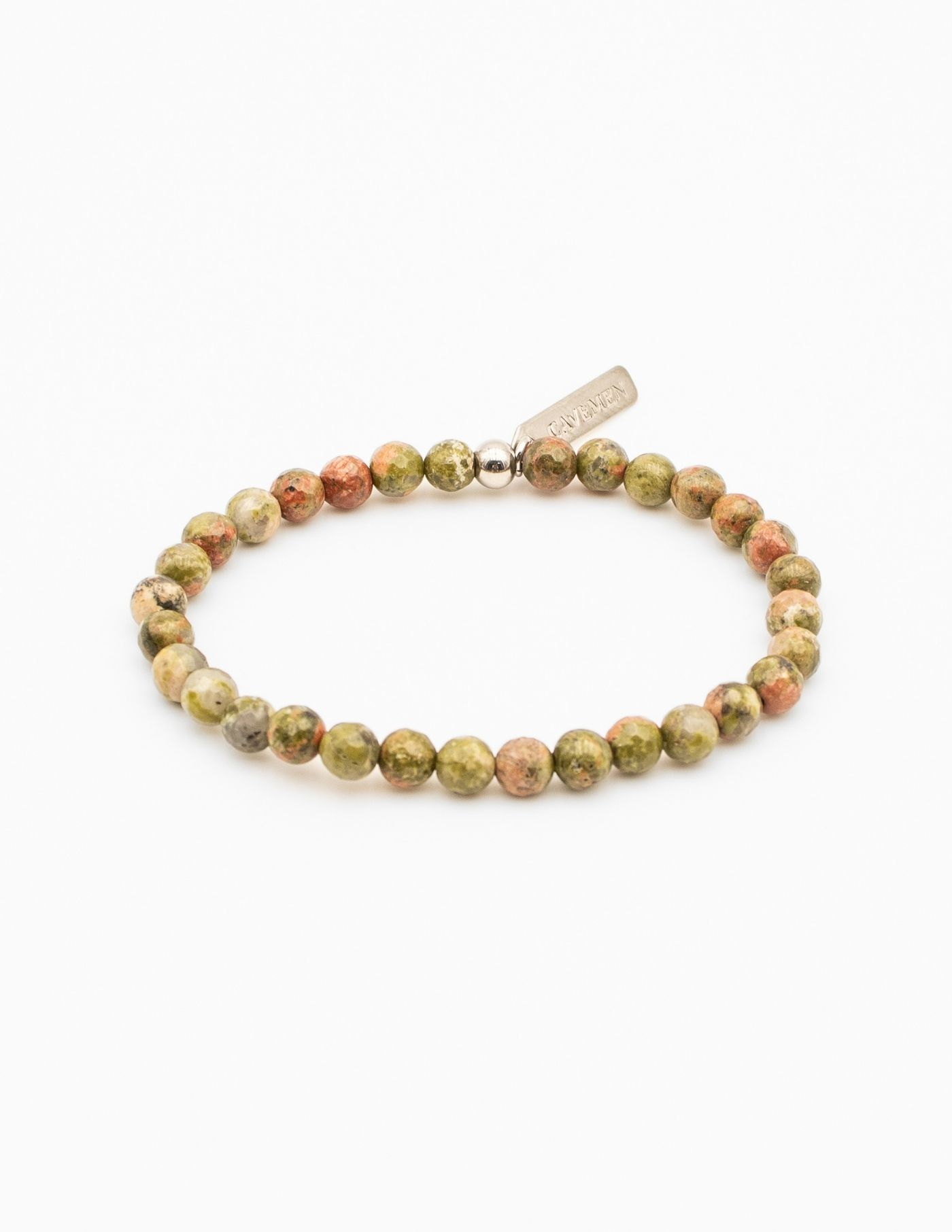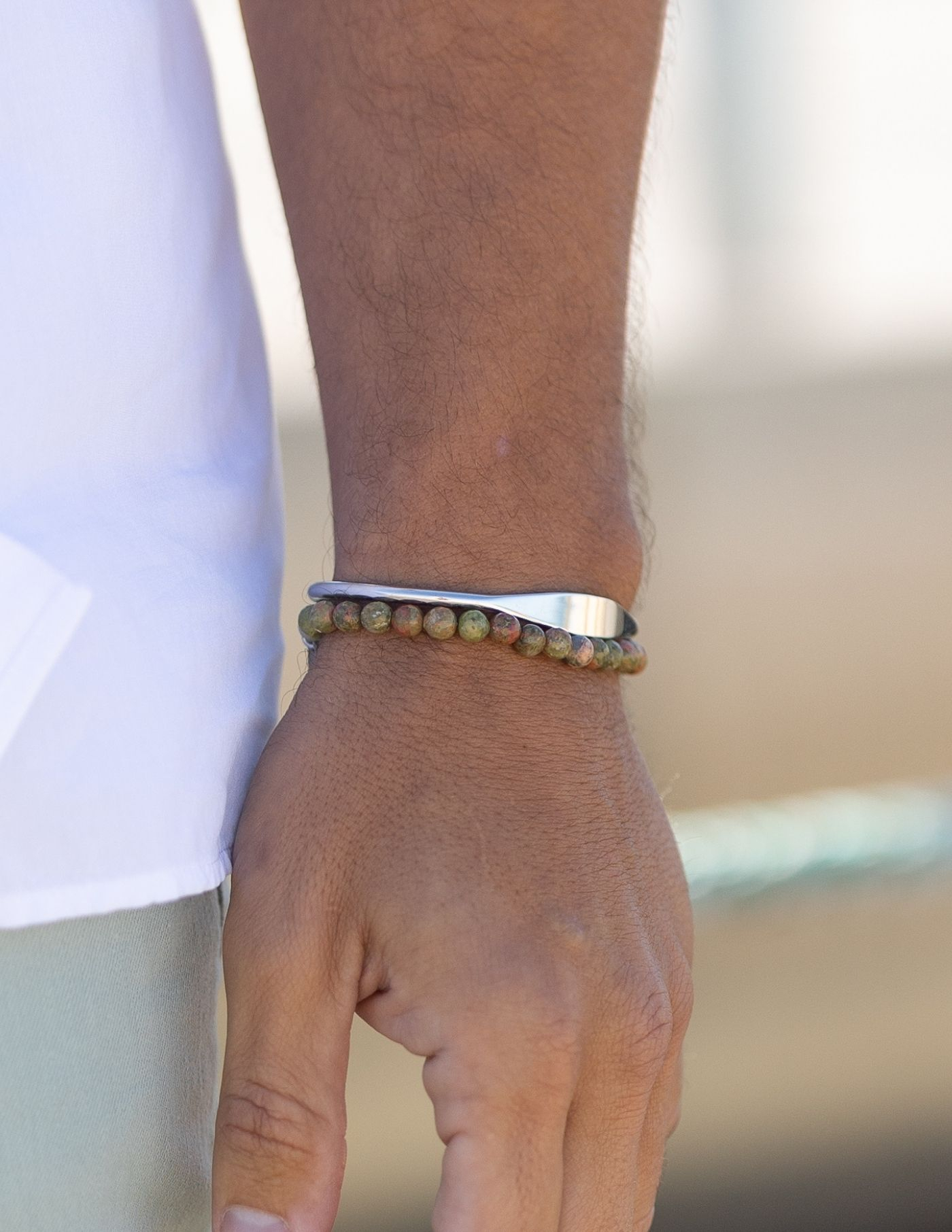 Pulseira em pedrais naturais, combinação de verde, terracota e apontamento claros como ponto de luz. Desenvolvida a pensar num homem de perfil moderno e contemporâneo. A sua versatilidade permite utilizá-la de forma isolada ou em conjugação com pulseiras de outros materiais e encaixa facilmente em qualquer visual.
