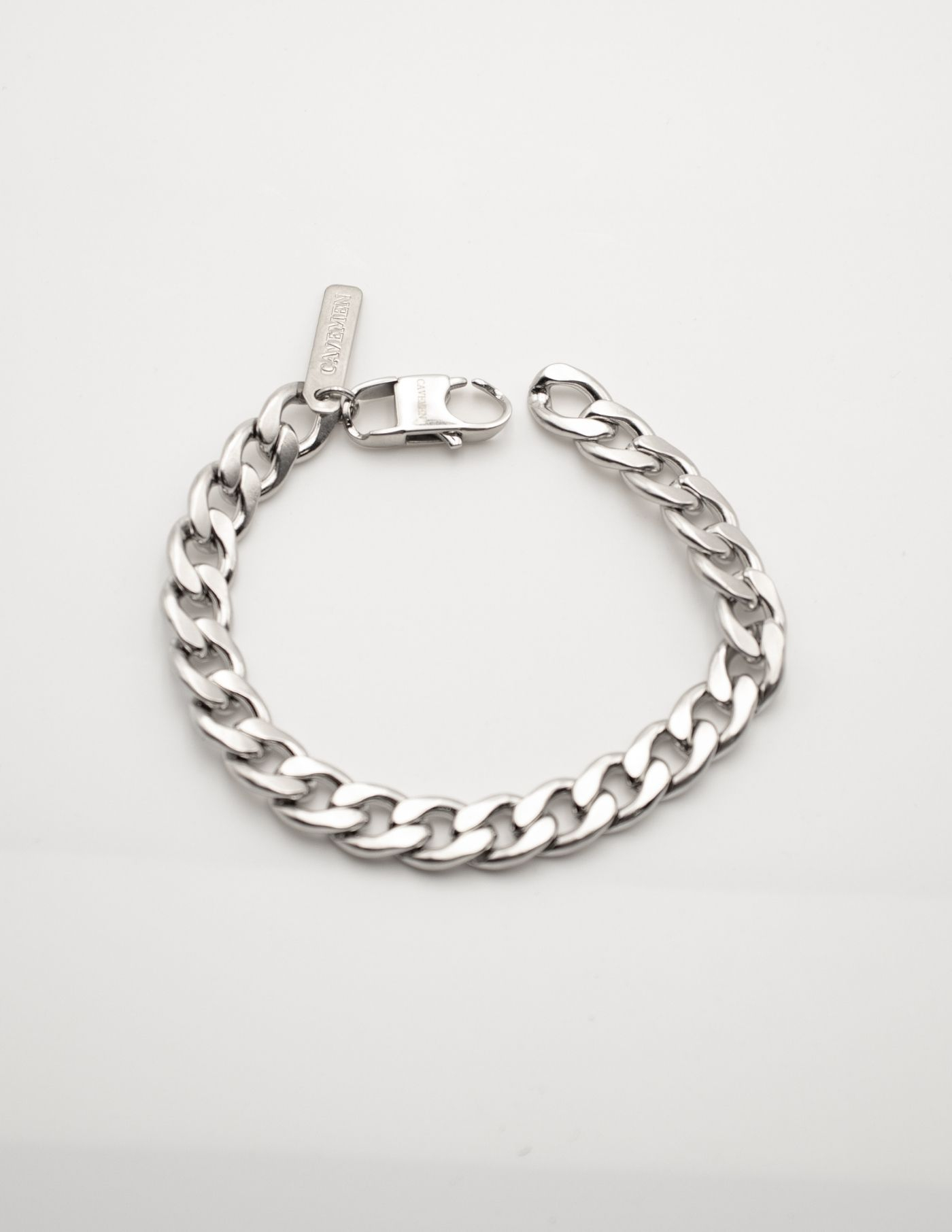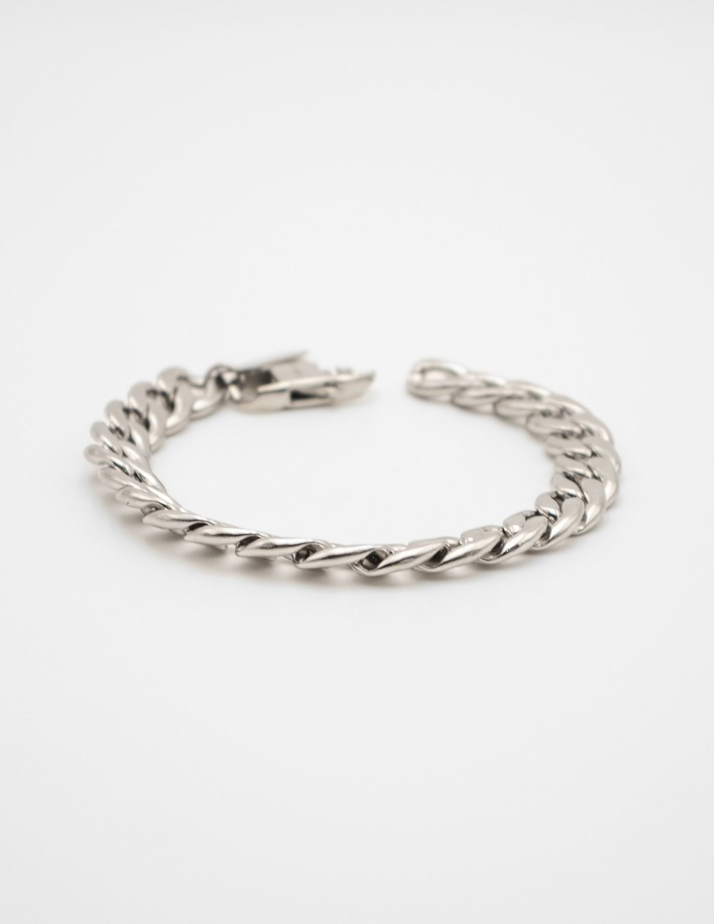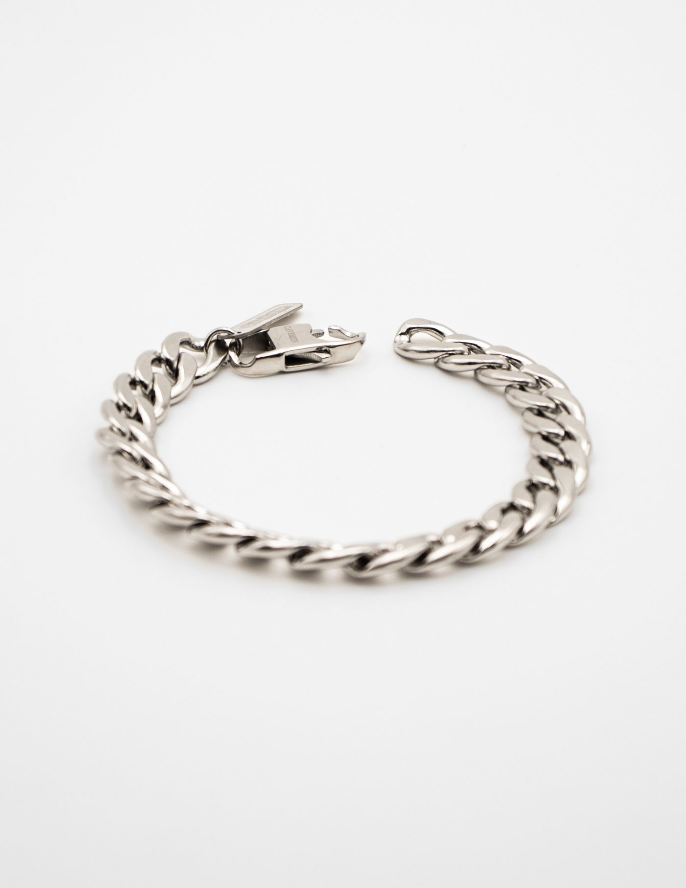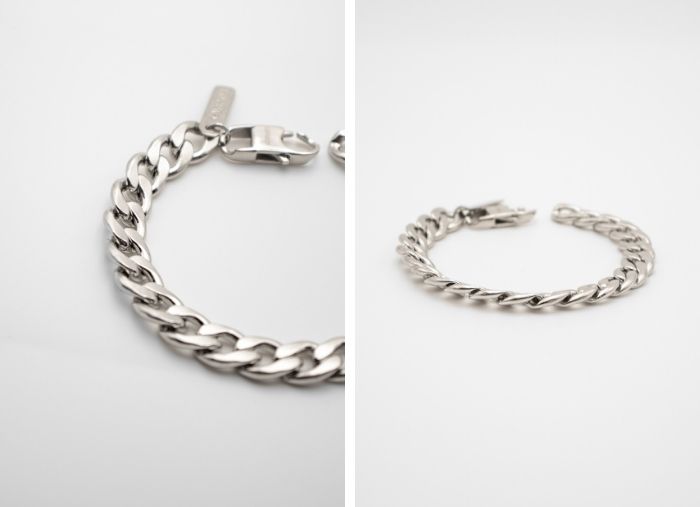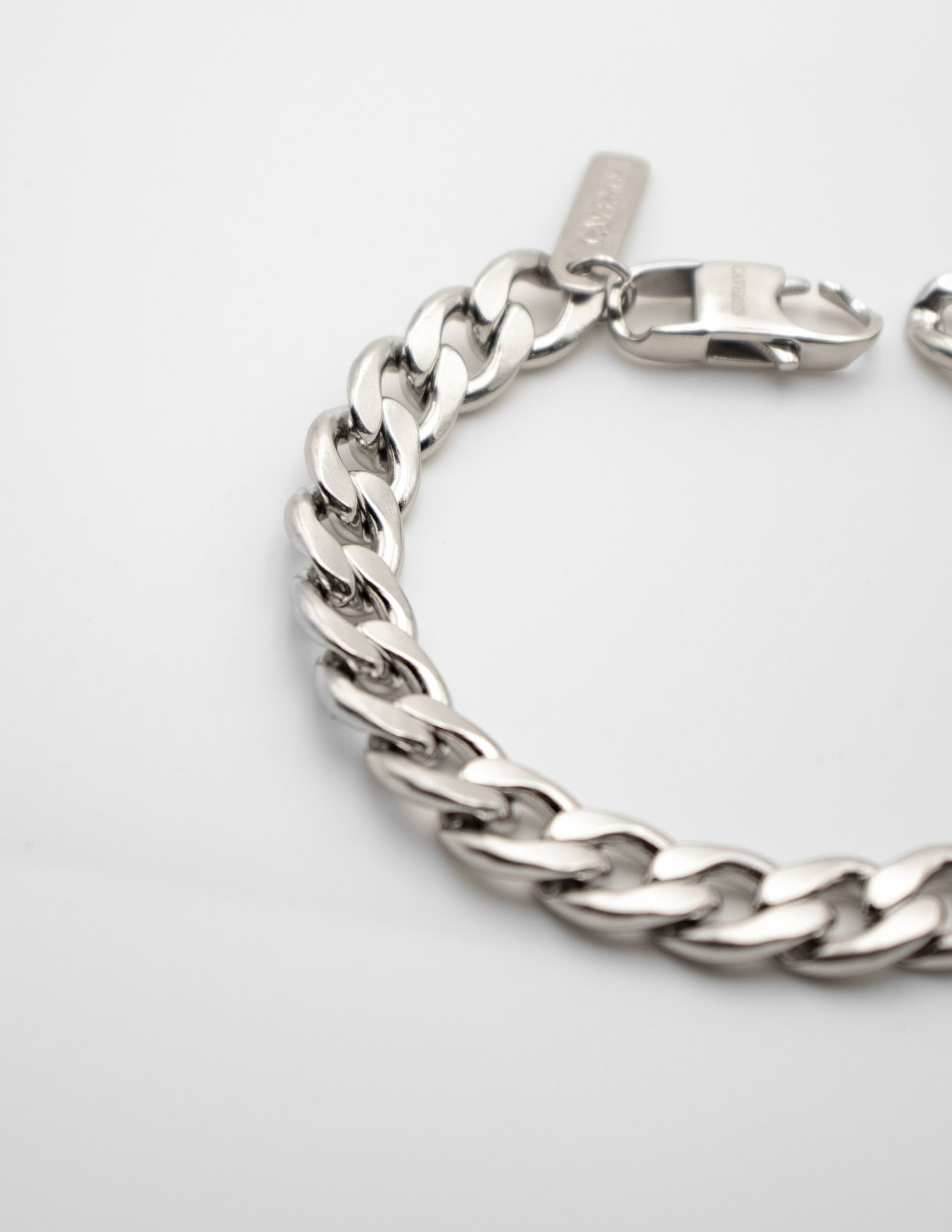 Feita em aço inoxidável 316L polido, com espessura de 10 mm e comprimento de 20 cm, num tom prateado intemporal. Com o mosquetão em garra de lagosta, é fácil de colocar e tirar. Resistente e robusta, facilmente conjuga-se com outras pulseiras, até de outros materiais, dada a sua versatilidade.