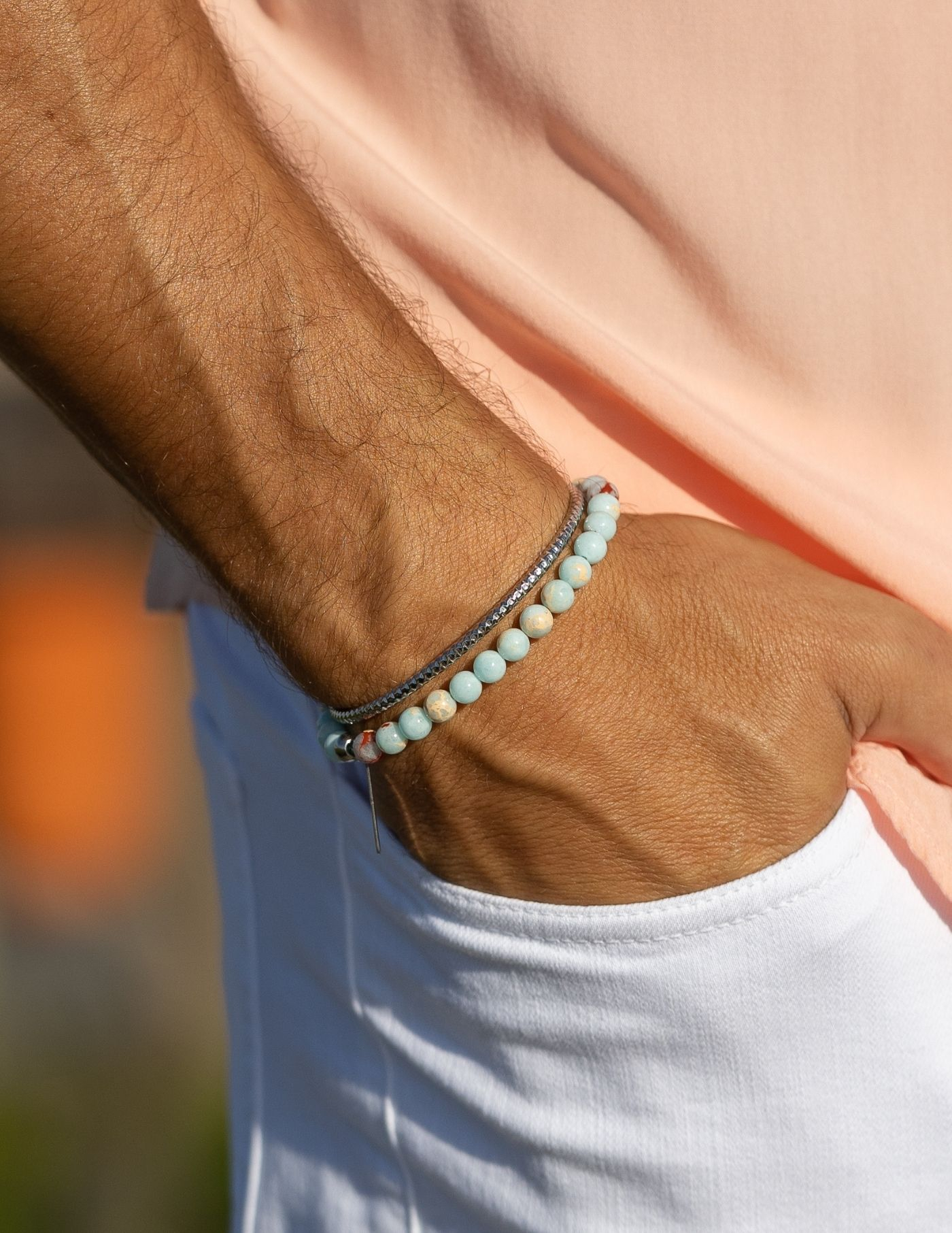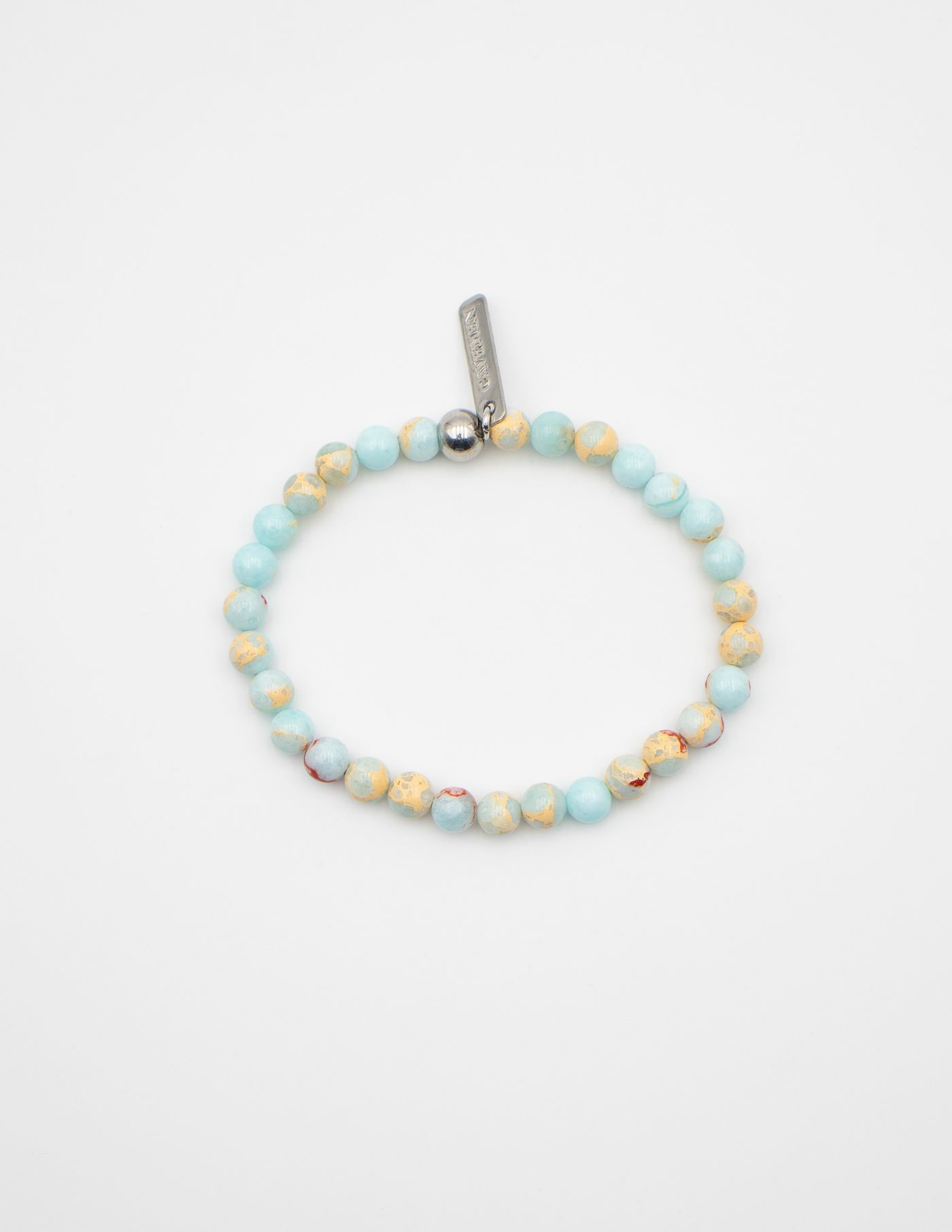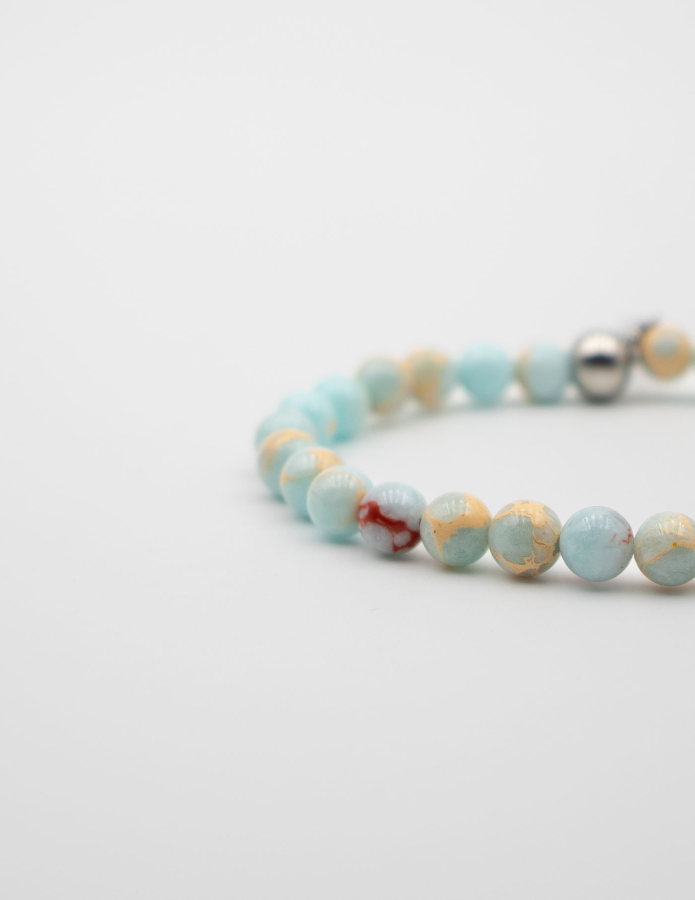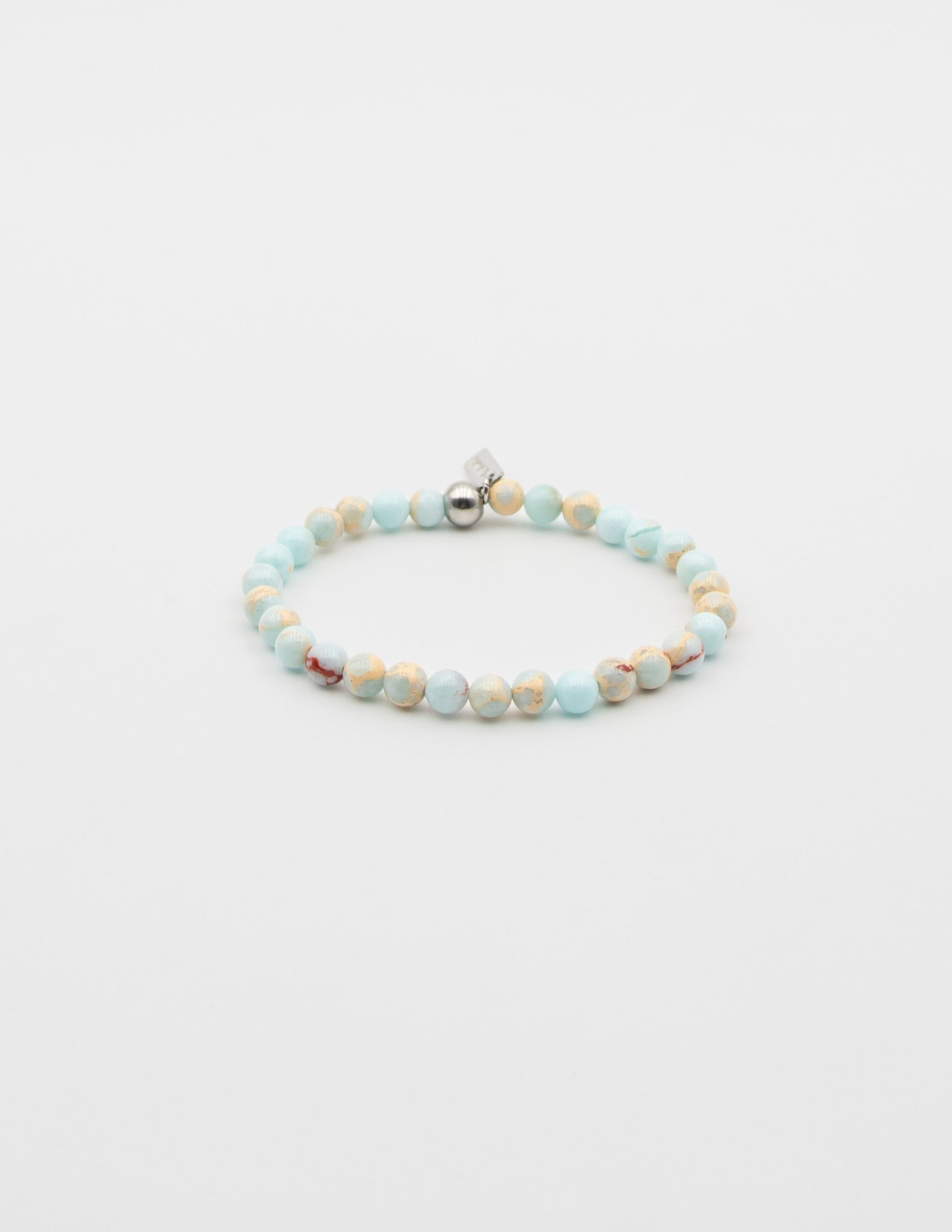 Pulseira com tons de azul e bege, que estiliza o teu outfit e se transforma no detalhe adequado para todas as ocasiões do teu dia. A constituição em pedras naturais transmite-lhe um toque místico, carregado de boas energias.