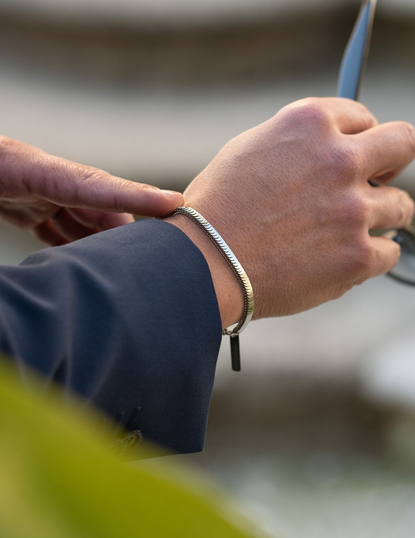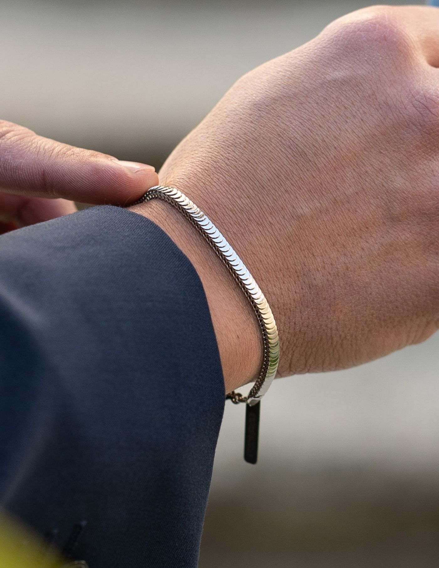 Com um estilo próprio, textura e acabamento refinado, este modelo com 20 cm de comprimento e espessura de 3 mm serve de conjugação harmoniosa com outros modelos de pulseiras ou então, se usada individualmente, para enriquecer um look mais leve e minimalista.
