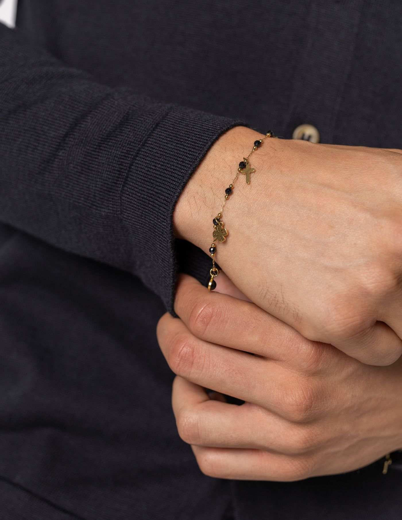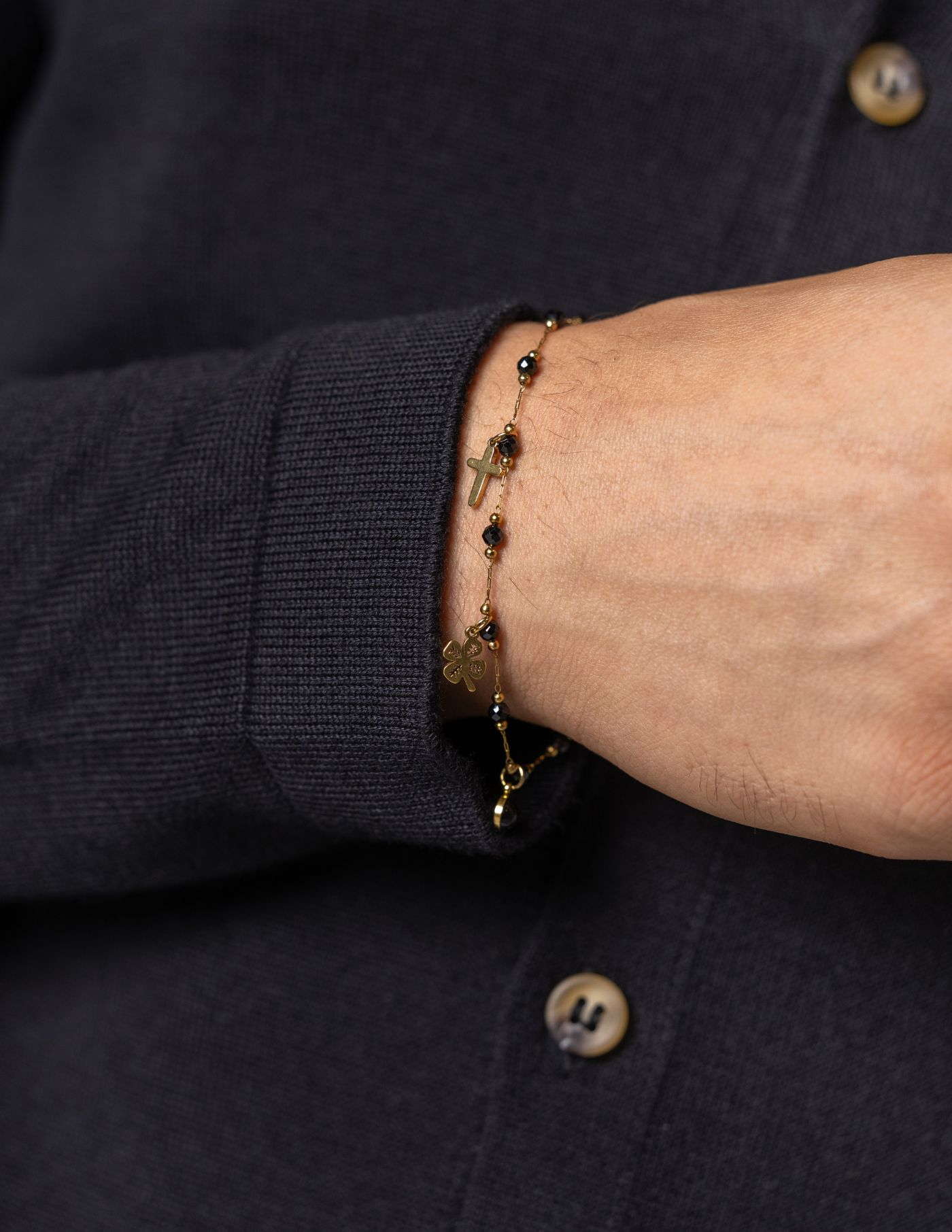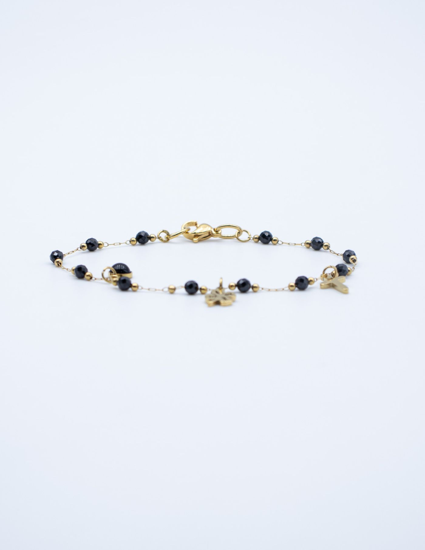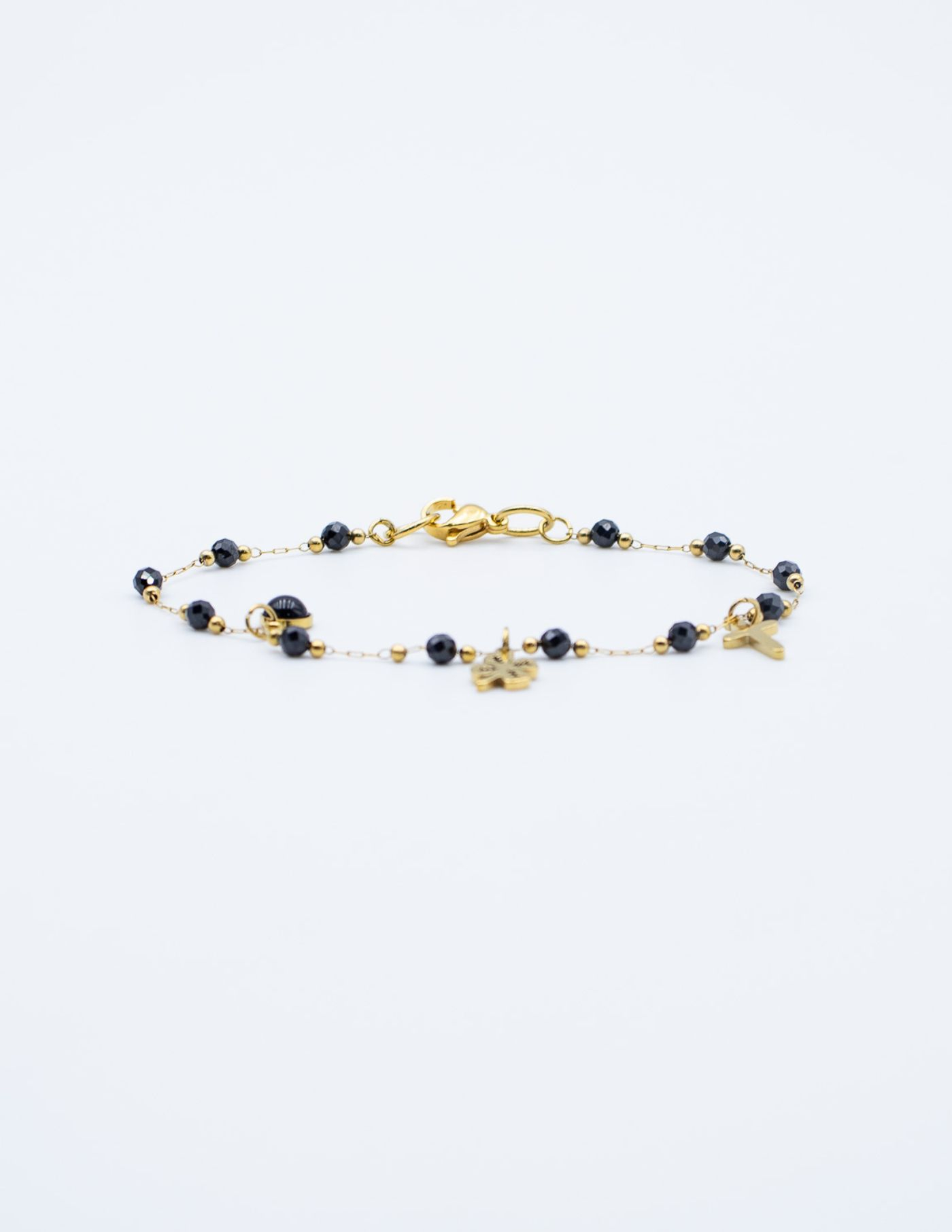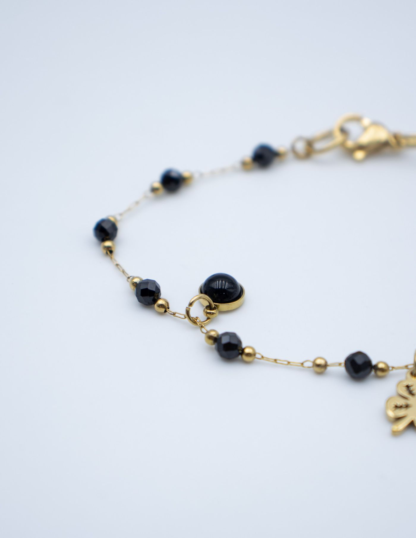 Esta elegante pulseira é uma verdadeira expressão de estilo e significado, feita em aço inoxidável dourado de alta qualidade, garantindo durabilidade e um brilho sofisticado. A peça é adornada com pedras pretas que adicionam um toque de mistério e sofisticação, criando um contraste marcante e contemporâneo. Os pendentes que compõem esta pulseira são repletos de simbolismo e energia.