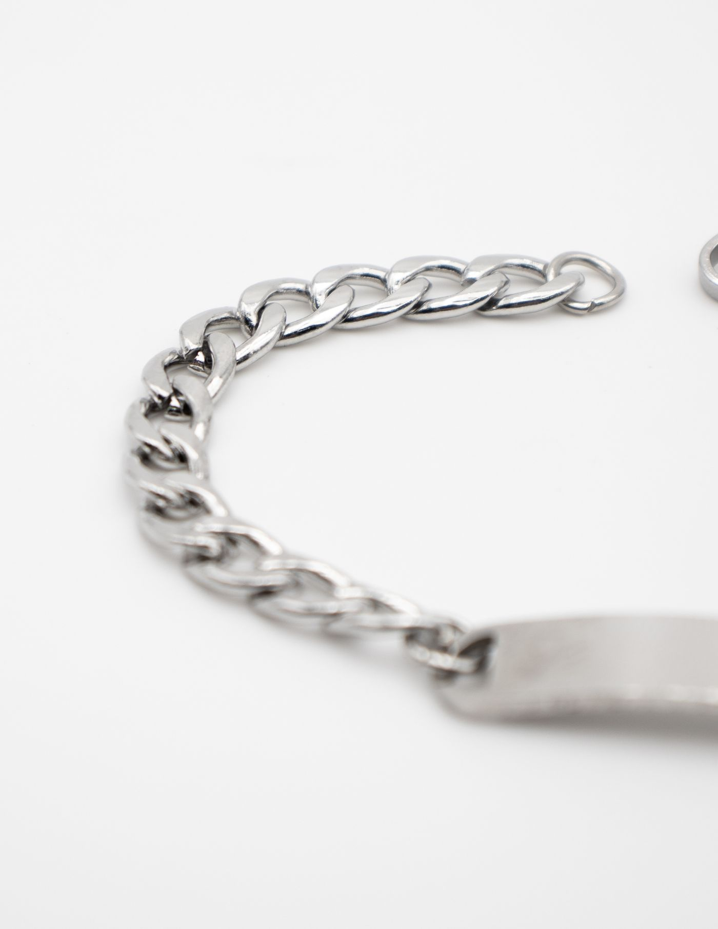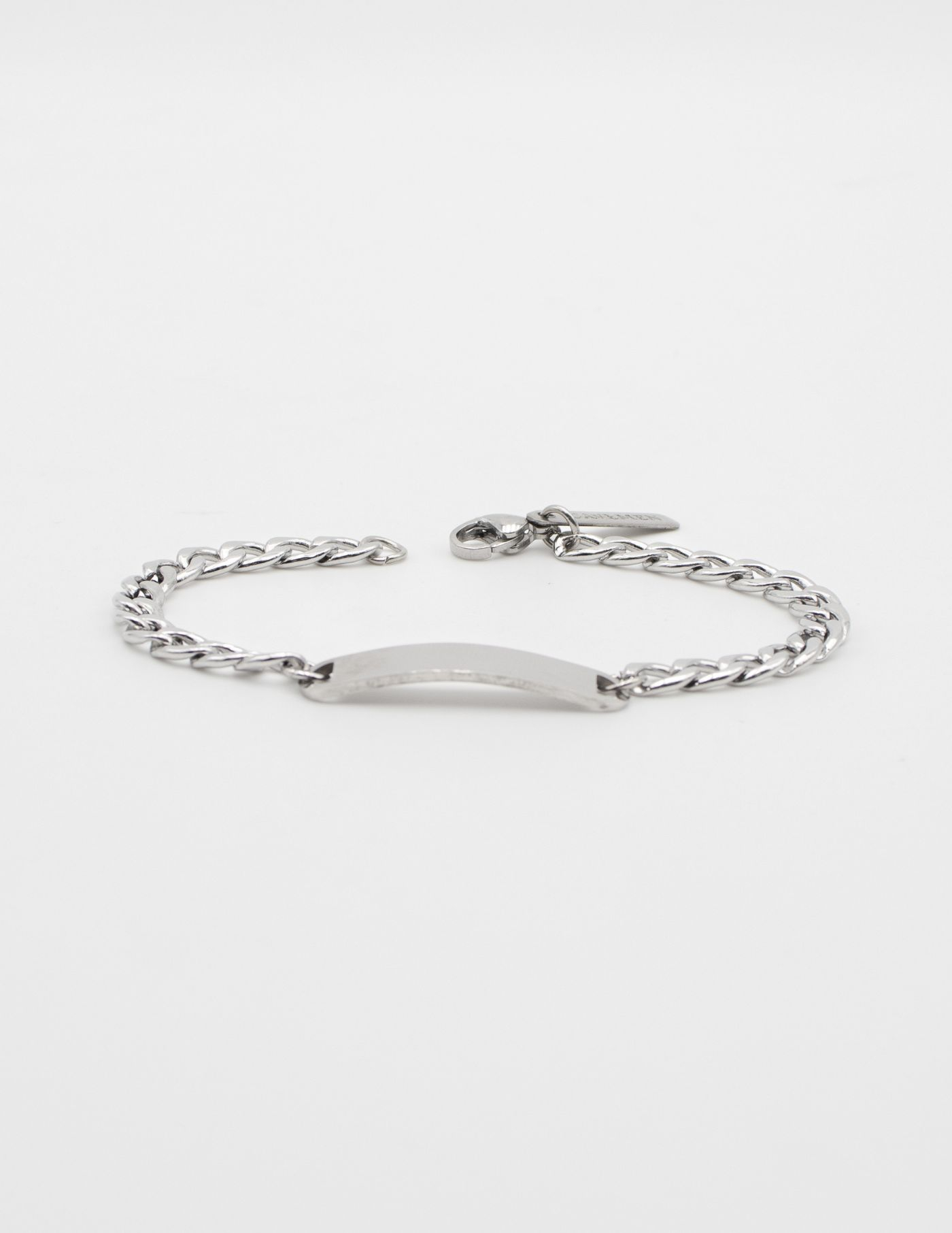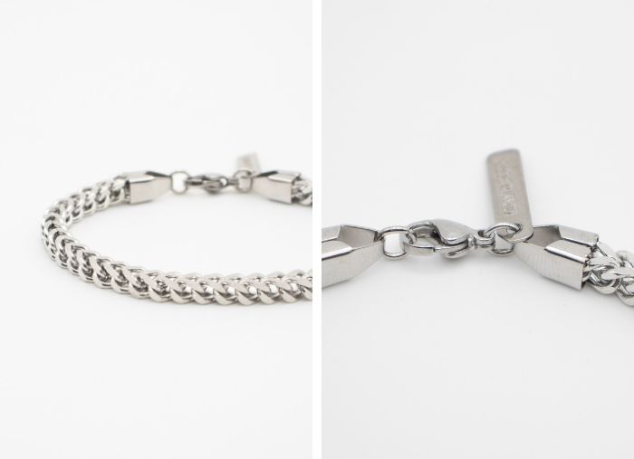 A pulseira, em aço inoxidável 316L polido, com elos interligados de forma apertada, vai dar o twist certo ao look masculino.