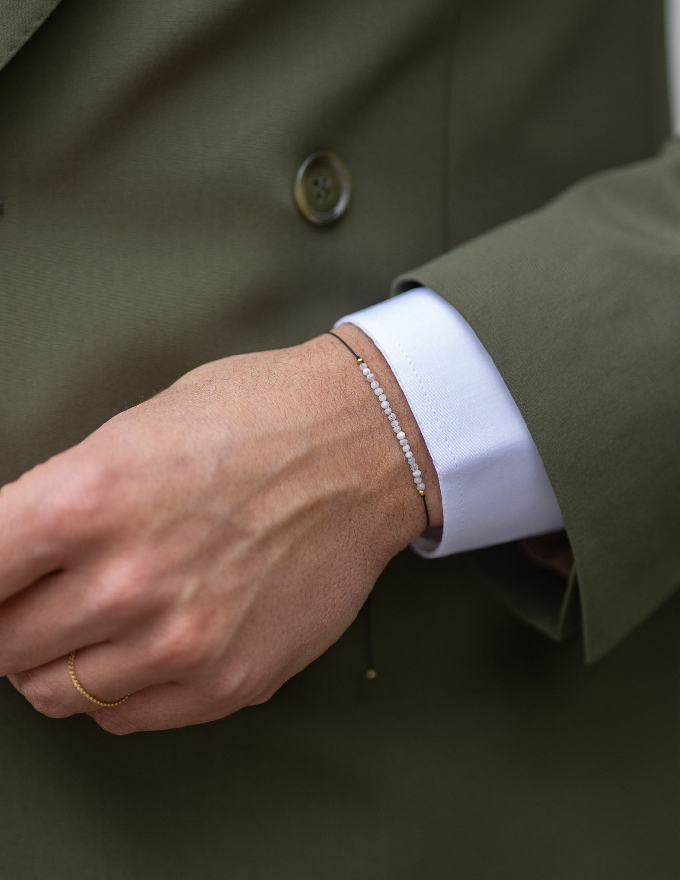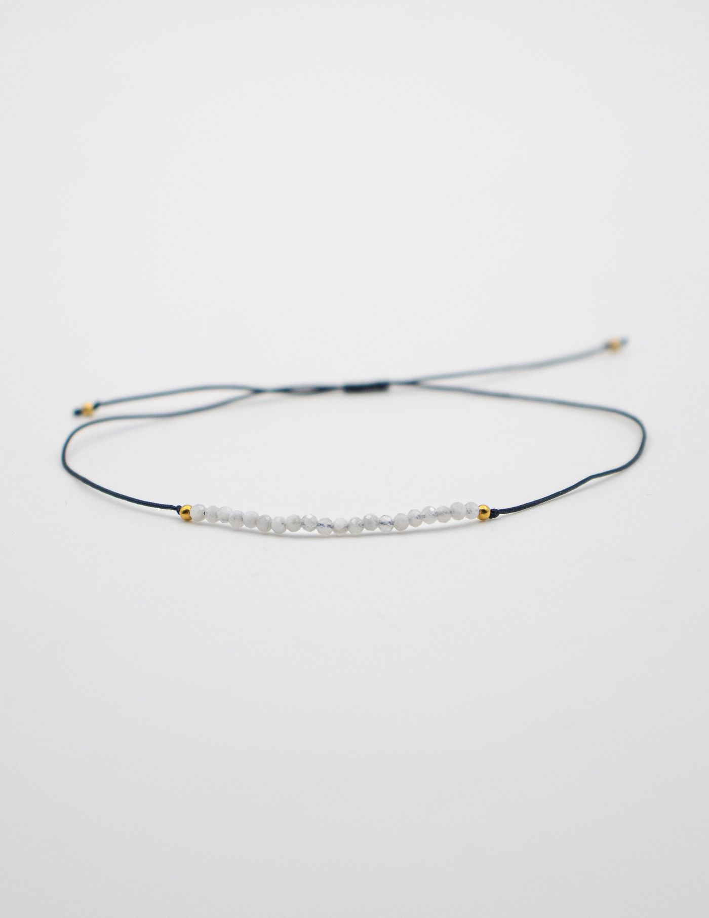 Design minimalista e tons intemporais. Conta com um comprimento de 20 cm (ajustável ao pulso) e as pedras têm 1 mm de largura.