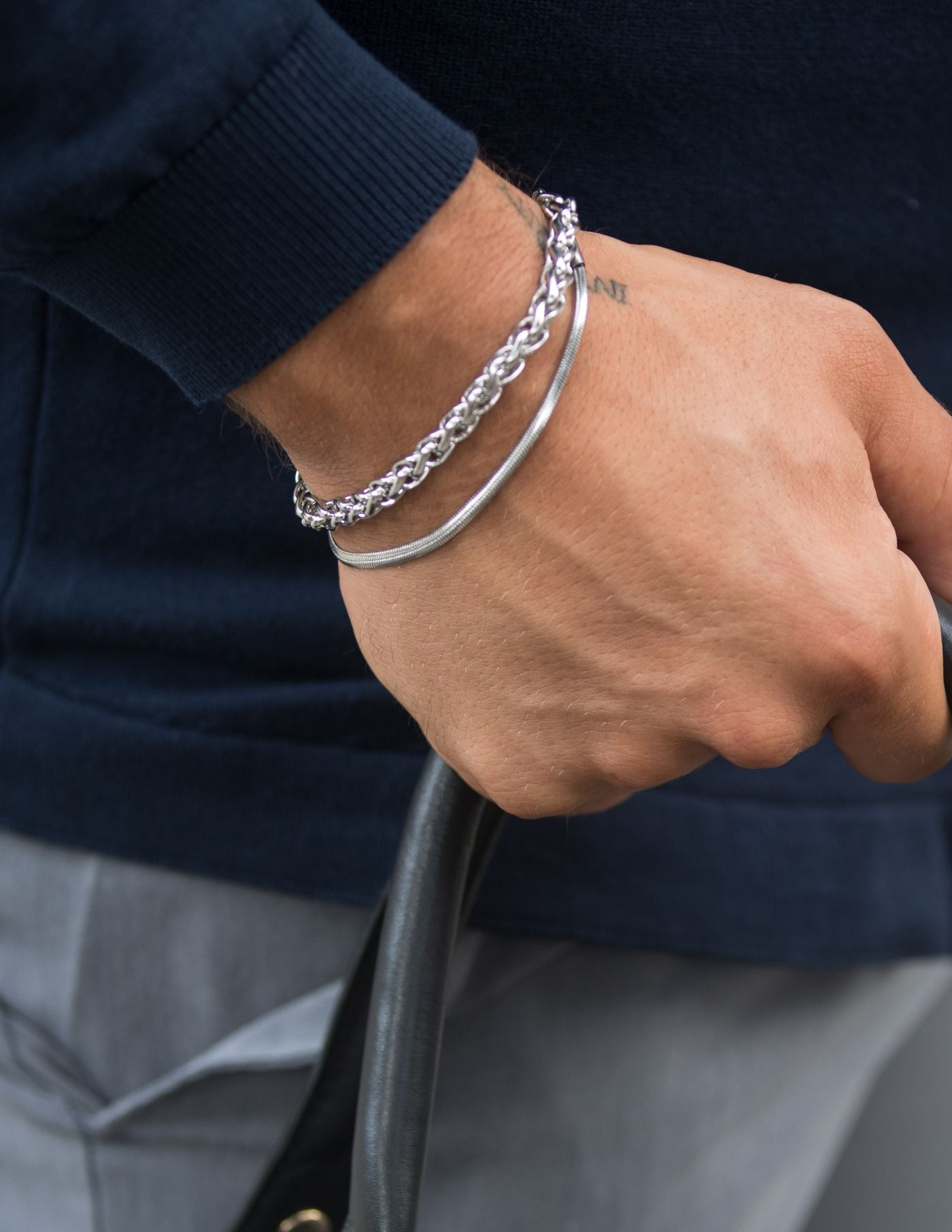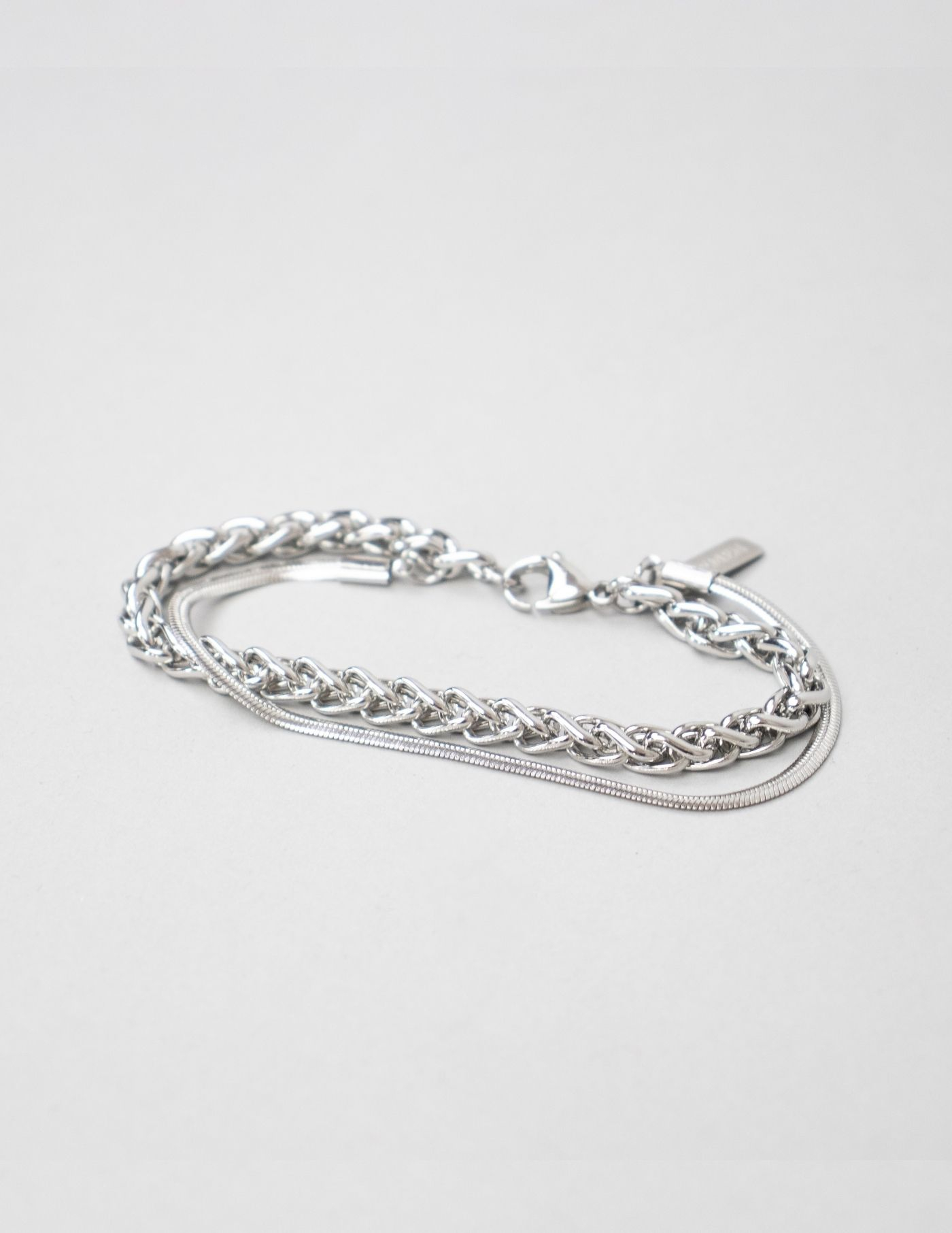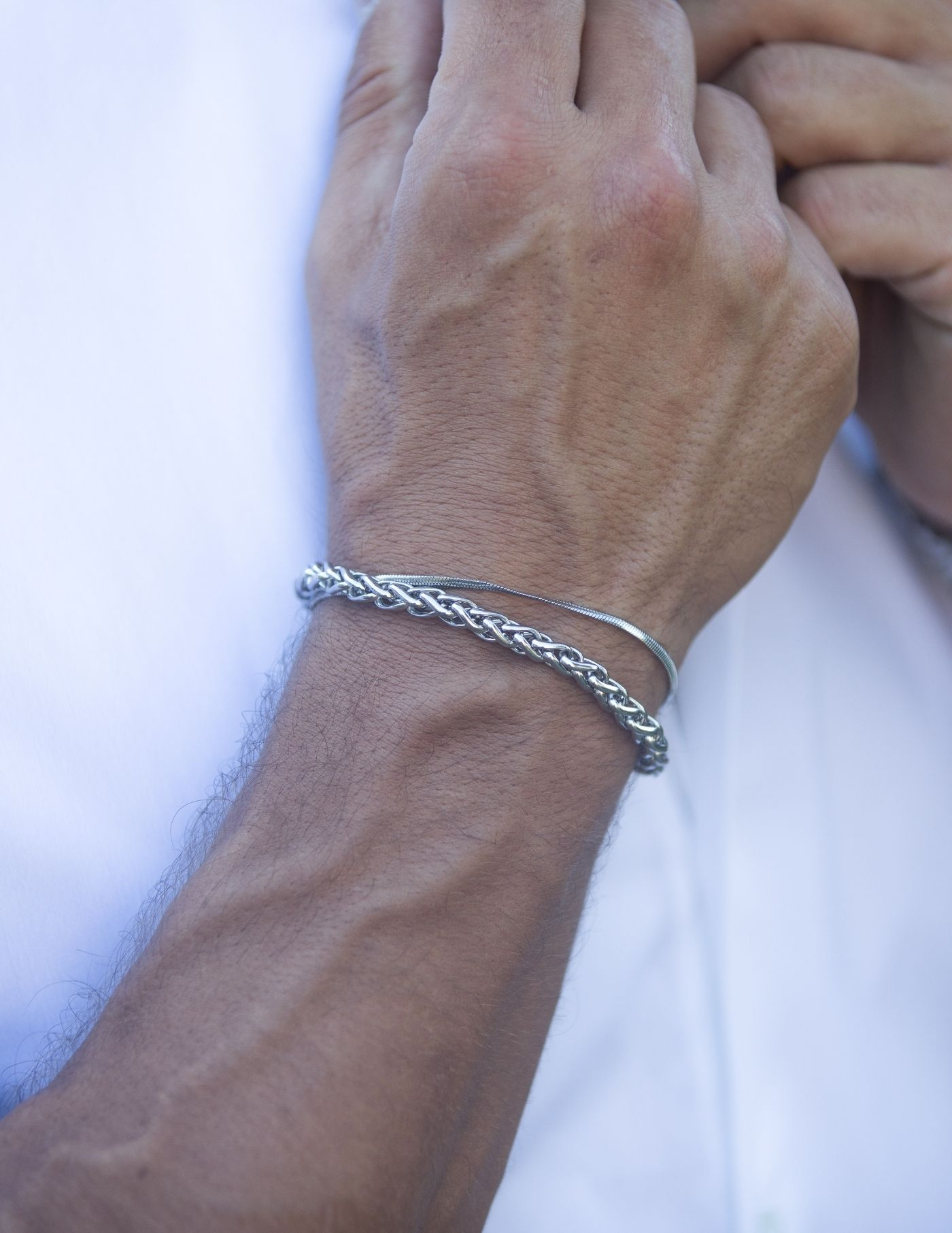 Pulseira masculina composta por duas correntes, de larguras diferentes, em aço inoxidável 316L polido. As correntes movem-se livremente, estando separadas uma da outra.