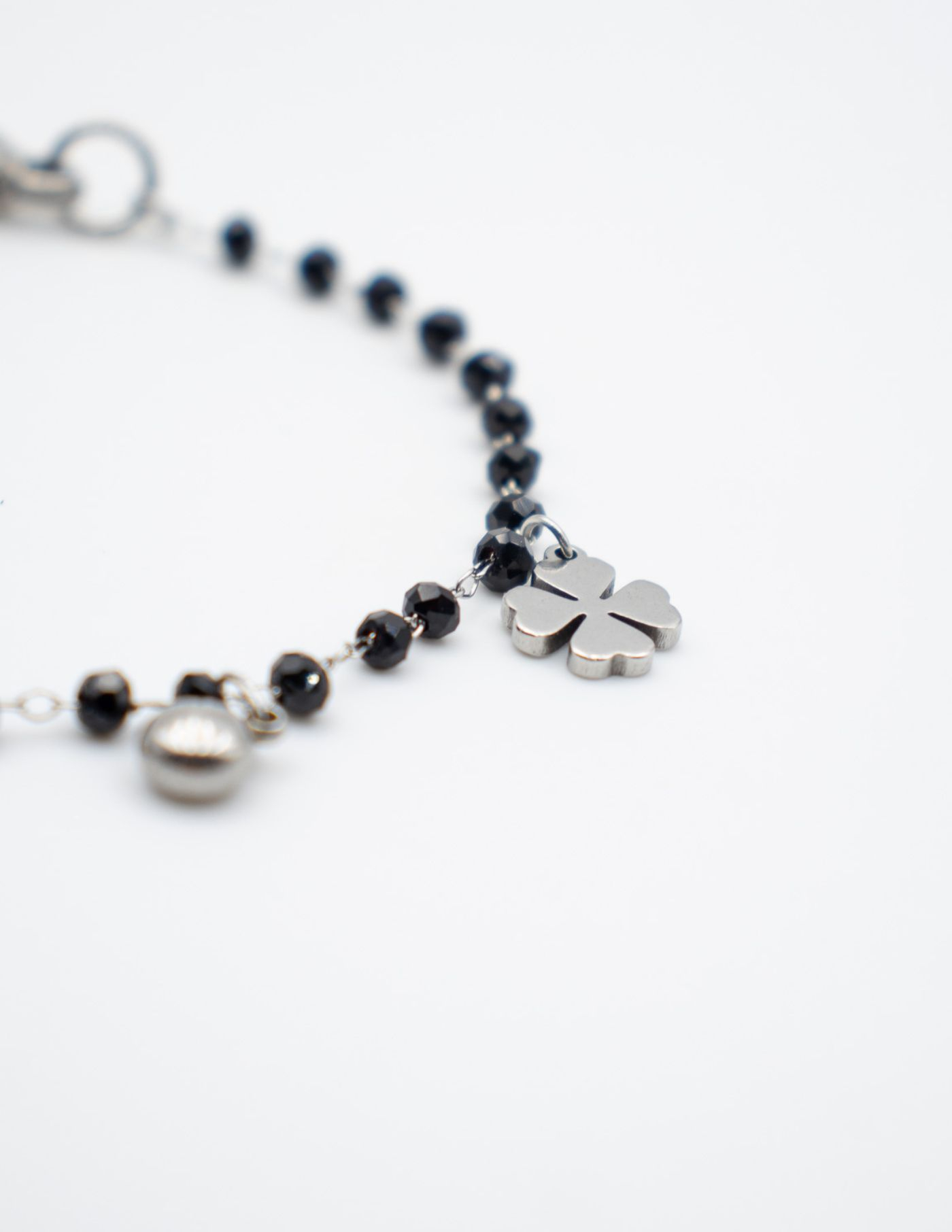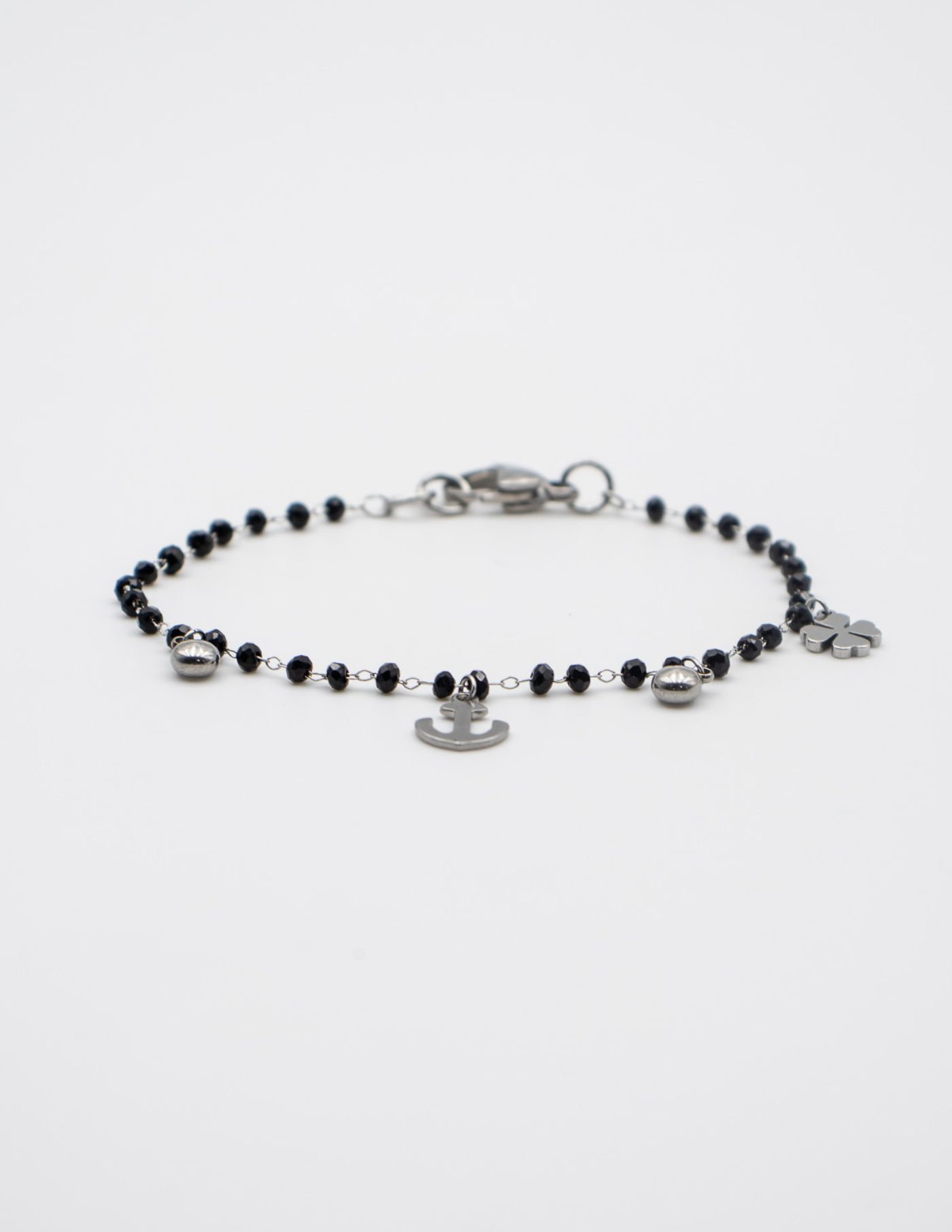 Pulseira masculina em aço inoxidável prateado com pedras pretas, destacando um estilo marcante e contemporâneo. Com um pendente de crucifixo, símbolo de fé e proteção, e um detalhe de brilhante que acrescenta um toque de sofisticação, esta peça é ideal para homens que valorizam o significado. Uma pulseira que combina elegância e atitude.
