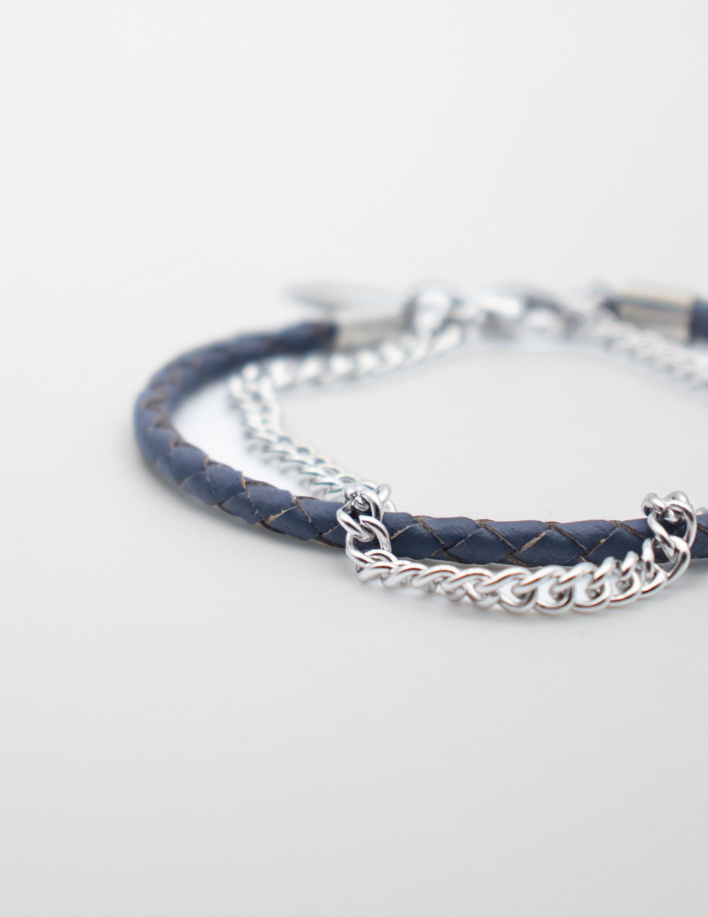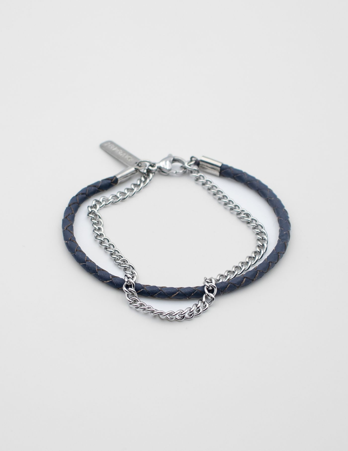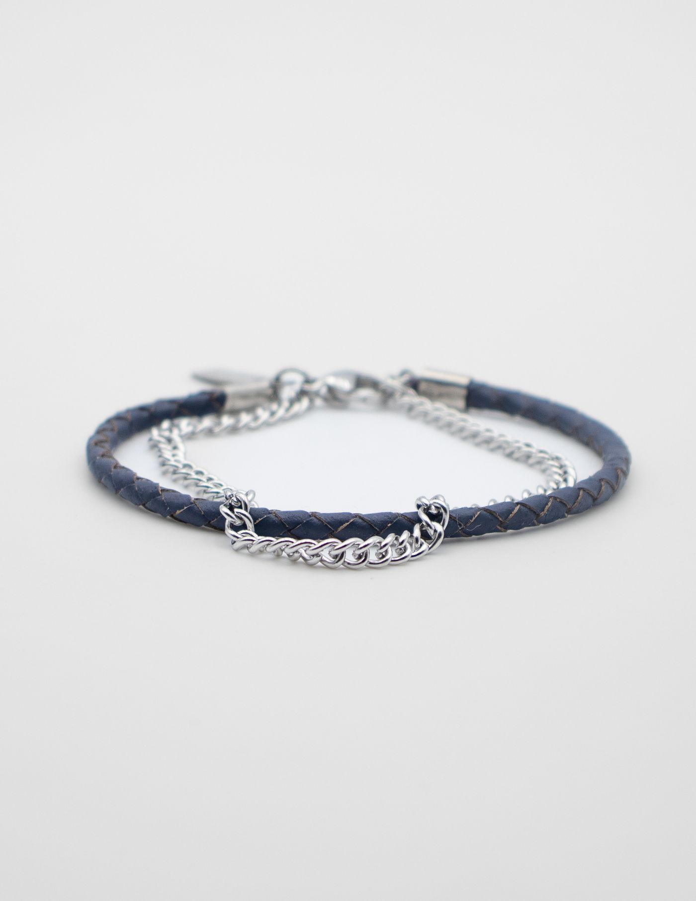 Pulseira dupla que resulta da conjugação perfeita entre pele genuína e aço inoxidável. A pulseira de pele tem um padrão entrançado enquanto a corrente de aço é leve e minimalista.