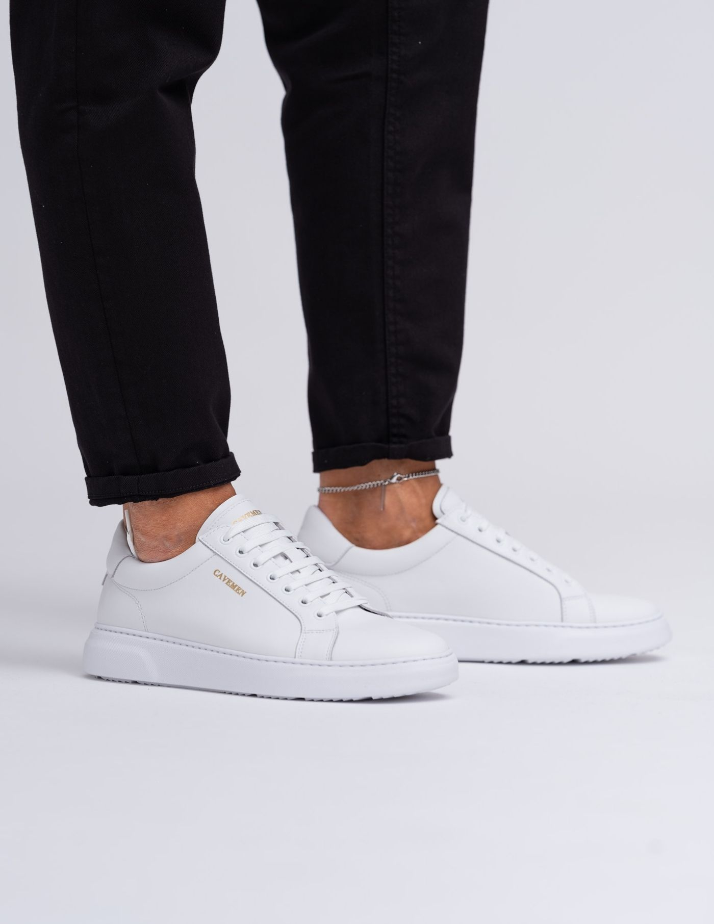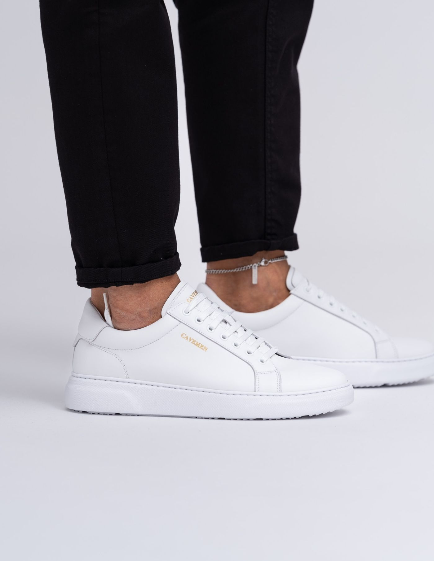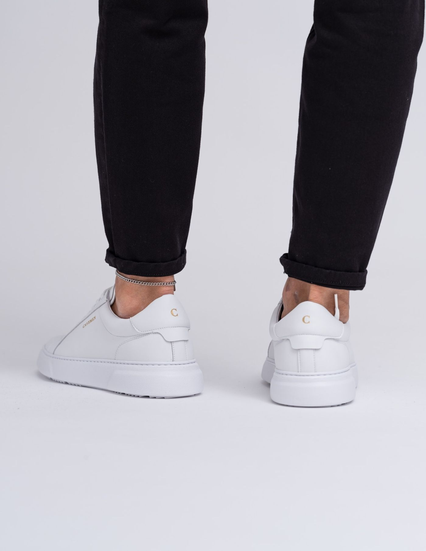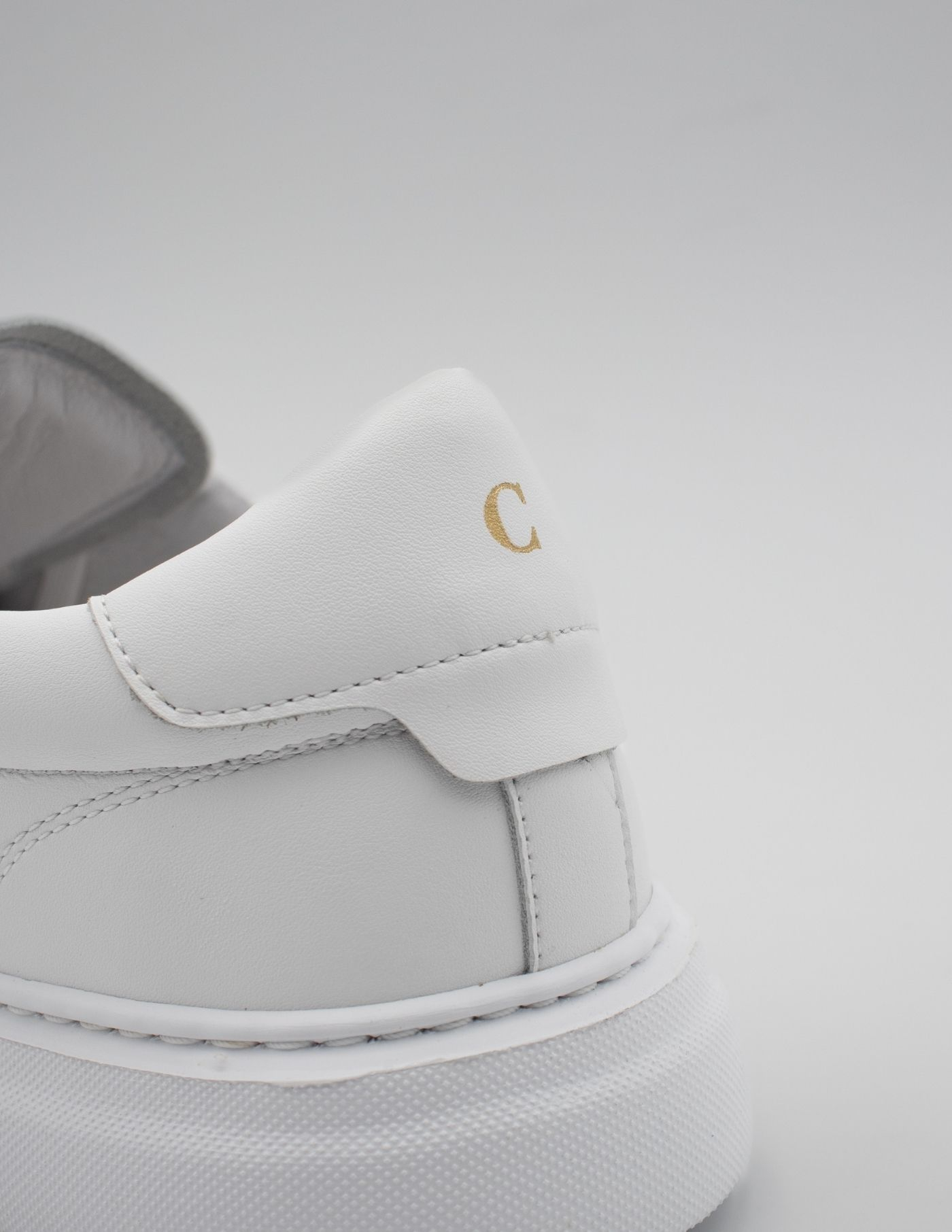 Sapatilha branca, com cordão e sola alta. Esta peça foi pensada para um homem de espirito leve e descontraído, que não abdica do conforto em qualquer momento do seu dia. Combina pele na parte superior com a inovadora sola EVA, caracterizada pela extrema leveza e capacidade de absorção de impacto. O forro é antialérgico e respirável e tem palmilha acolchoada removivel. Finalizada com apontamento prateado no calcanhar.