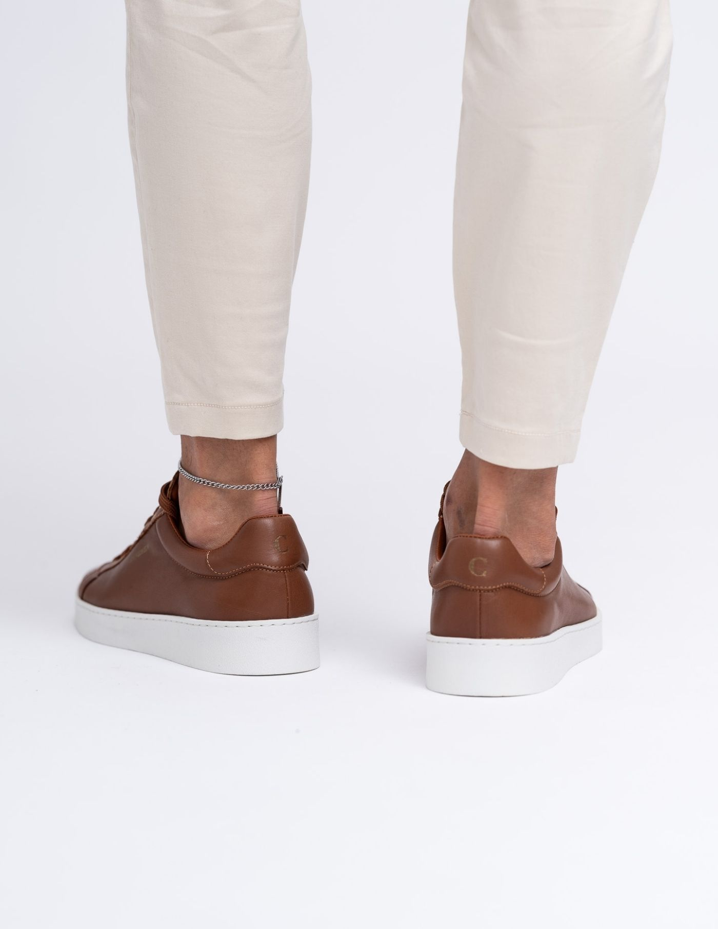 Sapatilha castanha, em pele, com cordão e sola alta e lisa.