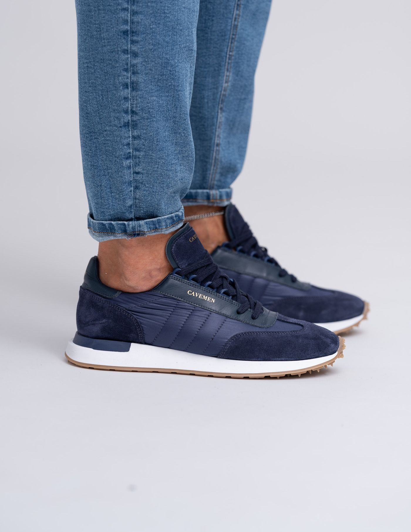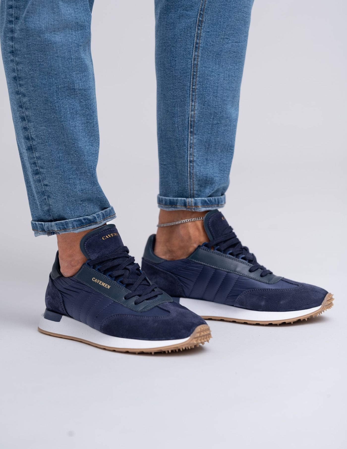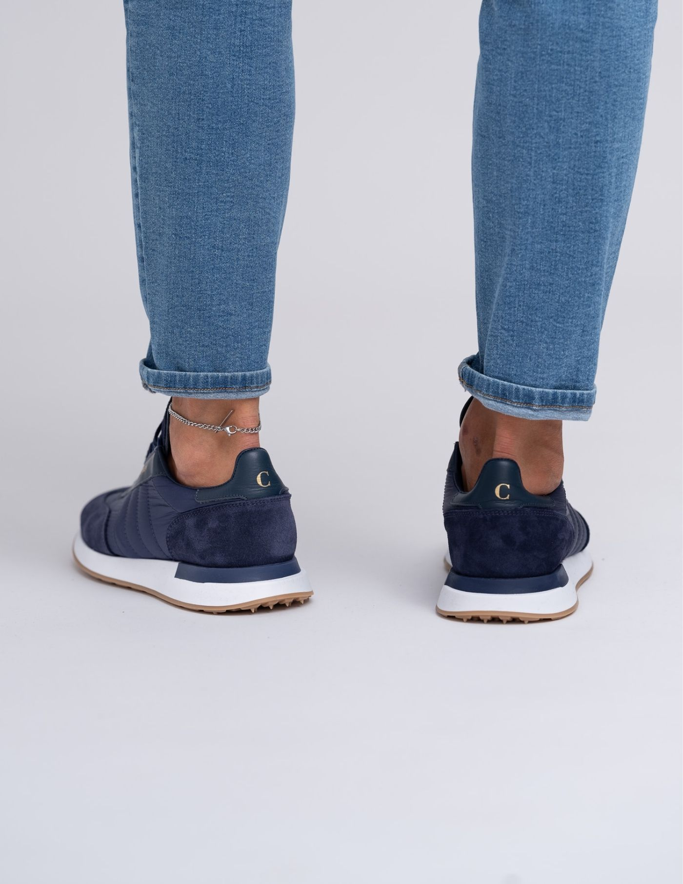 Sapatilha azul marinho, de sola desportiva, com uma mistura de camurça e têxtil, e cordão azul.