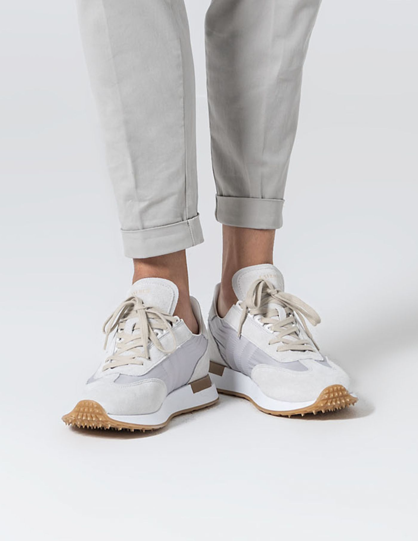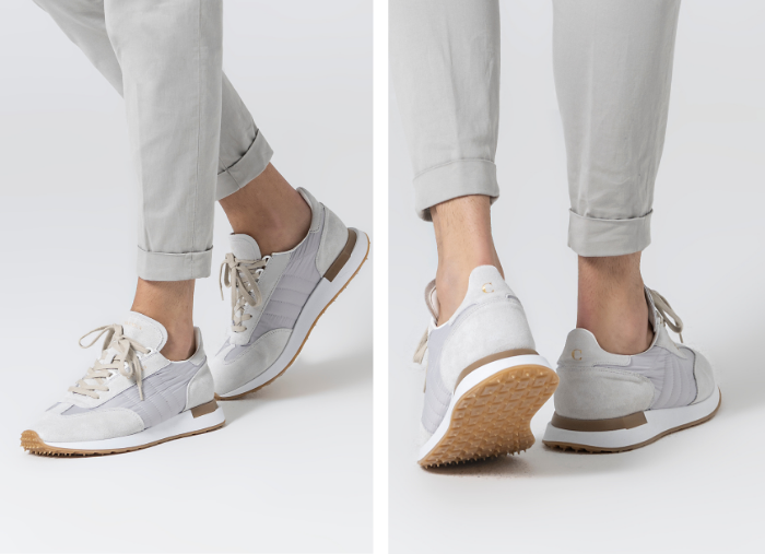 Sapatilha cinza e bege, de sola desportiva, com uma mistura de camurça e têxtil.