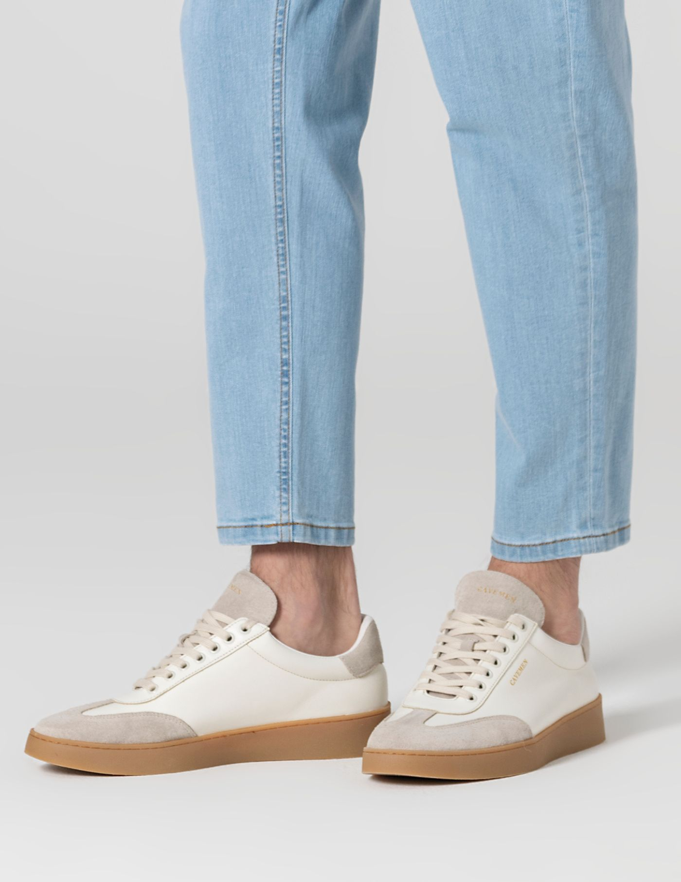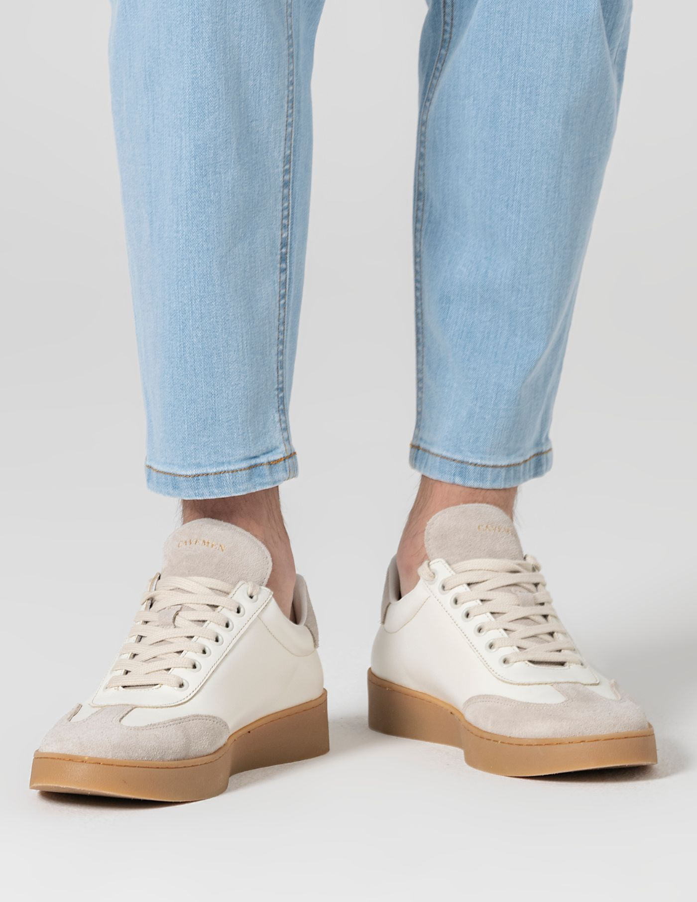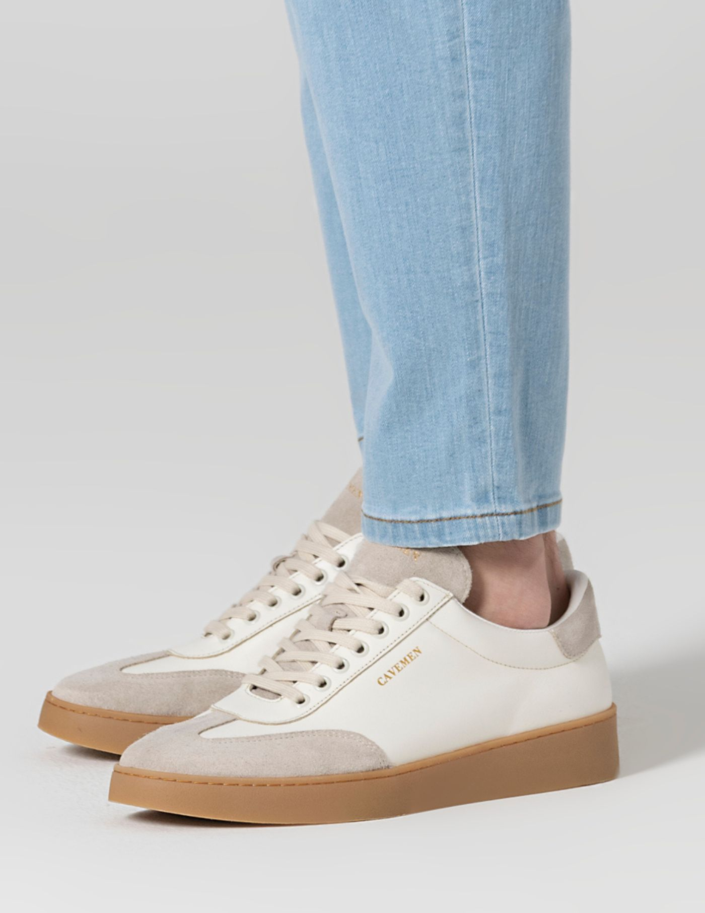 Sapatilha em pele cor natural, com detalhes em camurça e sola natural.