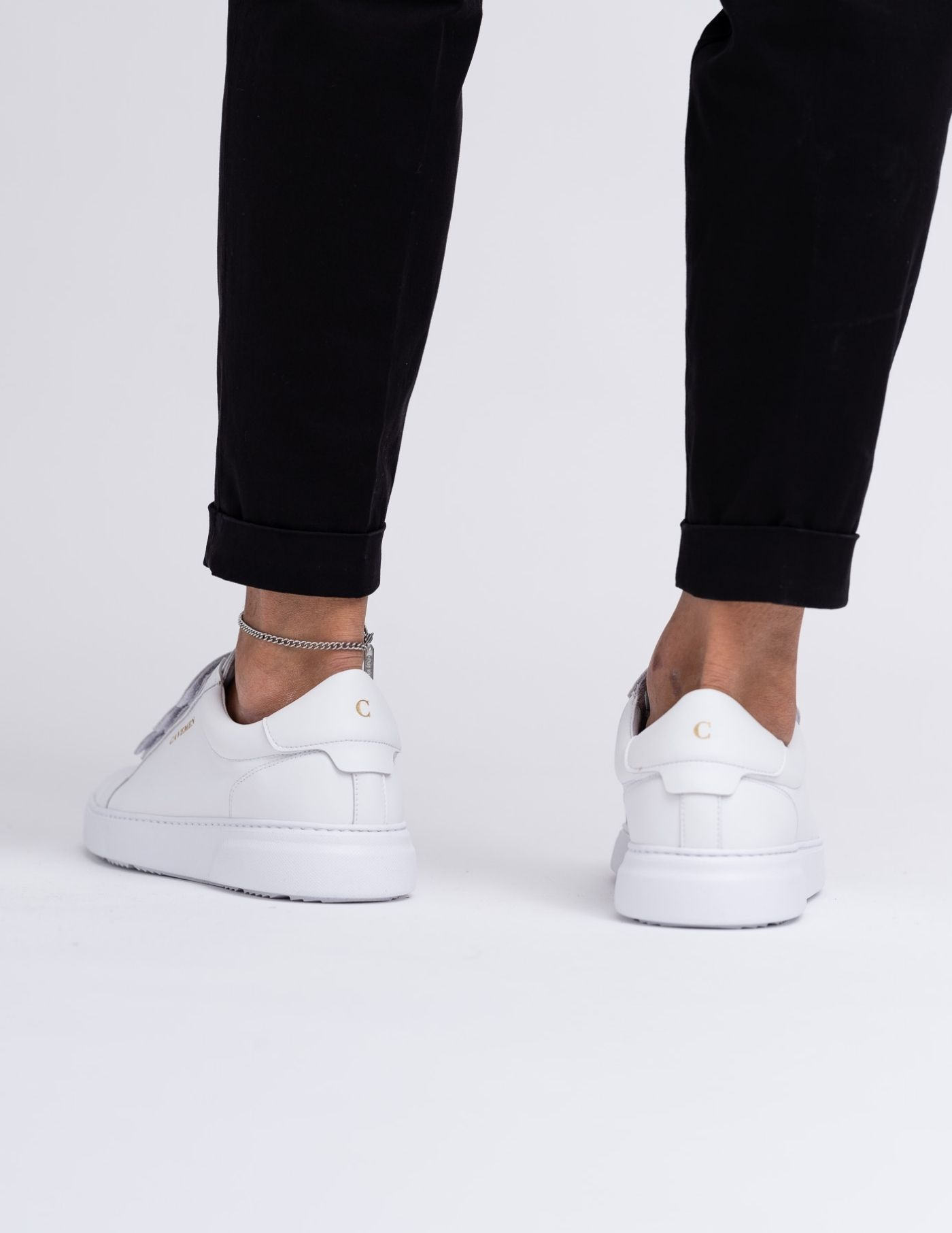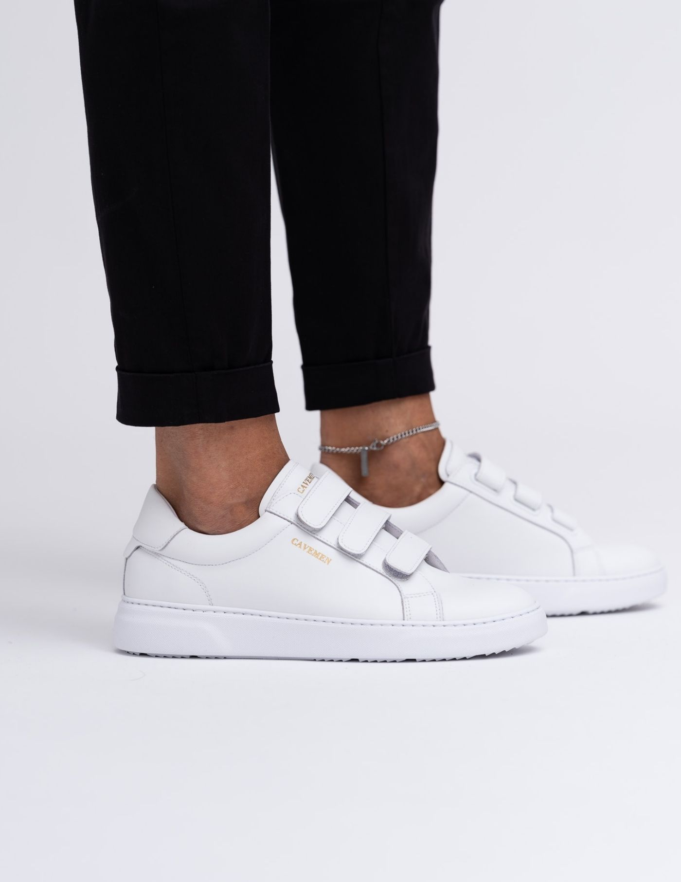 Sapatilha de velcro branca, com sola alta.