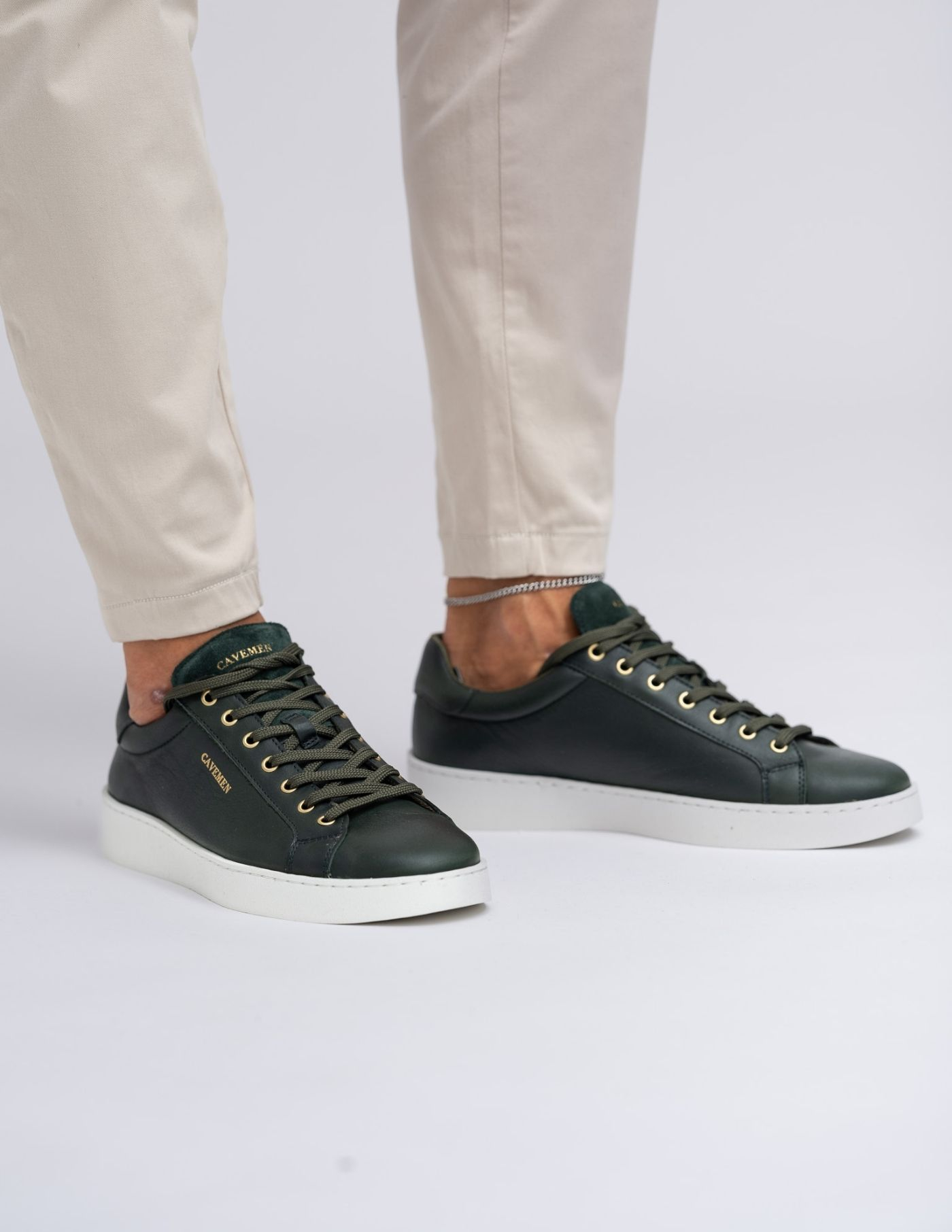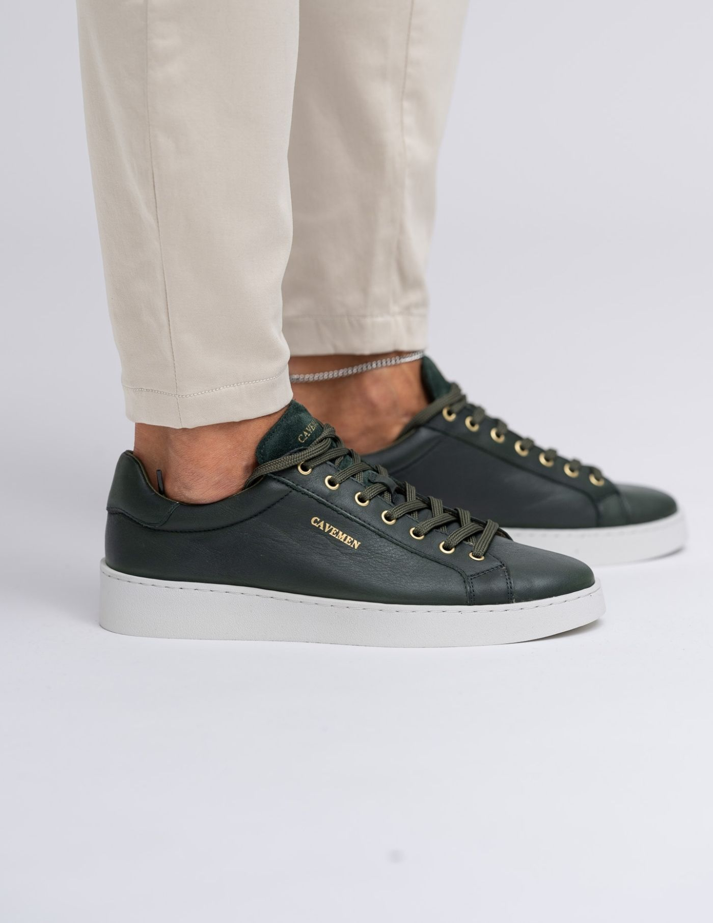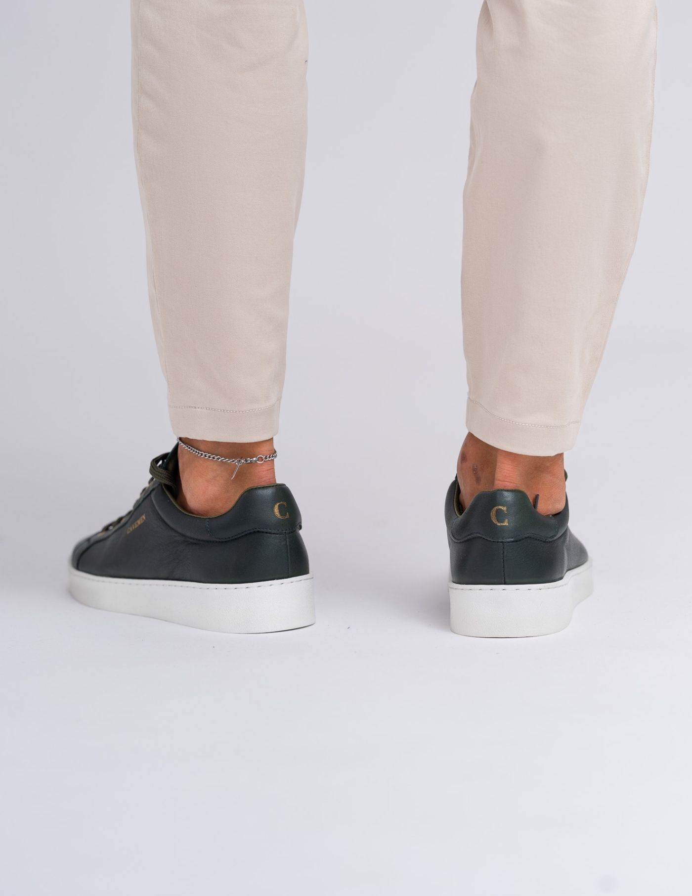 Sapatilha verde, em pele, com cordão e sola alta e lisa.