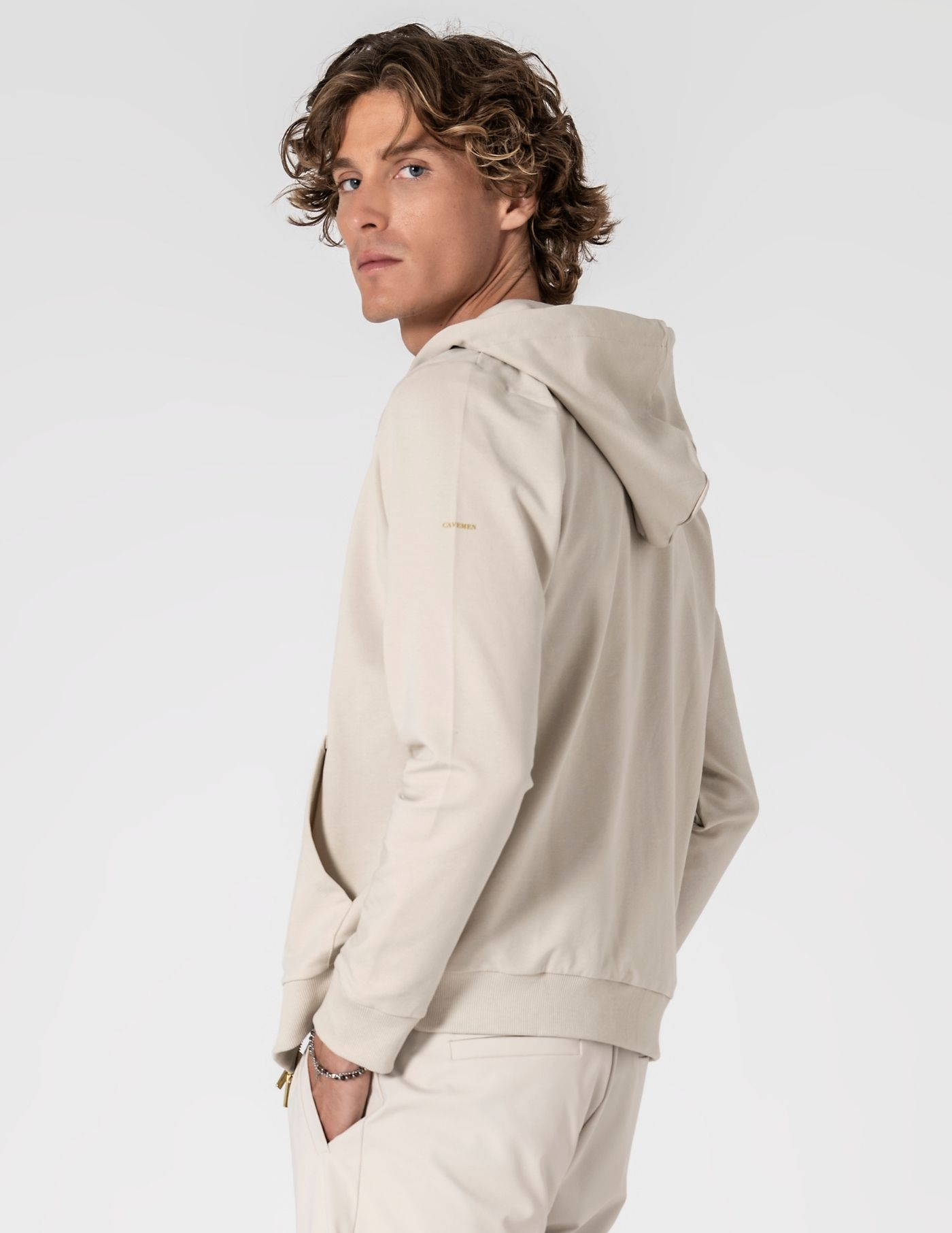 Detalhes: Capuz ajustável; bolso frontal; ilhós e ponteiras dourados; acabamento canelado nos punhos e na bainha; “cavemen” estampado em dourado na manga
