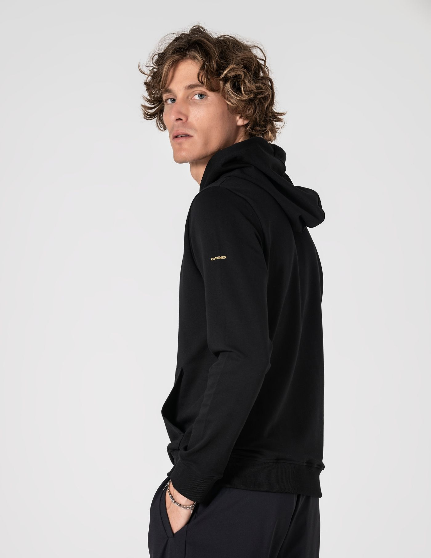 Detalhes: Capuz ajustável; bolso frontal; ilhós e ponteiras dourados; acabamento canelado nos punhos e na bainha; “cavemen” estampado em dourado na manga