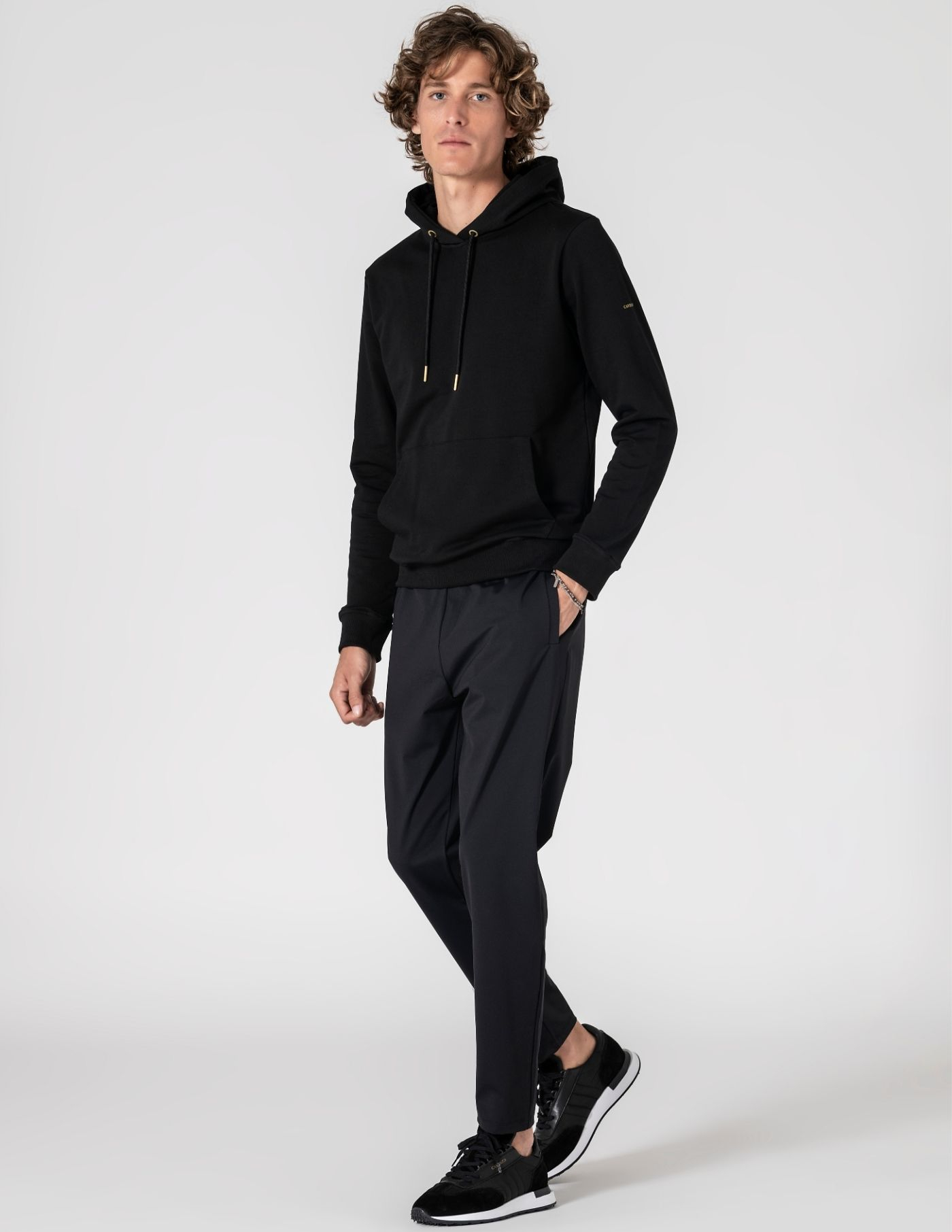 A peça essencial para um look descontraído e aconchegante. Sweat com capuz preto, confecionada em algodão e elastano, garantindo suavidade ao toque, elasticidade e conforto ao longo do dia. Totalmente lisa, com bolso frontal, fácil de combinar com sobretudo ou casaco de penas nos dias mais frios.