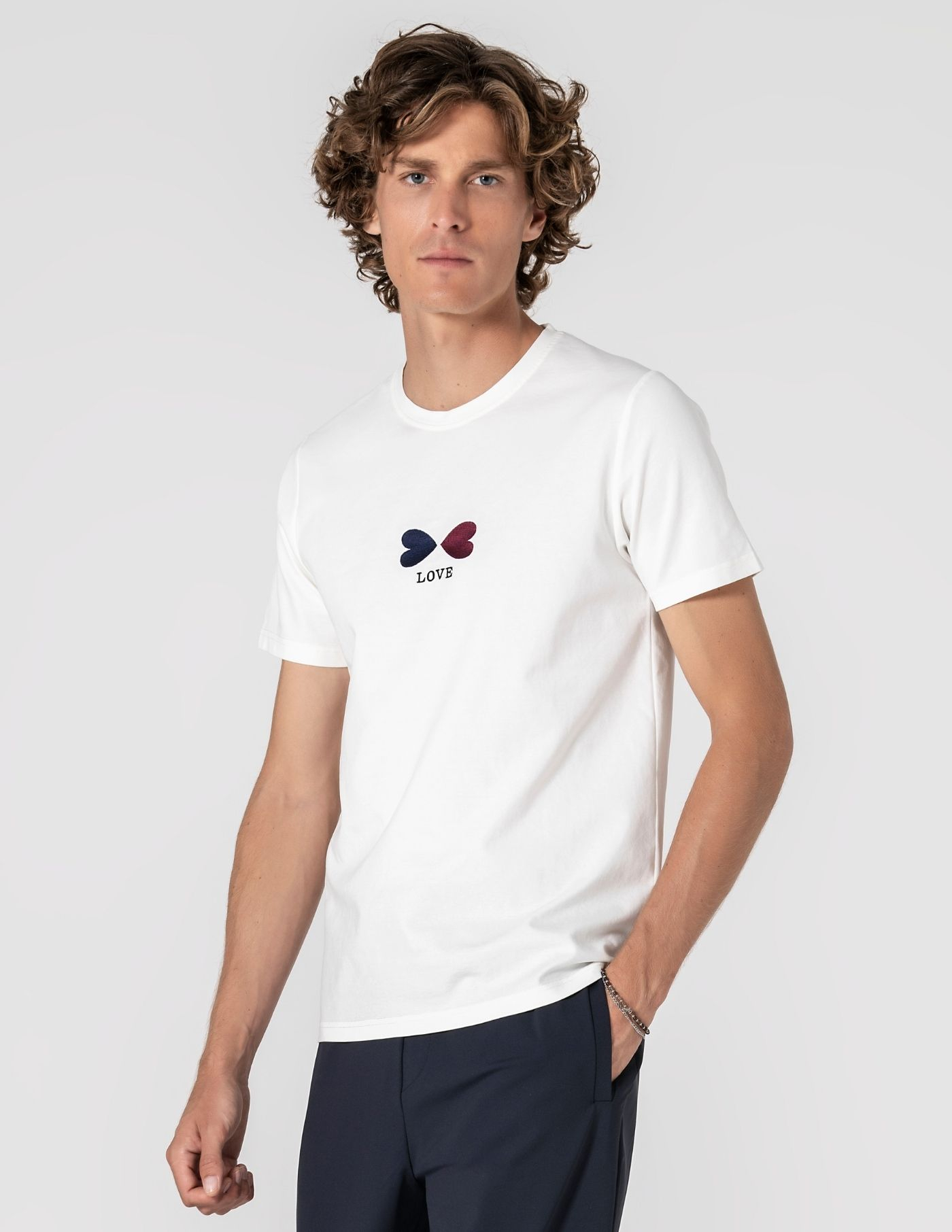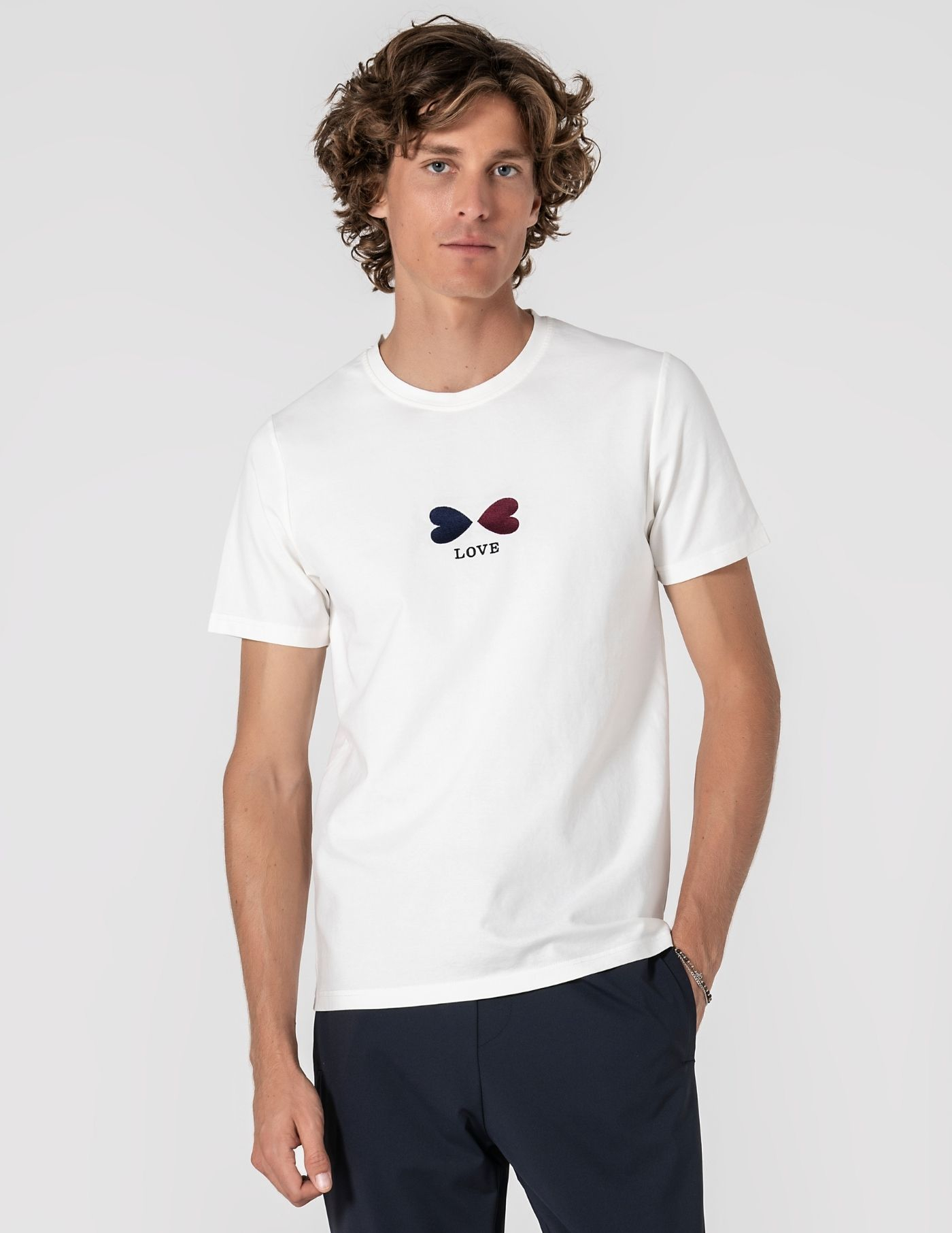 Detalhes: Costura "LOVE" (azul e vermelho)