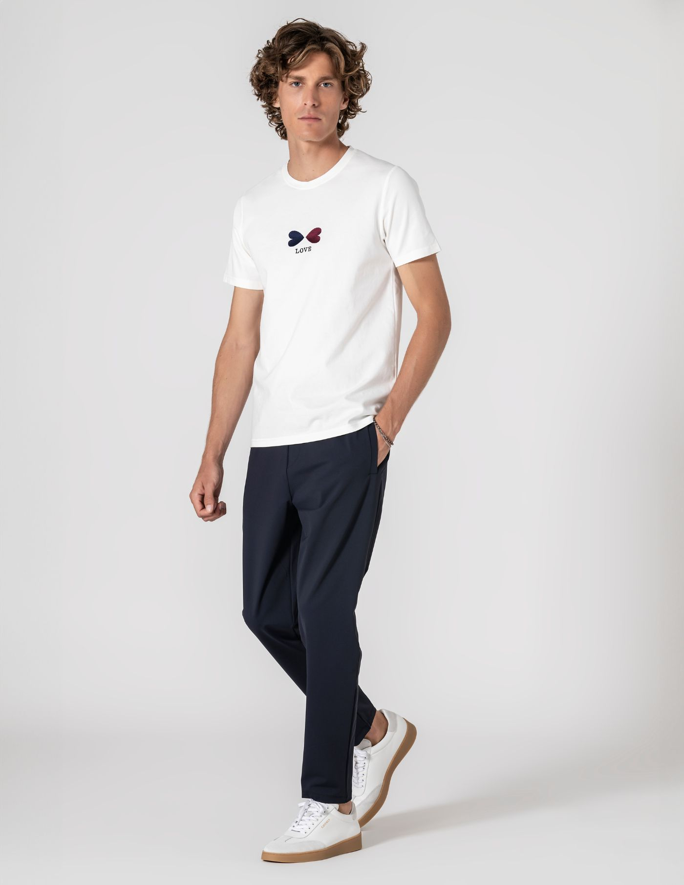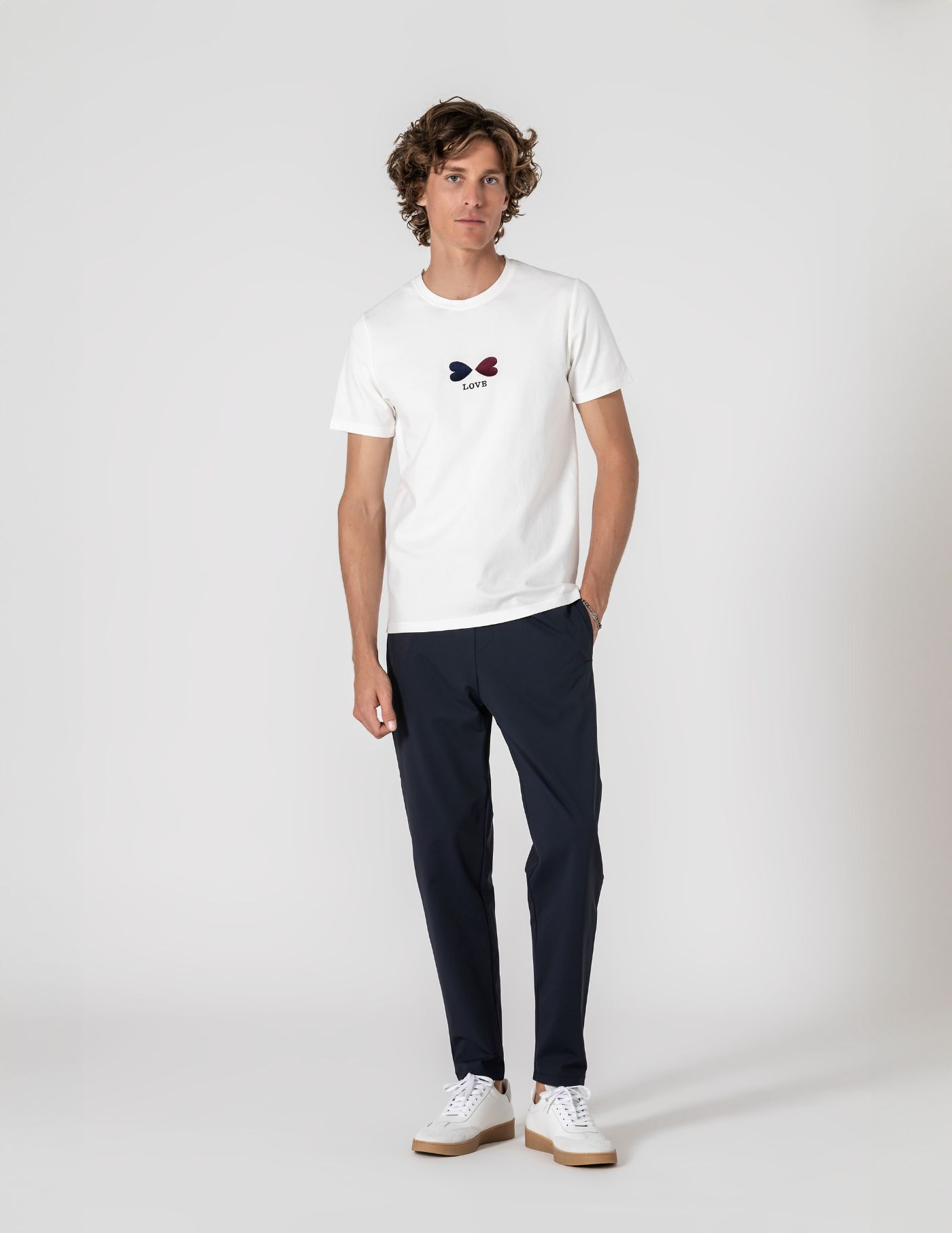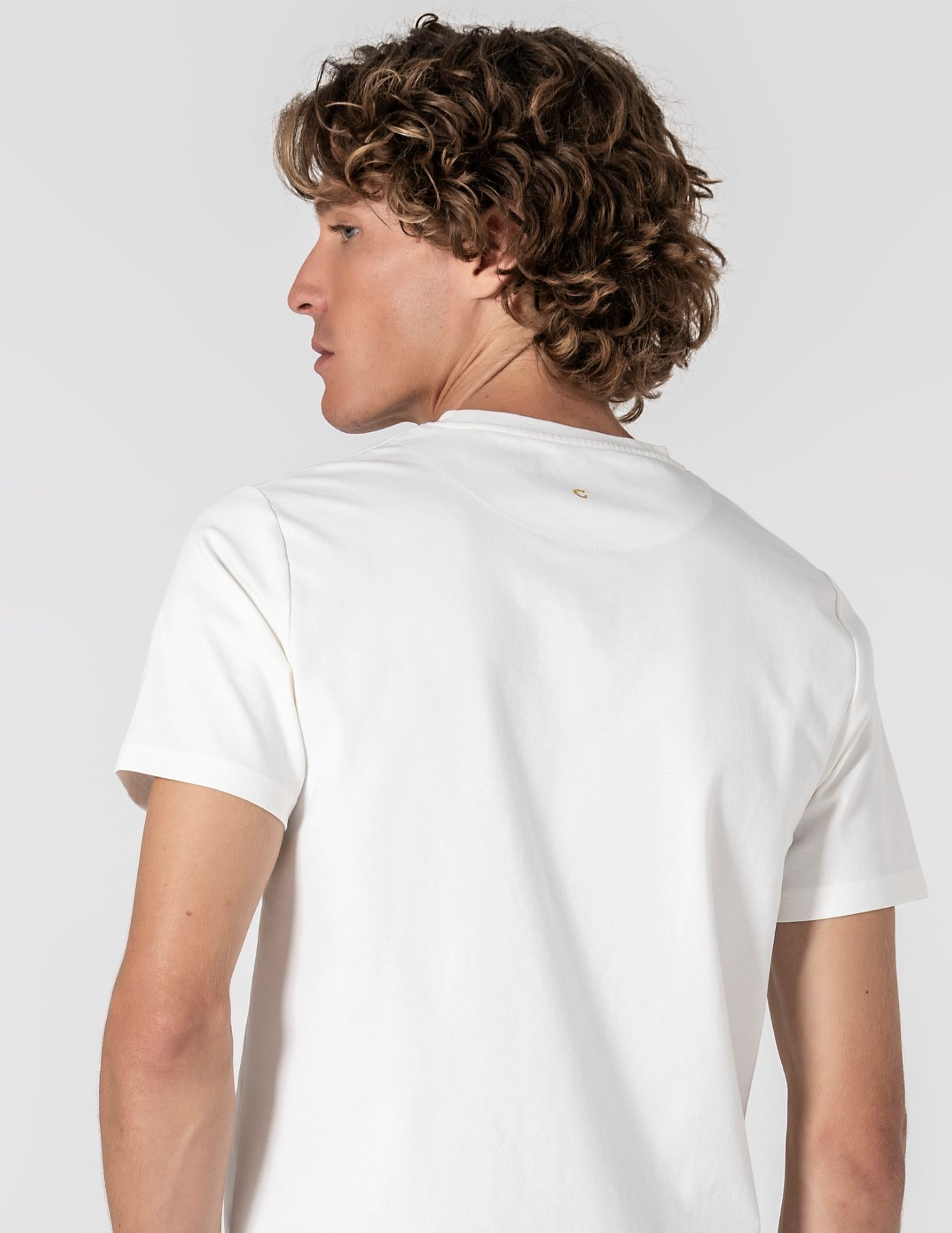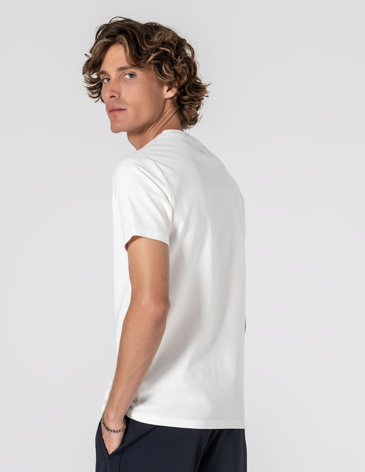 T-shirt branca de decote redondo e manga curta. Produzida numa malha de algodão, poliamida e elastano para garantir máximo conforto, liberdade de movimentos e durabilidade de cor após as lavagens. A matéria-prima é leve e fresca e o toque suave transmite a elegância necessária para o dia a dia. O detalhe costurado na frente acrescenta um apontamento discreto e elegante.