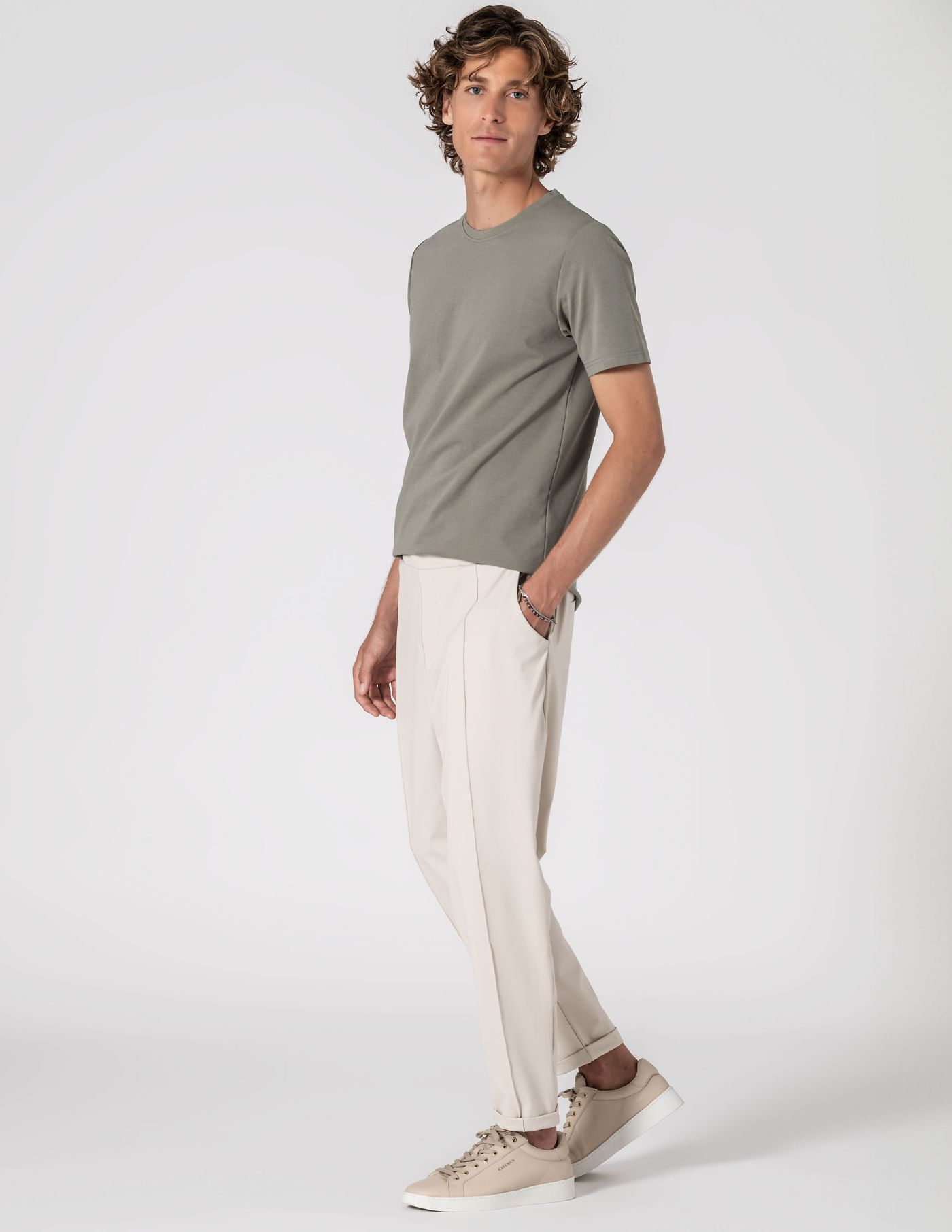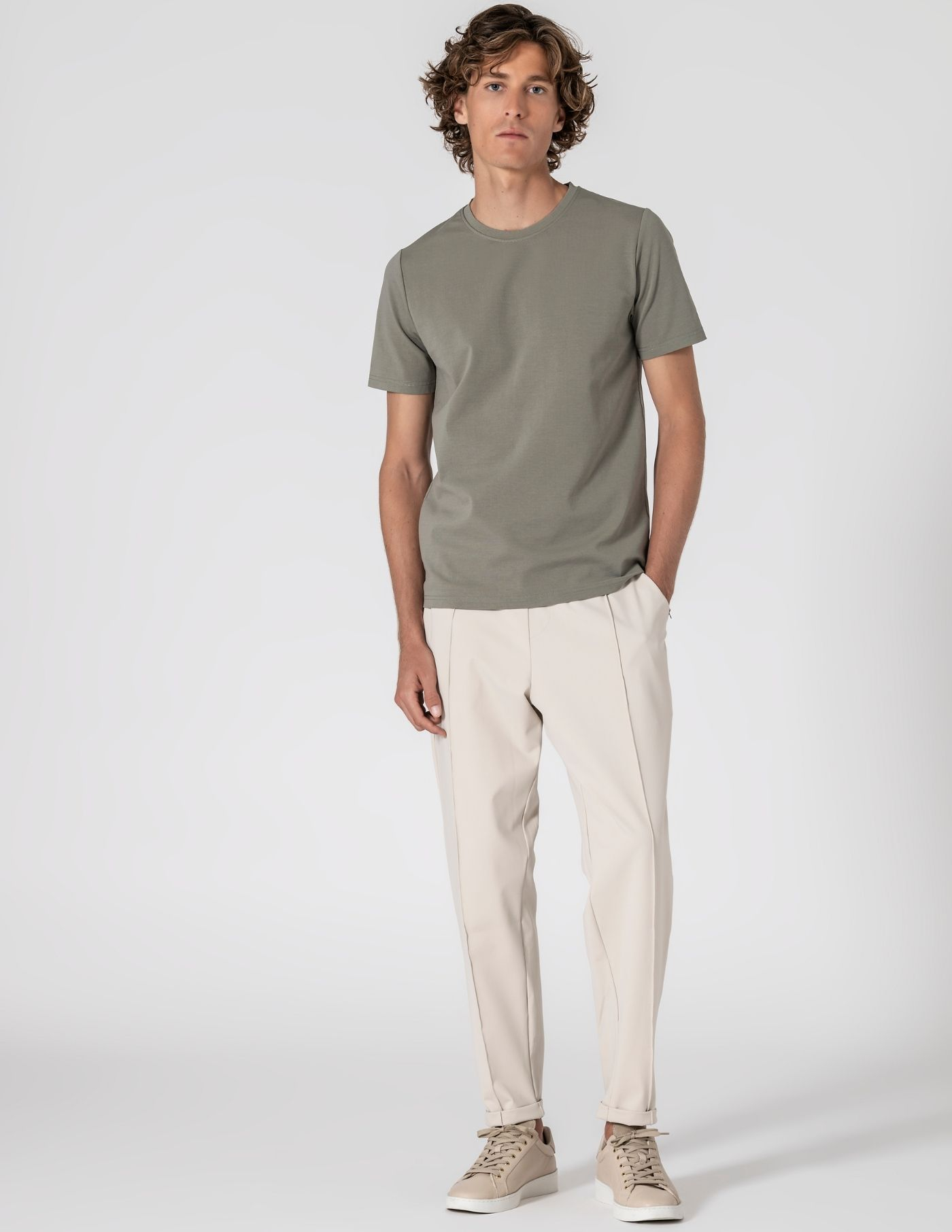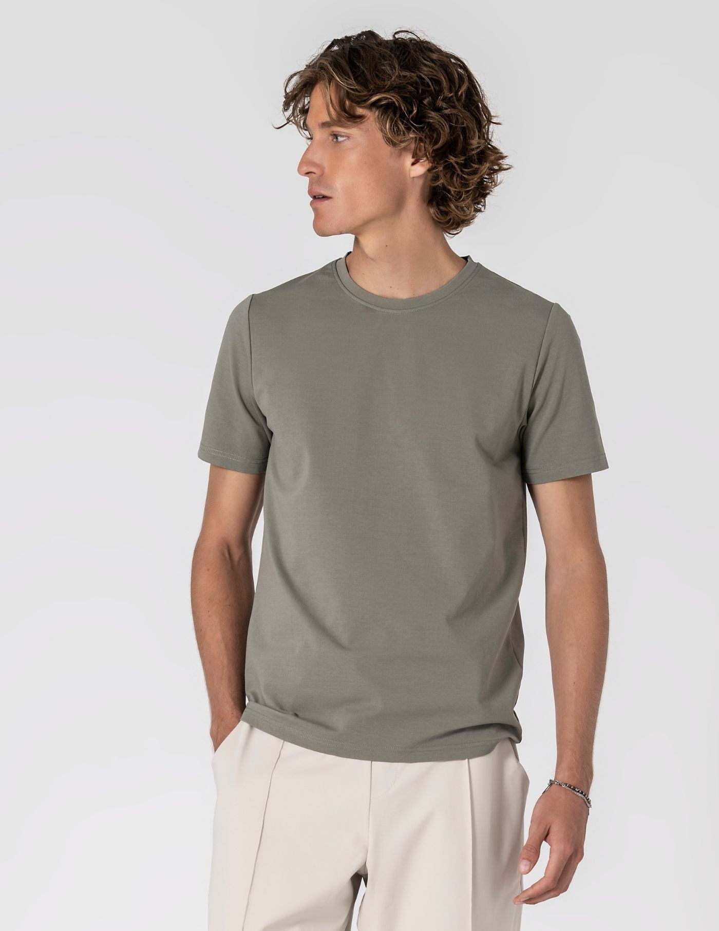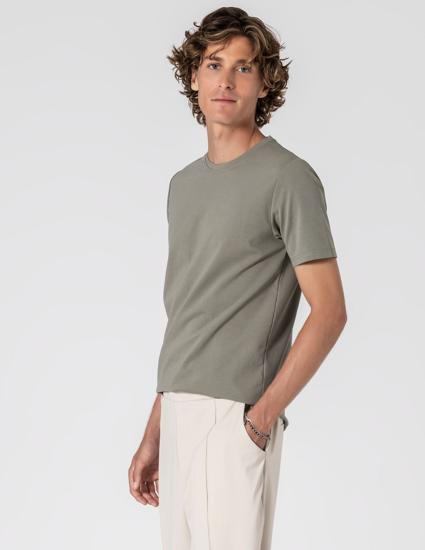 T-shirt de algodão e poliamida verde pastel, decote redondo e manga curta. Construída numa malha técnica que combina algodão, poliamida e elastano, unindo conforto, respirabilidade e uma elasticidade discreta. Toque suave e liberdade de movimentos. Fácil de conjugar com uma parka ou para usar por baixo de uma camisa.