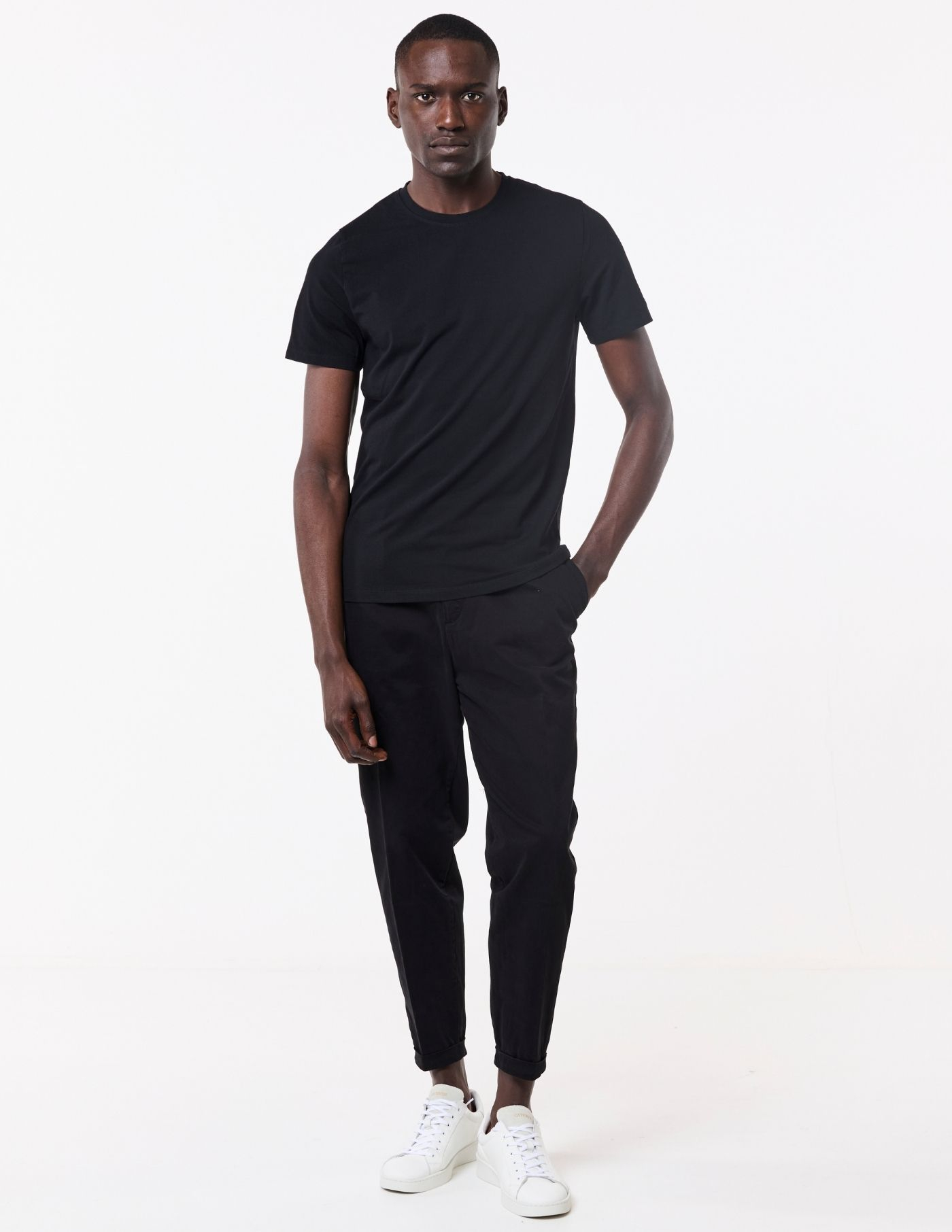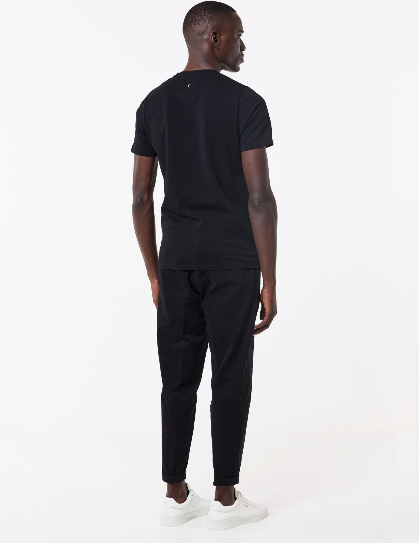 T-shirt preta lisa, produzida com uma mistura de algodão e elastano,que garante máximo conforto, liberdade de movimentos, e durabilidade de cor após as lavagens. A matéria prima é leve e fresca, contém alguma elasticidade e o seu toque suave transmite a elegância necessária para o teu dia a dia.
