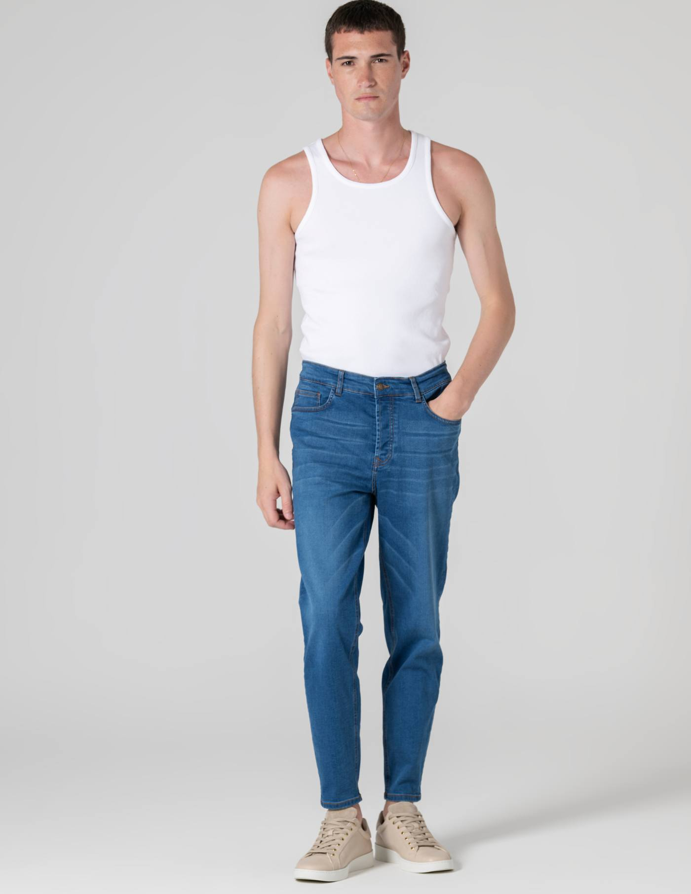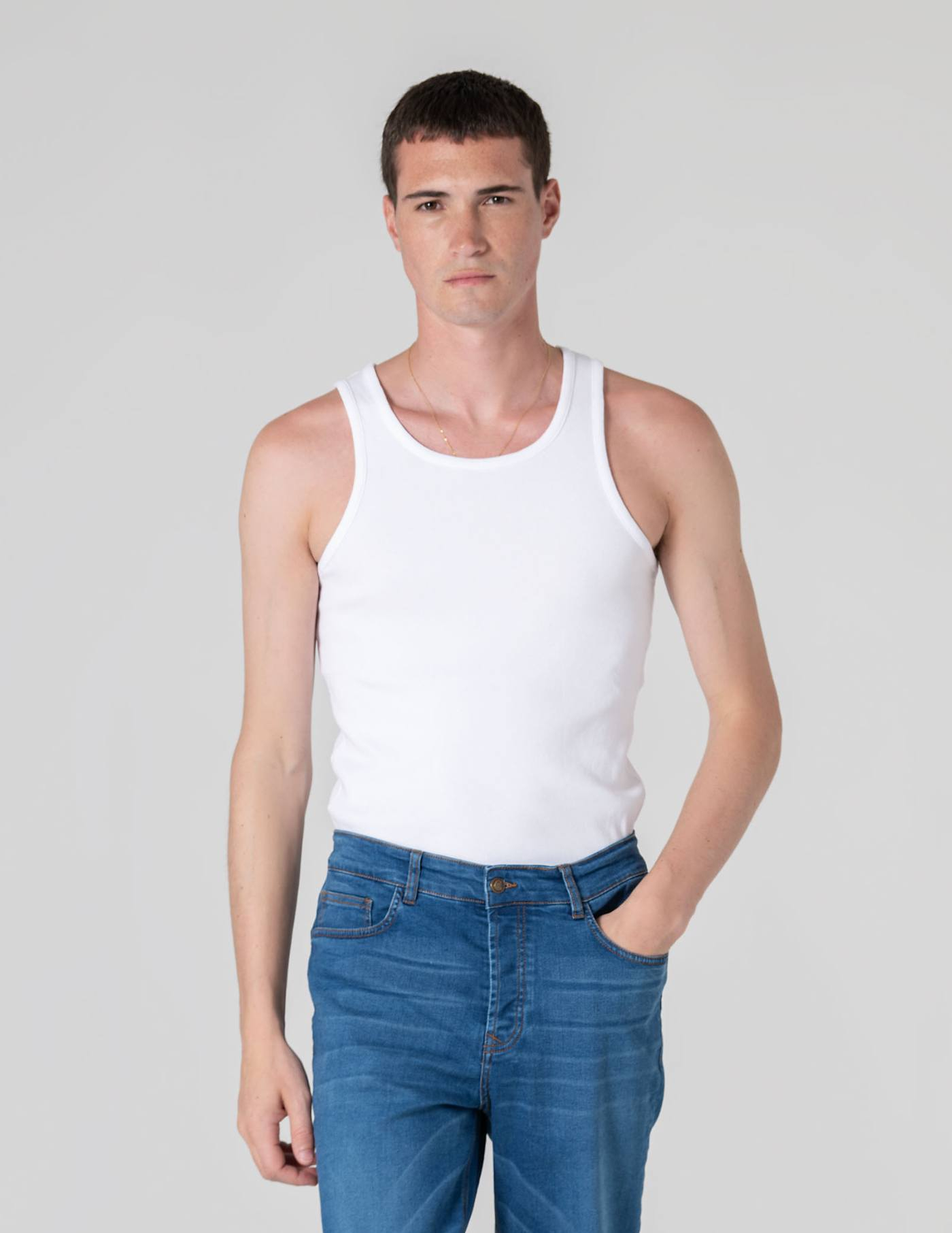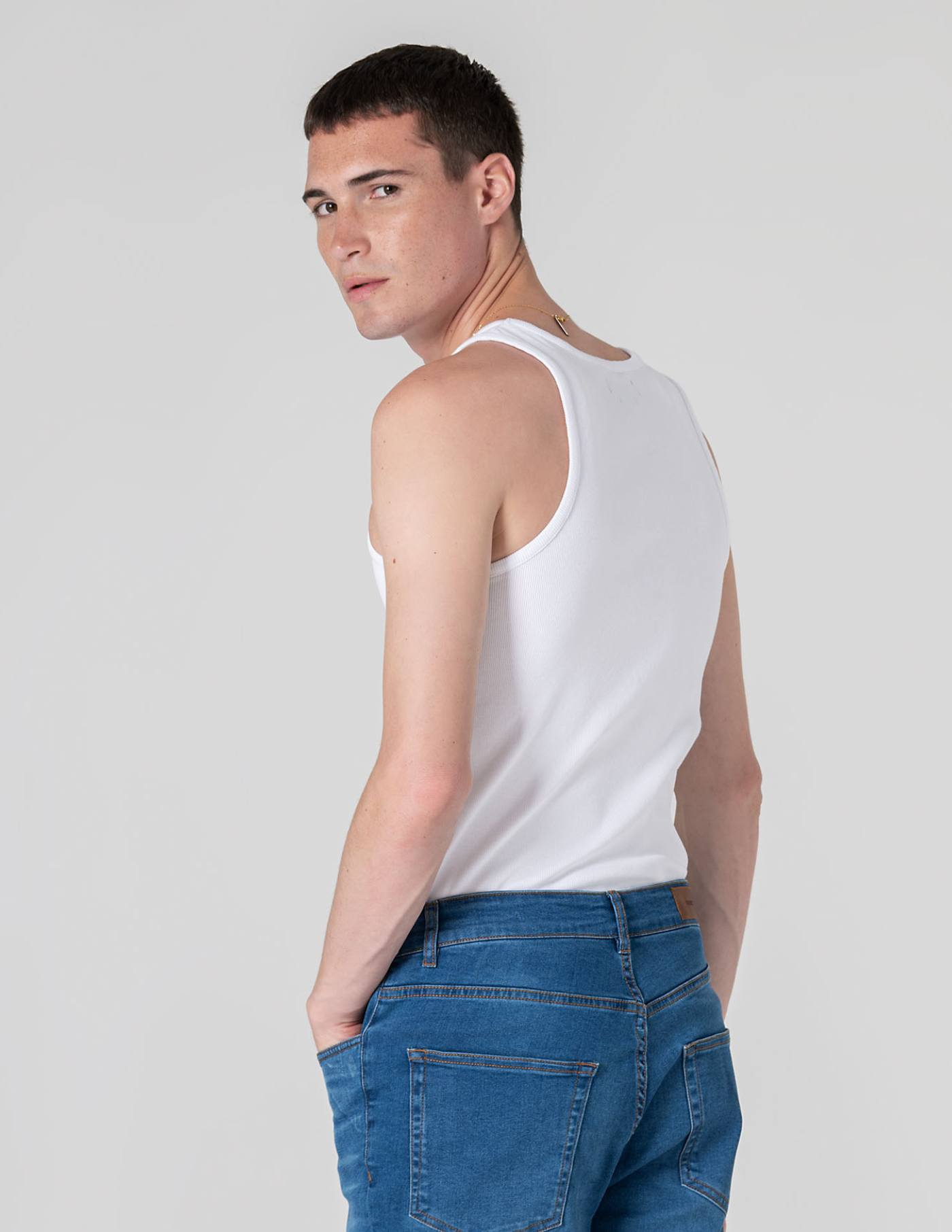 A t-shirt sem mangas com malha canelada reforça uma silhueta descontraída. É um ótimo ponto de partida para looks de verão casuais.