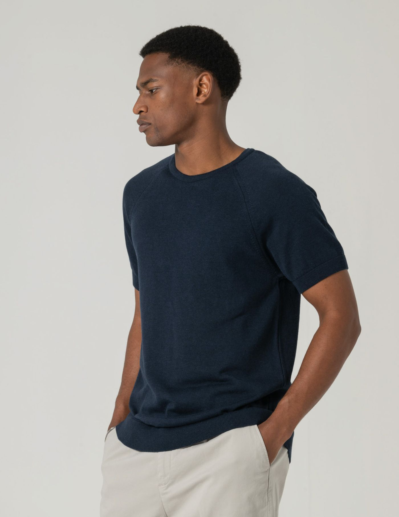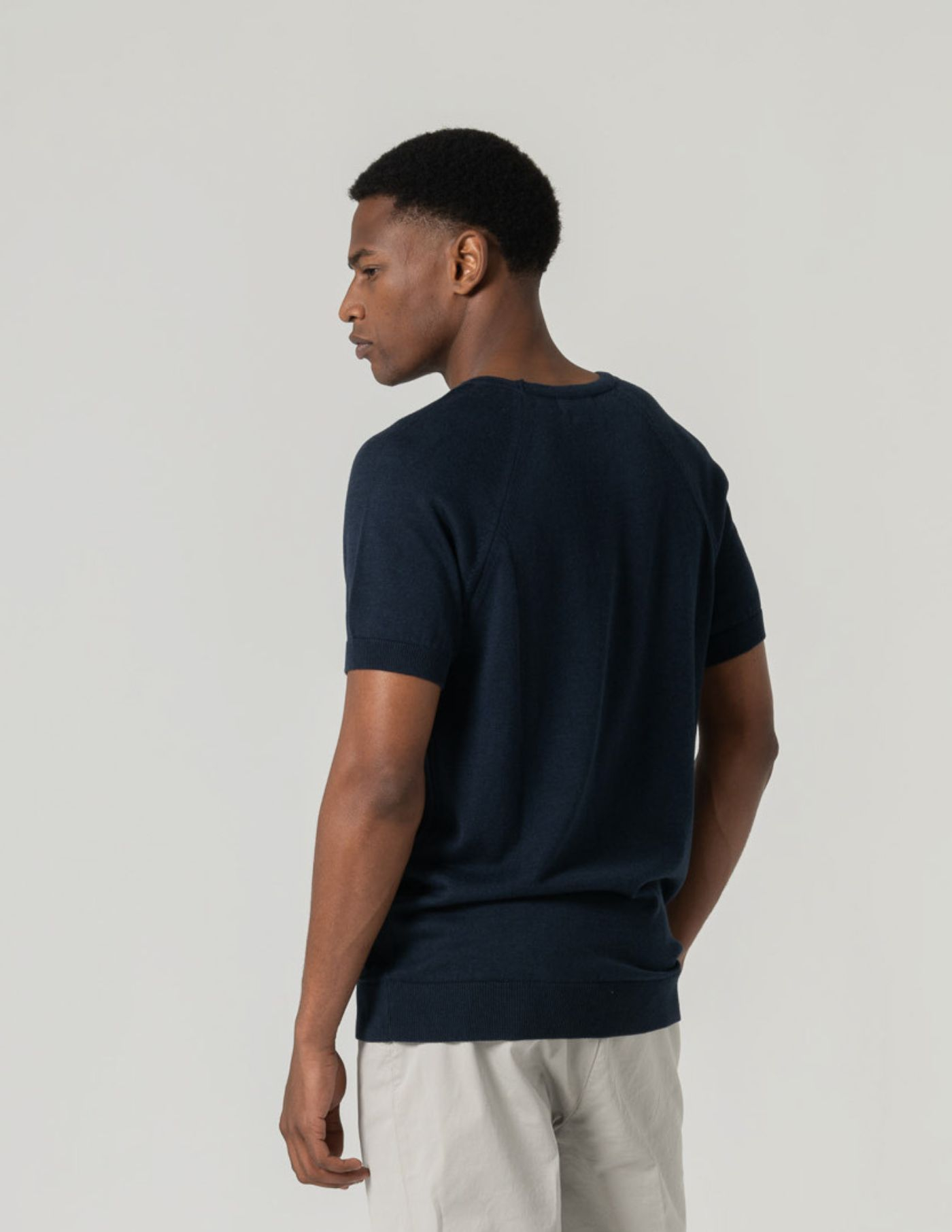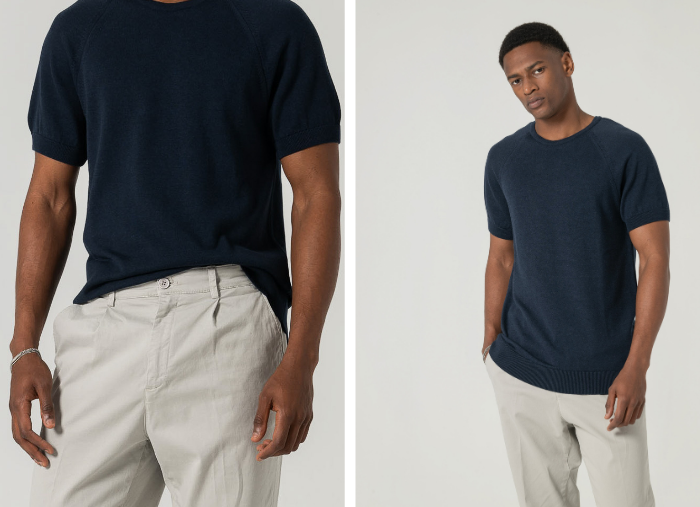 T-shirt em tricot com mistura de liocel e algodão, uma combinação que eleva o conforto térmico e a fluidez do tecido.