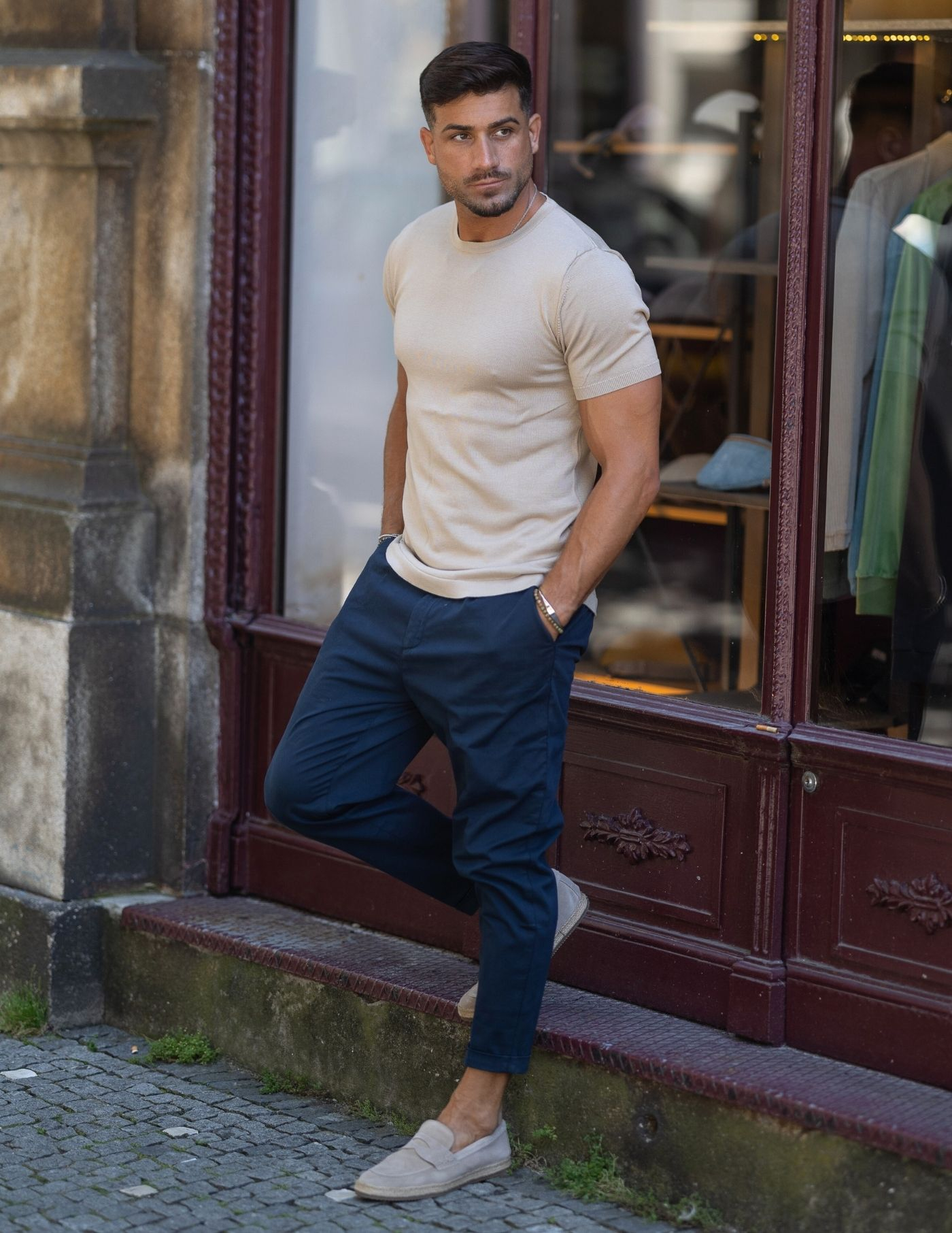T-shirt em tricot produzida 100% em algodão para garantir máximo conforto e leveza. A matéria prima garante frescura, sendo ideal para os dias mais quentes, e a textura transmite elegância. A peça é slim fit, lisa e de cor bege.