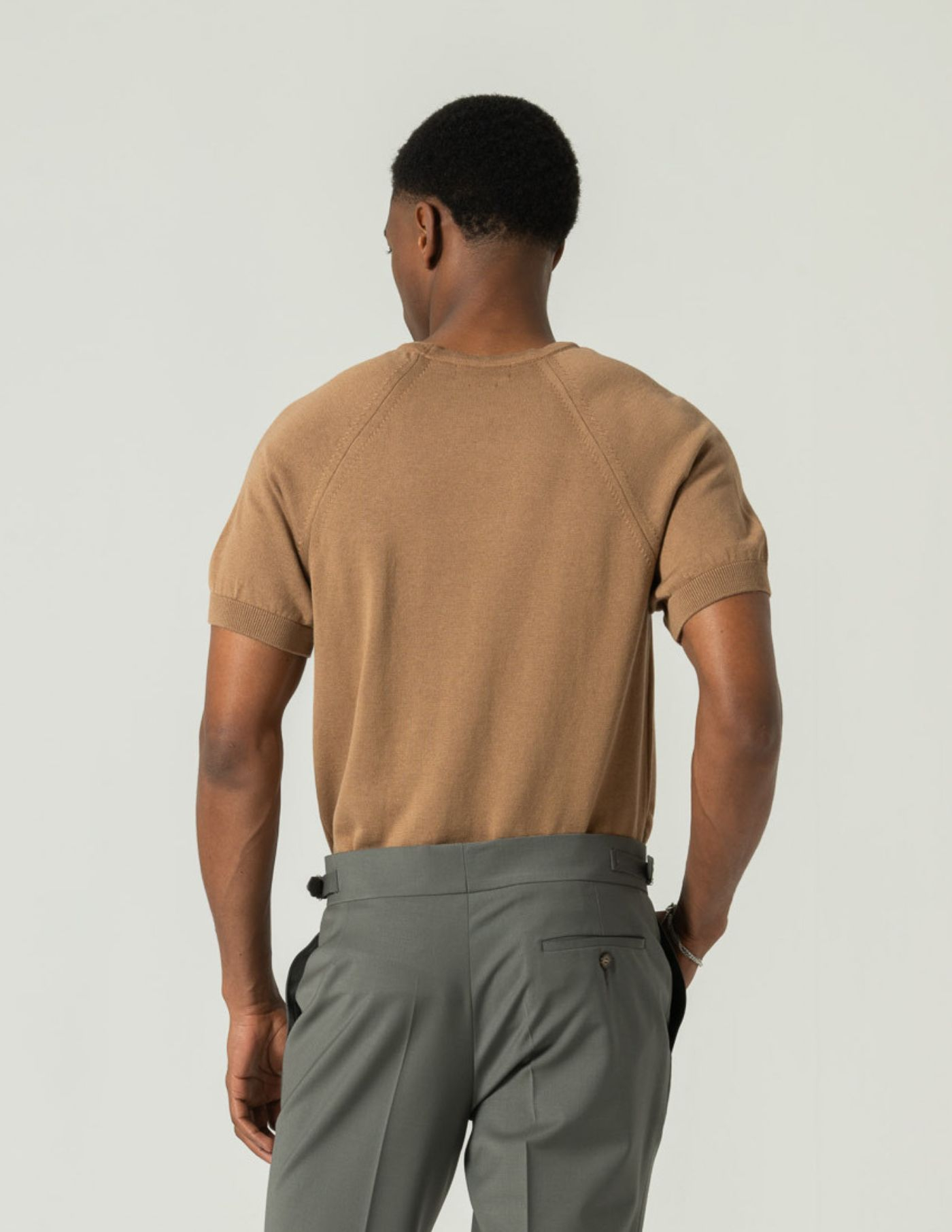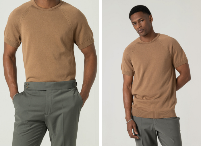 T-shirt em tricot com mistura de liocel e algodão, uma combinação que eleva o conforto térmico e a fluidez do tecido. Suave ao toque, respirável e naturalmente elegante, adapta-se aos dias quentes com discrição e sofisticação.