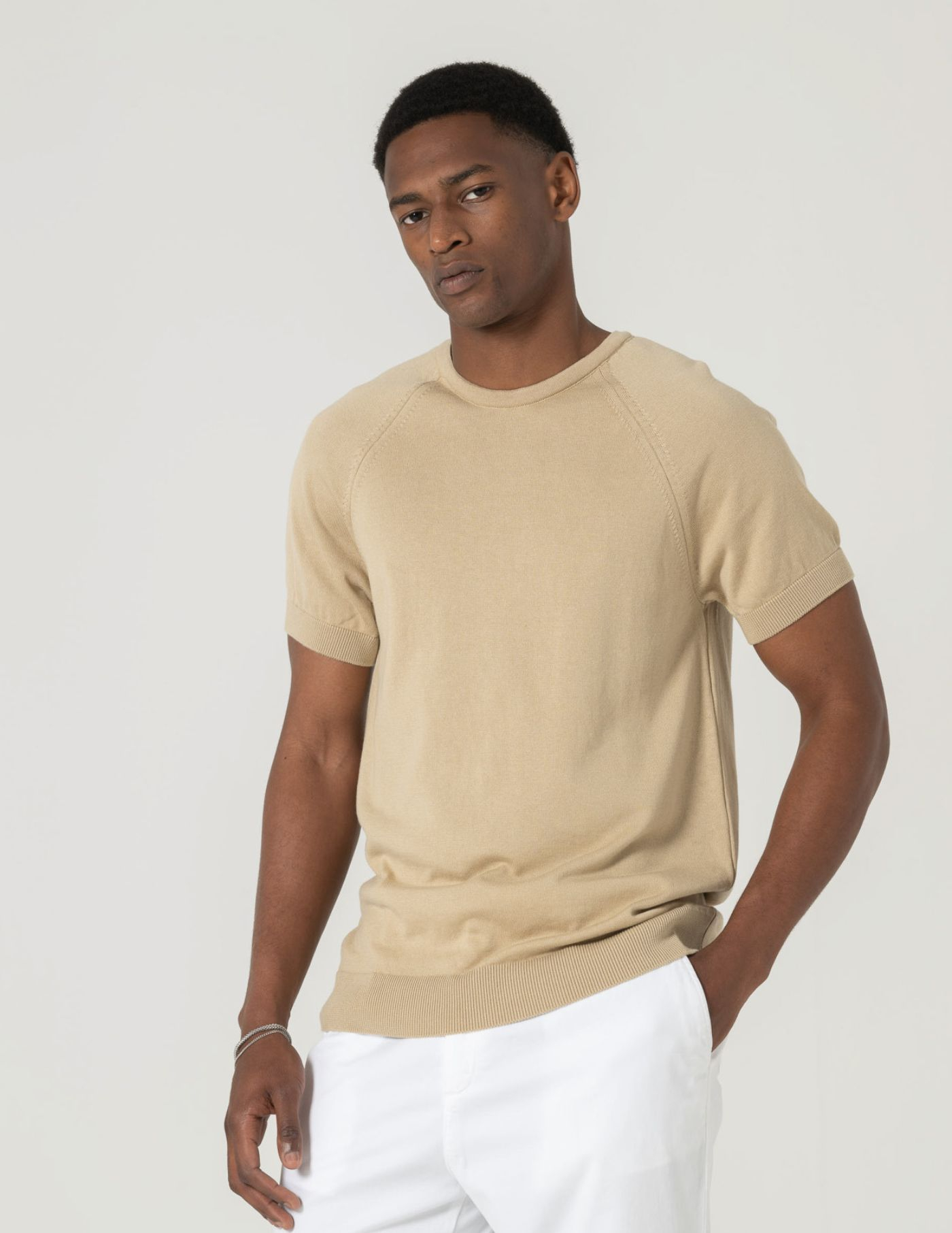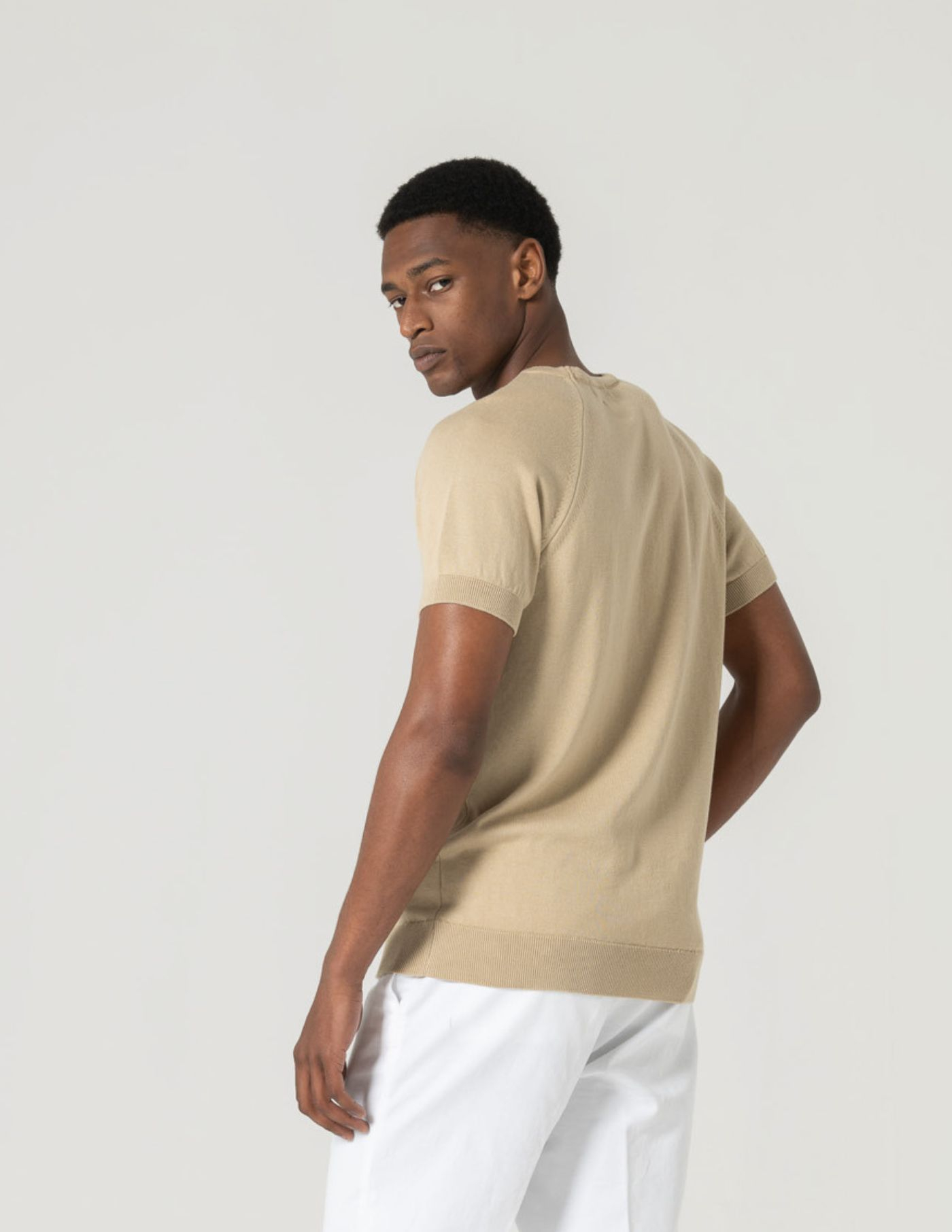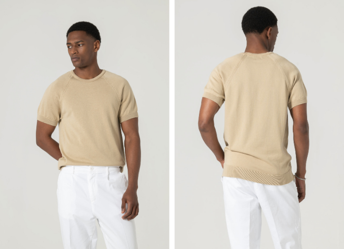 T-shirt em tricot com mistura de liocel e algodão, uma combinação que eleva o conforto térmico e a fluidez do tecido.
