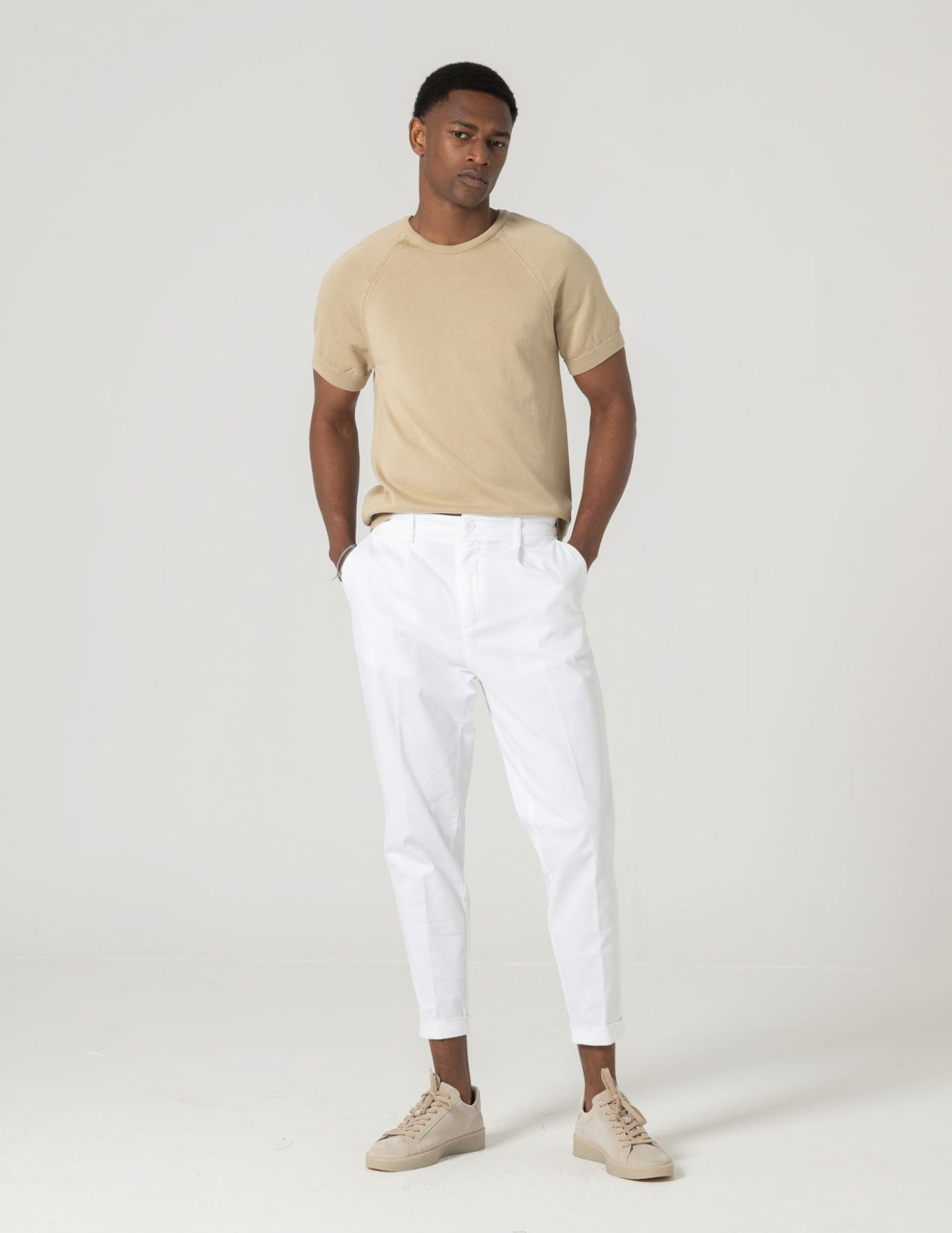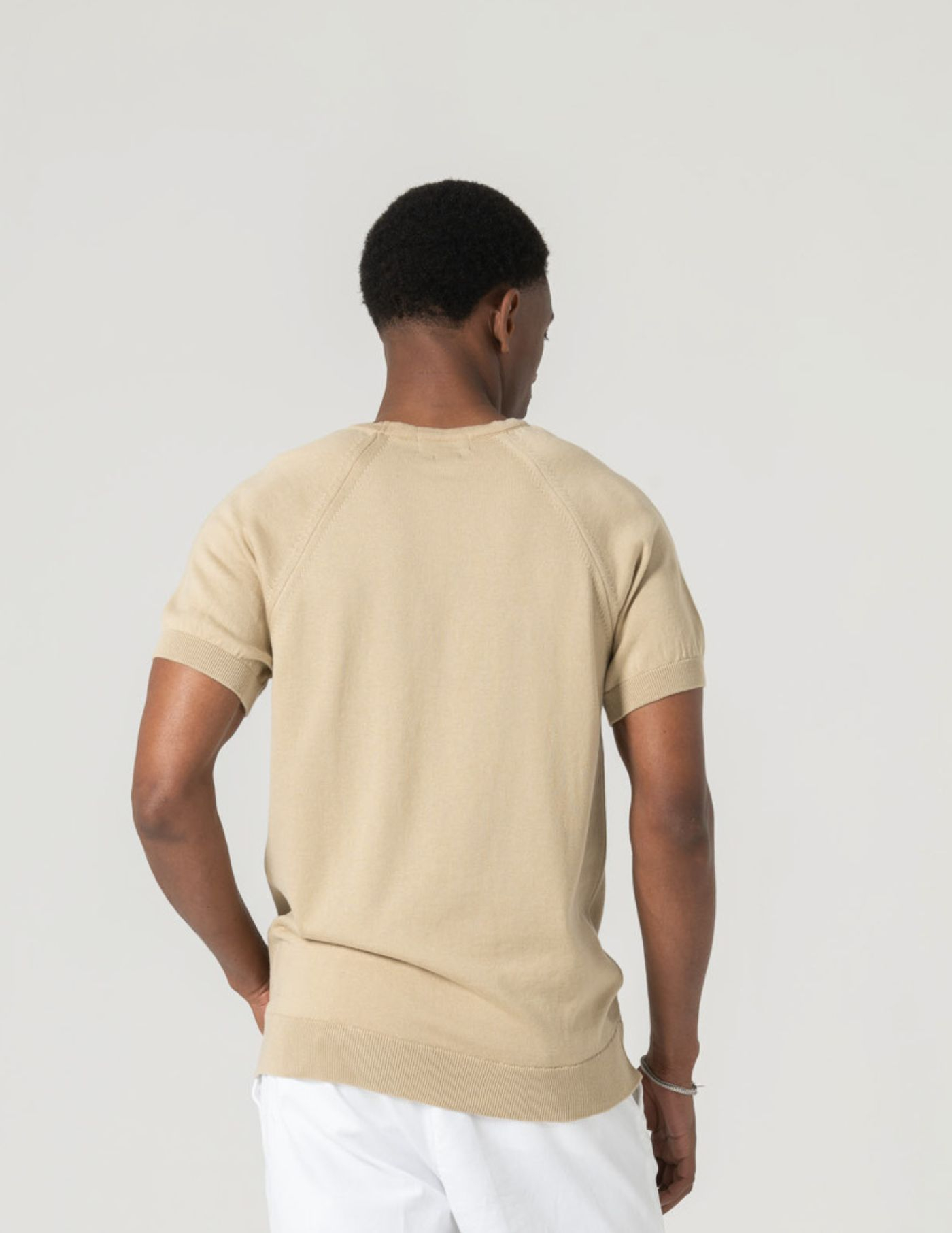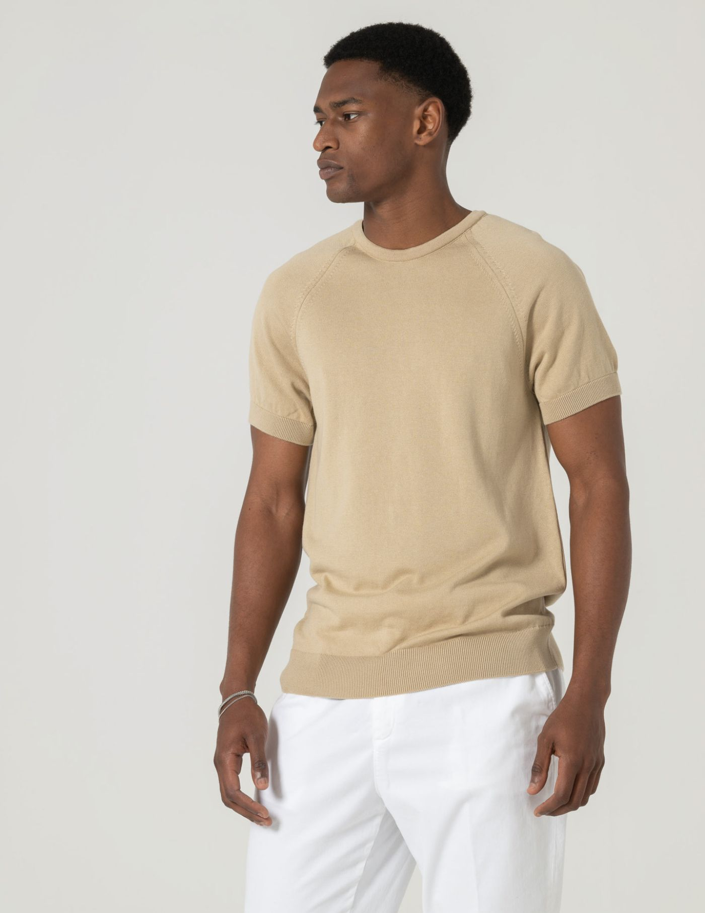 T-shirt em tricot com mistura de liocel e algodão, uma combinação que eleva o conforto térmico e a fluidez do tecido.