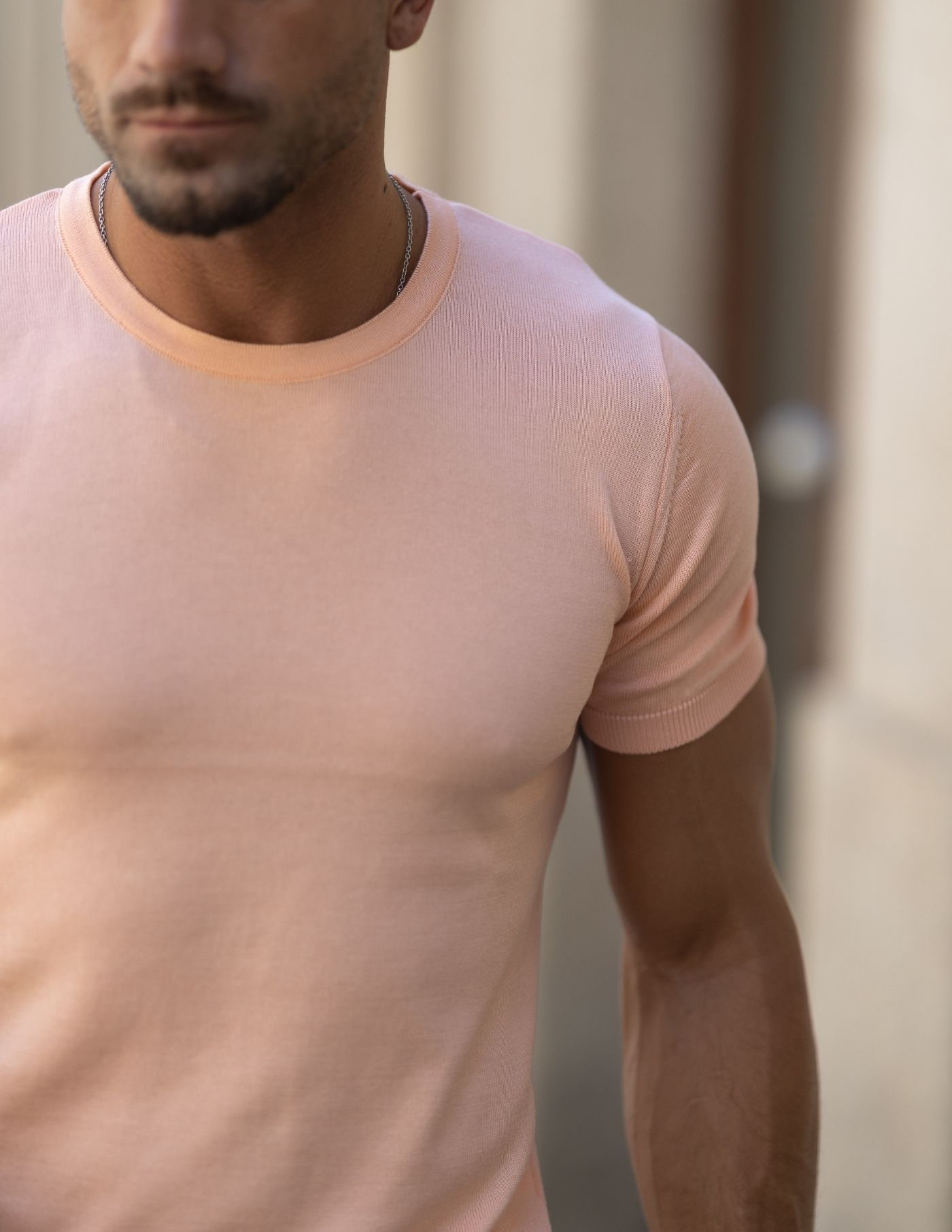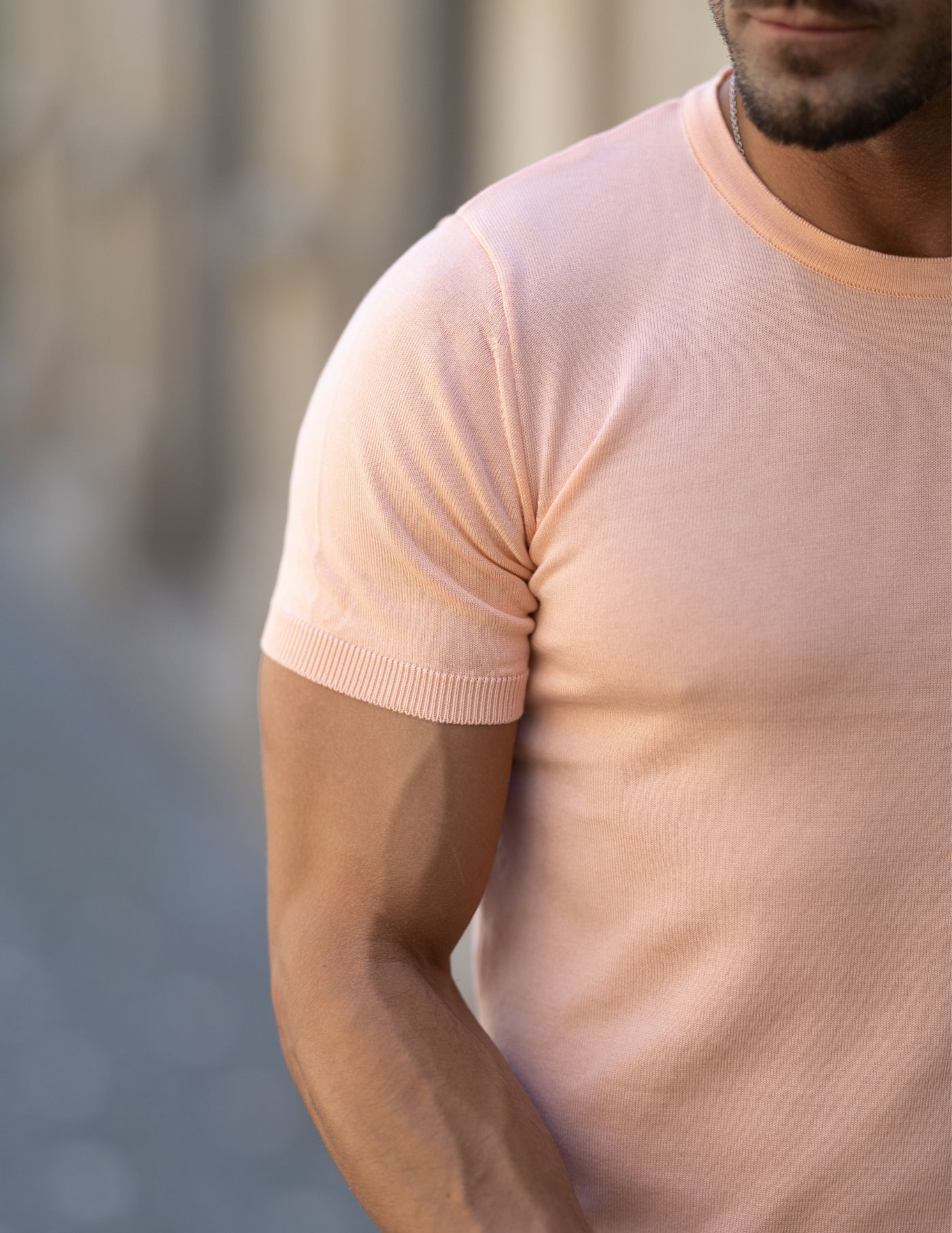 T-shirt em tricot produzida 100% em algodão para garantir máximo conforto e leveza. A matéria prima garante frescura, sendo ideal para os dias mais quentes, e a textura transmite elegância. A peça é slim fit, lisa e de cor pêssego.