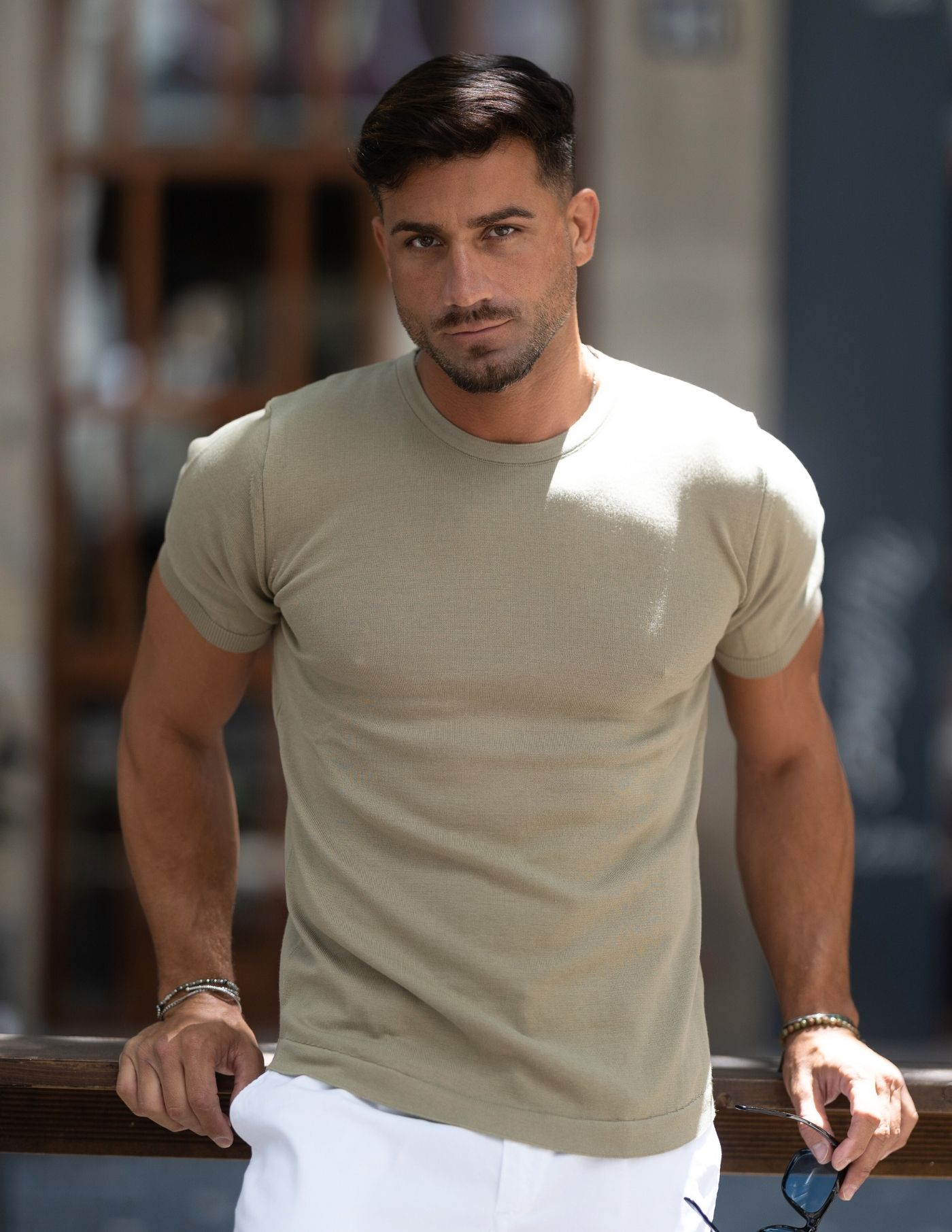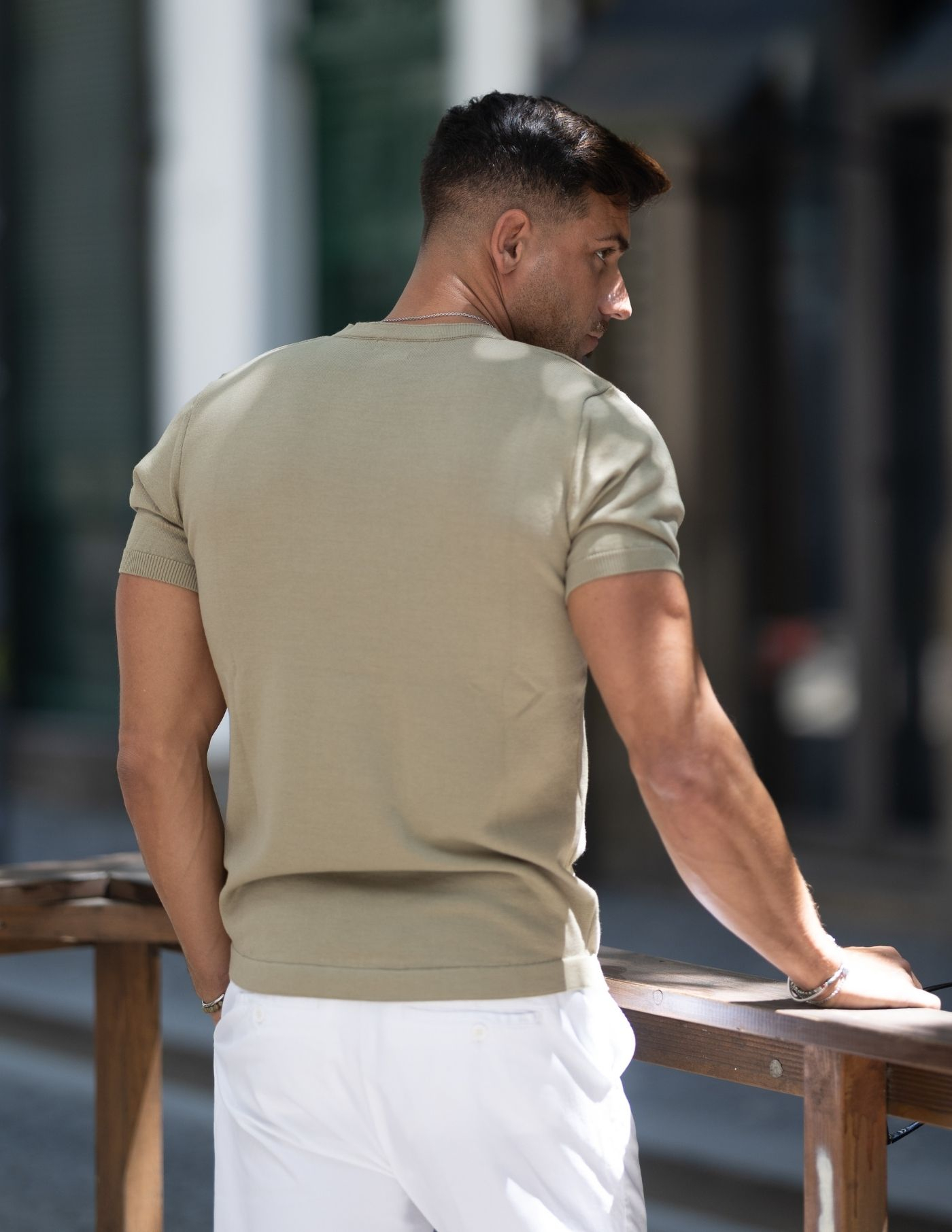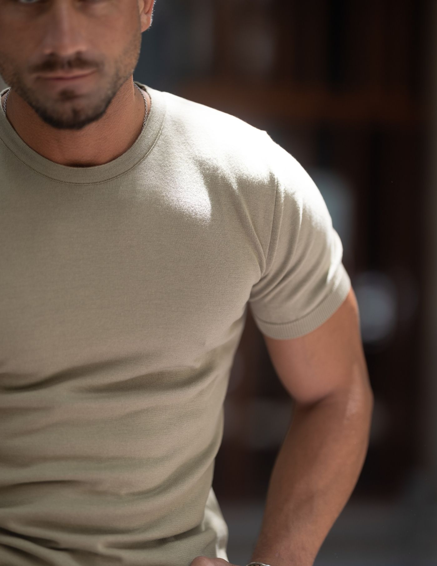 T-shirt em tricot produzida 100% em algodão para garantir máximo conforto e leveza. A matéria prima garante frescura, sendo ideal para os dias mais quentes, e a textura transmite elegância. A peça é slim fit, lisa e de cor verde.